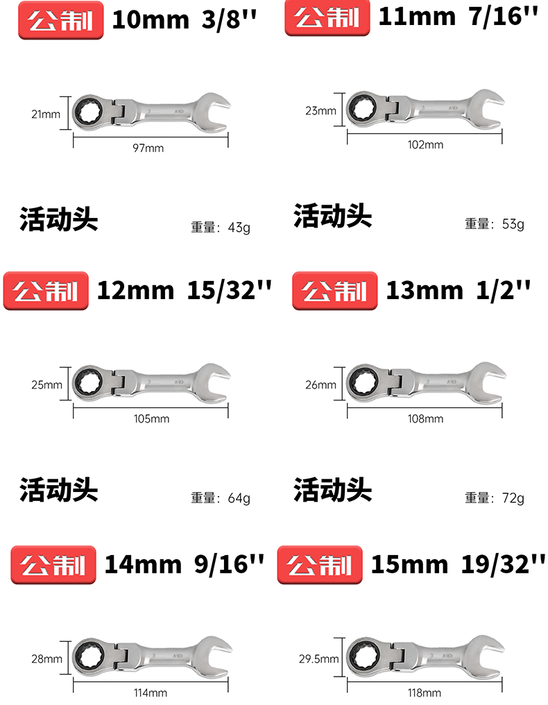 • 미터법 짧은 핸들 13mm 이동식 헤드