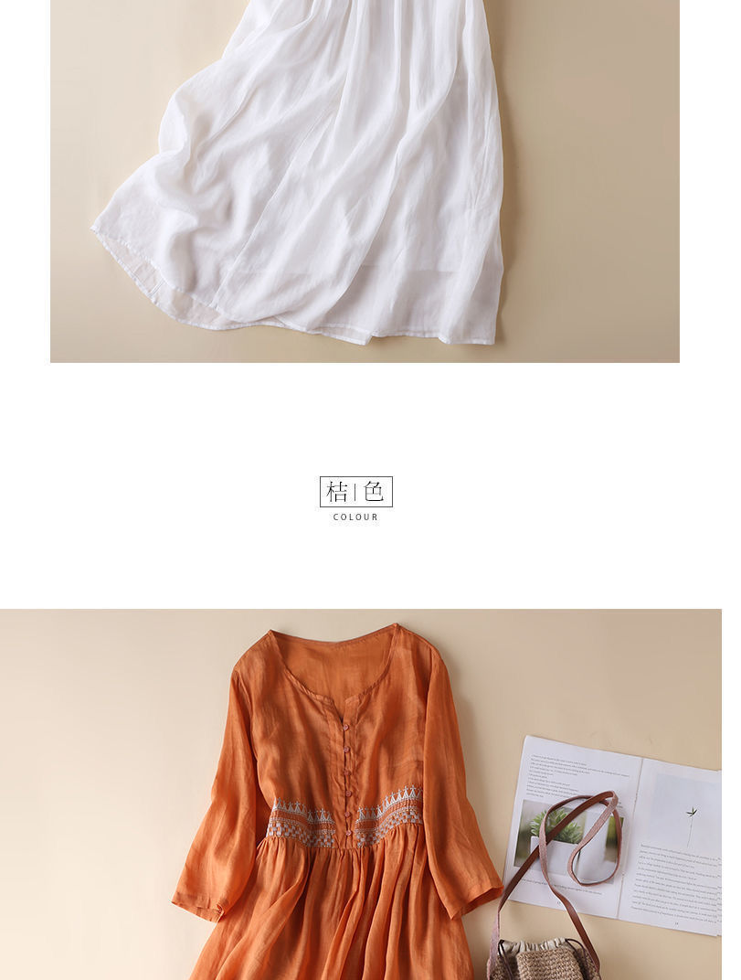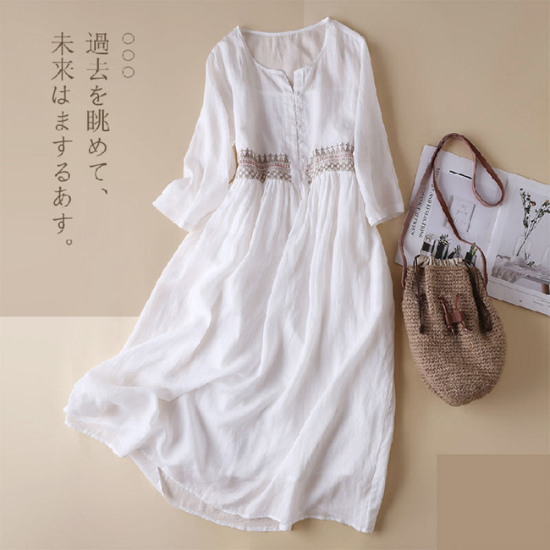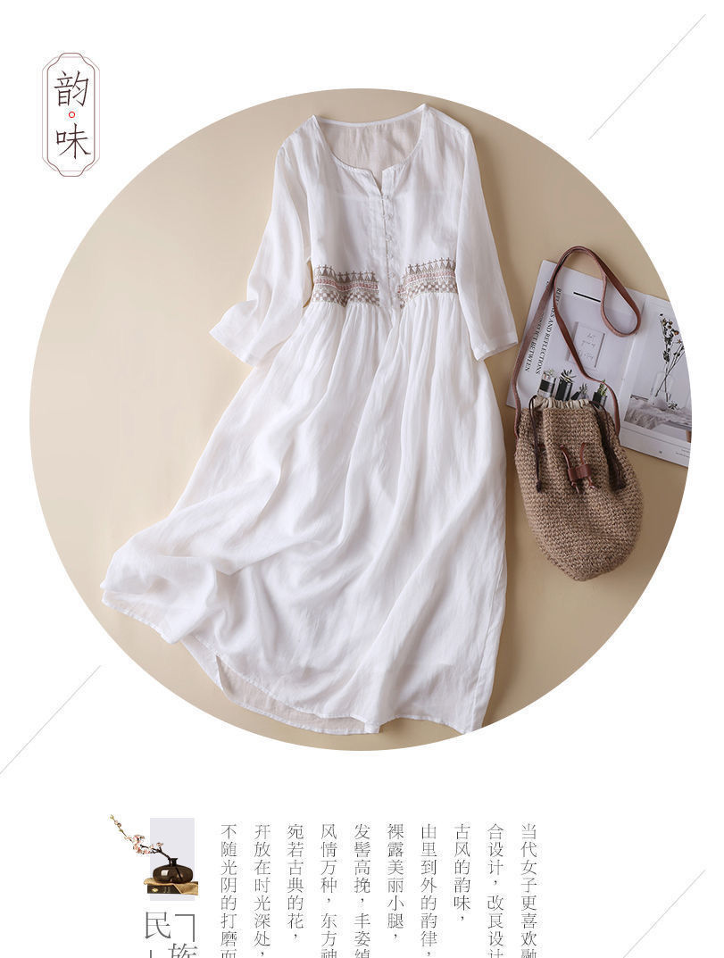 2024 면 및 리넨 민족 자수 자수 원피스 예술적 기질 둥근 목 9 점 소매 중간 길이 스커트
