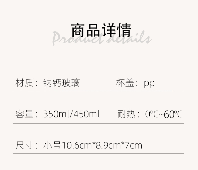 材质说明:杯身钠钙玻璃,盖子pp塑料,勺子不锈钢。