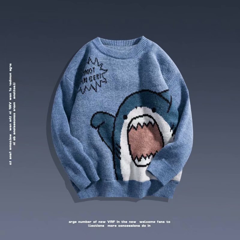 가을과 겨울 일본 스타일 만화 상어 크루 넥 스웨터 커플 남성 유행 브랜드 느슨한 한국 스타일 니트 스웨터 홍콩 스타일