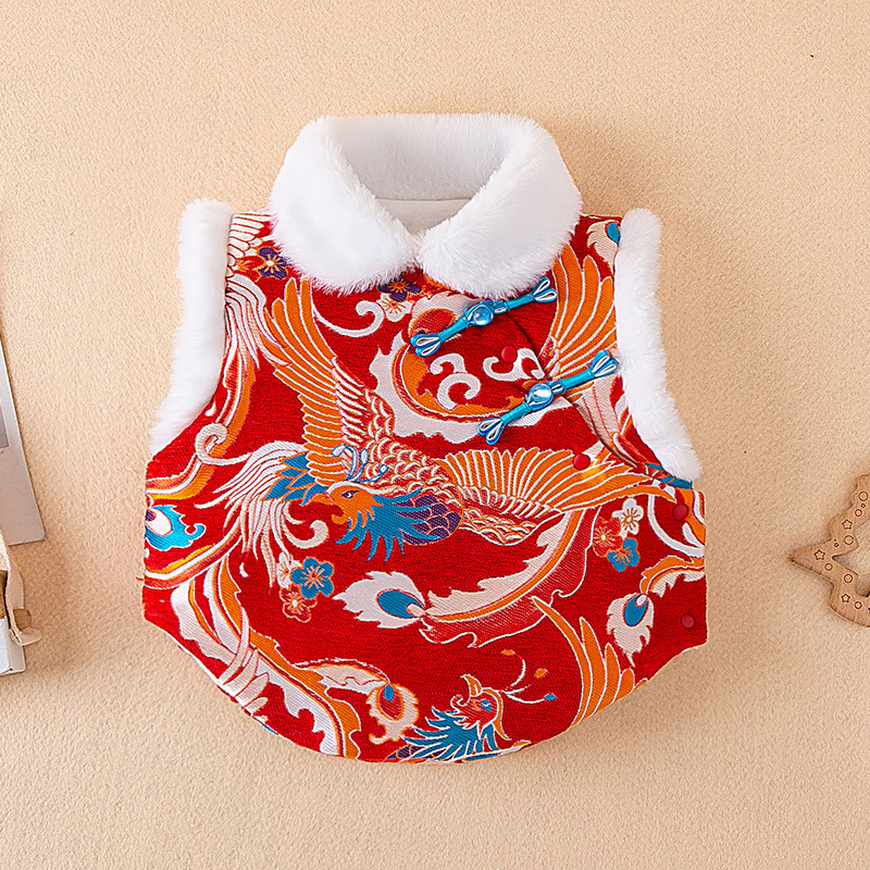 중국 스타일의 새로운 중국 스타일 조끼 어린이 두꺼운 따뜻한 기모 허리 코트 겨울 축제 민소매 신년 옷 면 조끼