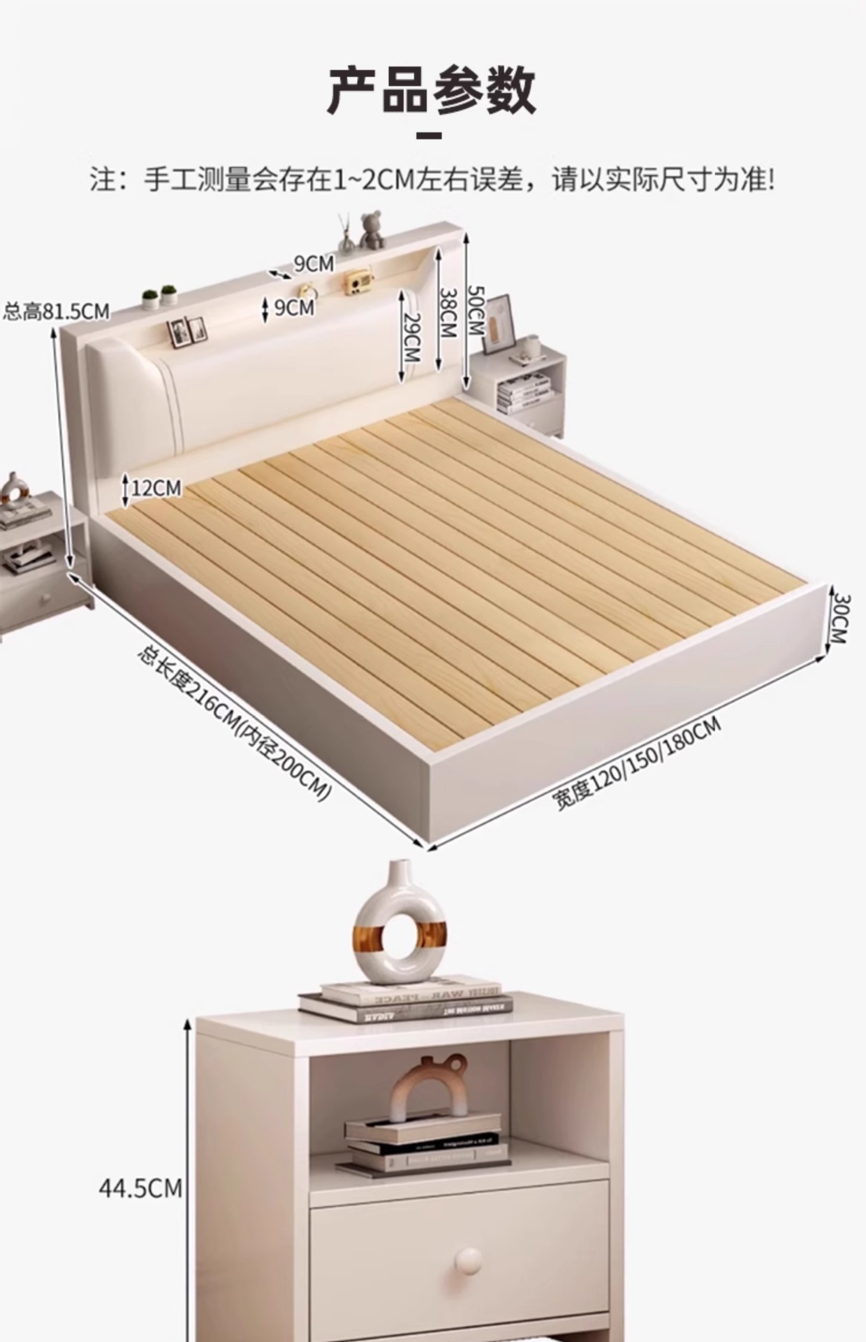 • (풀베드모델) 웜화이트 싱글침대 + 5cm 매트리스 + 침대협탁 * 2 [위층배송]