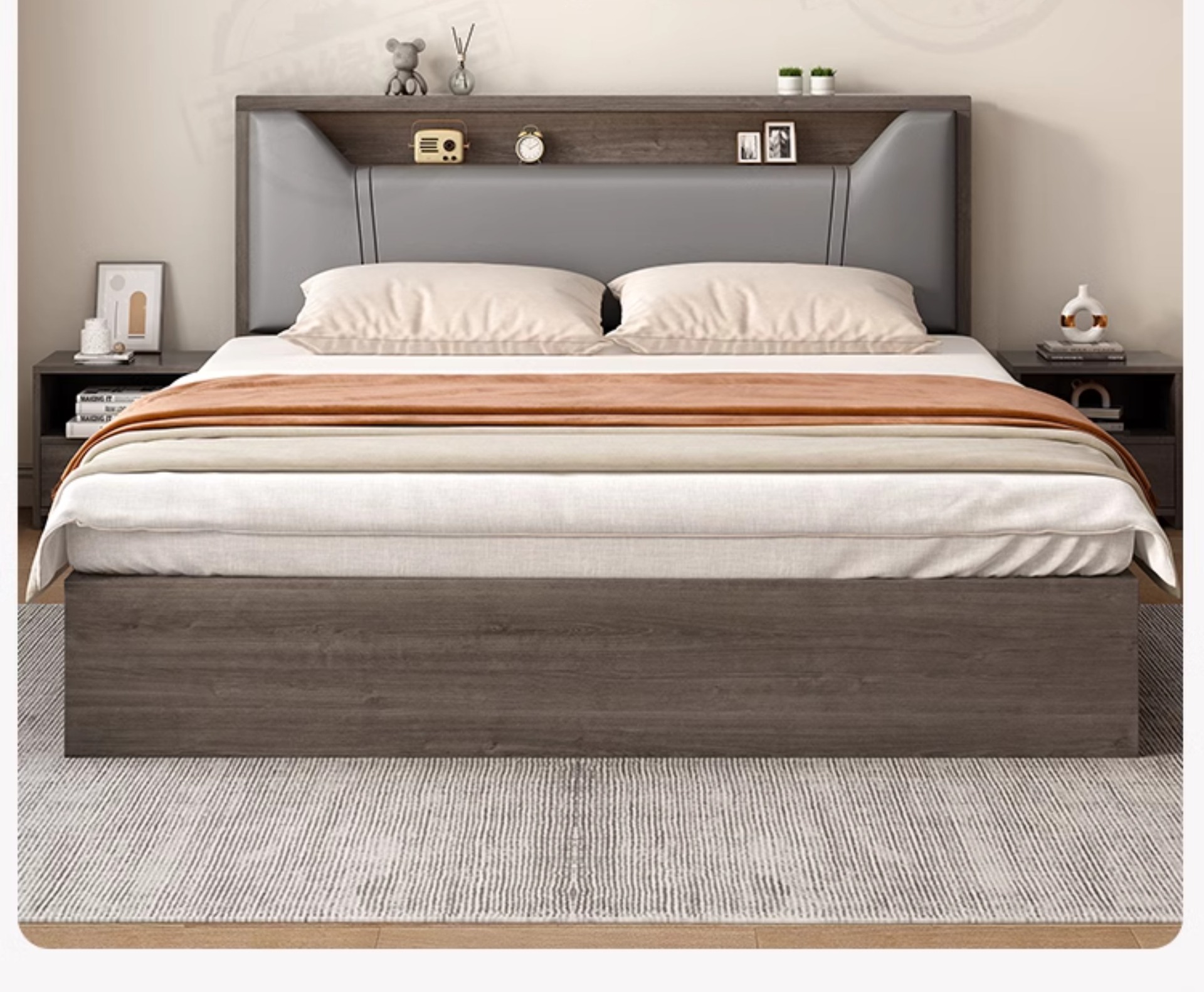 • (풀베드모델) 그레이오크 싱글침대 + 5cm 매트리스 + 침대협탁 * 2 [위층배송]