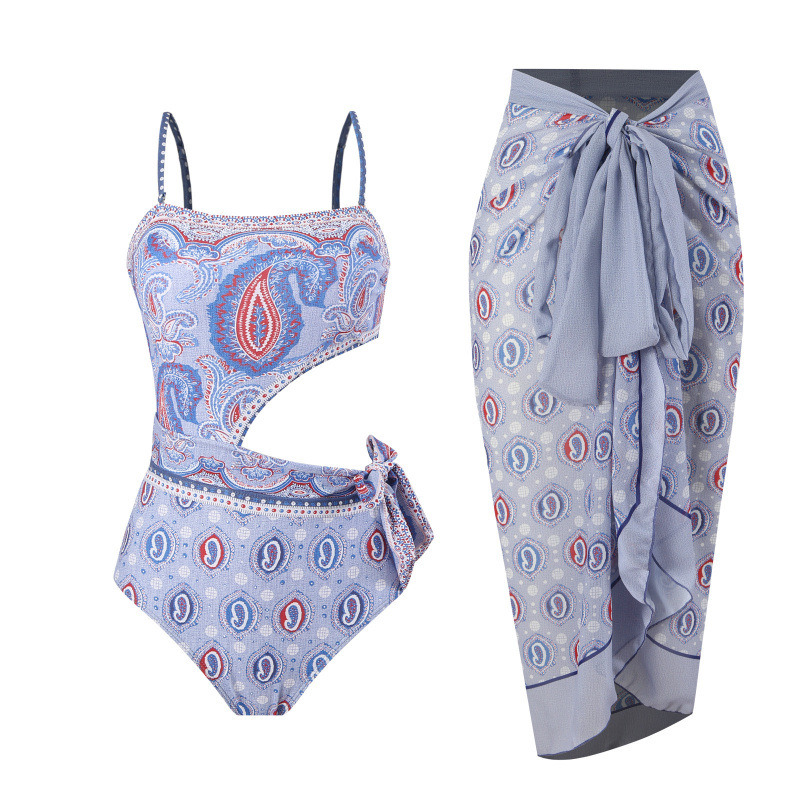 2024 유럽과 미국의 새로운 스타일 수영복 여성용 타이트 슬림 레트로 대외 무역 스트랩 수영복 세트 시폰 롱 원피스