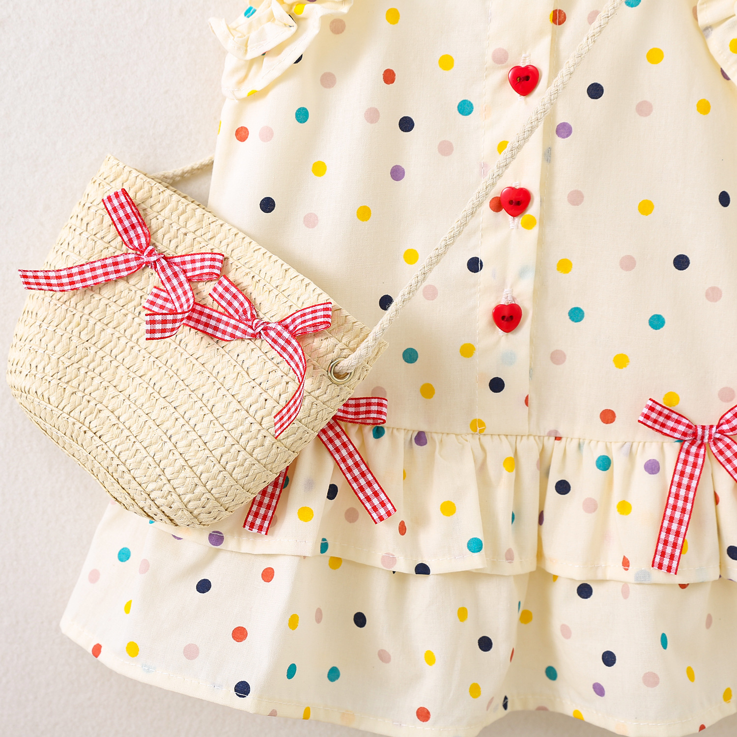 1742 여름 새로운 올오버 컬러 아이디어 면화 원피스 소녀 귀여운 원피스 활 대나무 바구니 가방