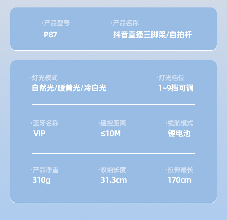 • 검정색 P87 셀카봉 + 대형 사각 조명 1개