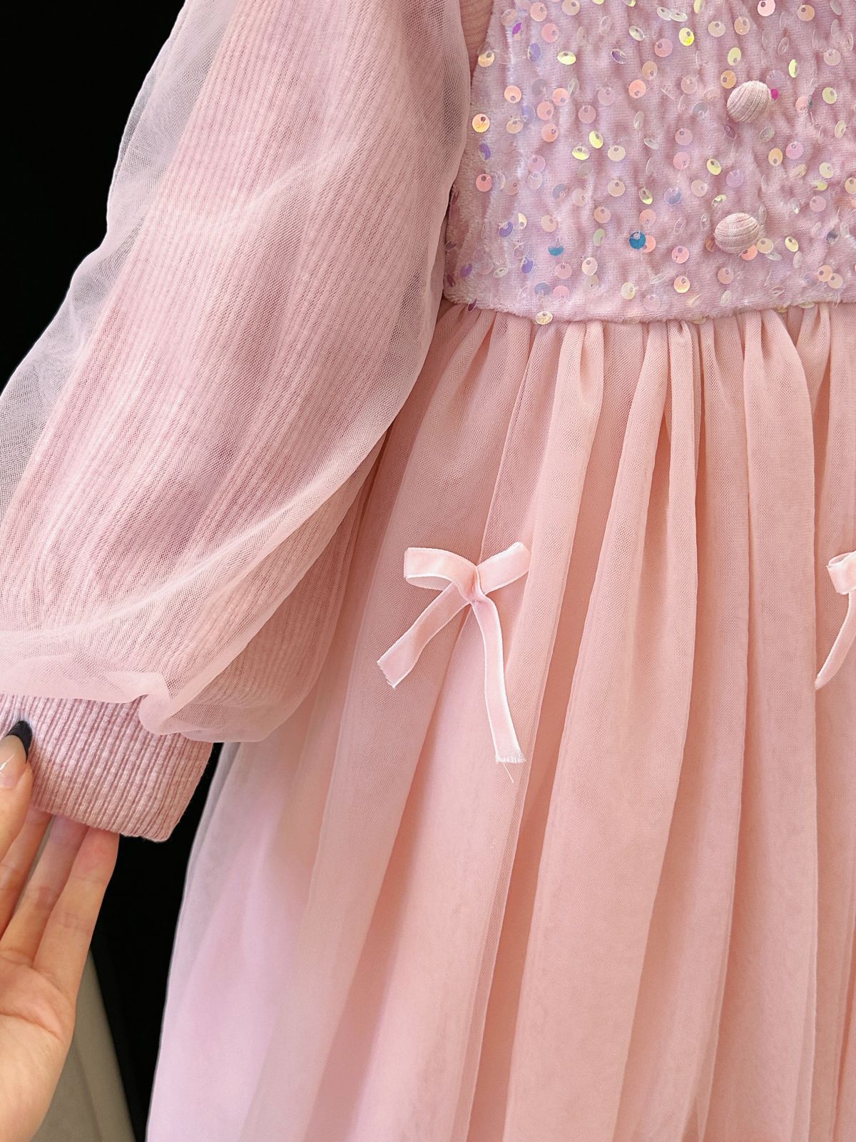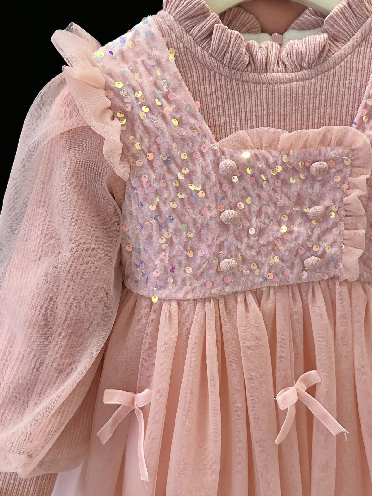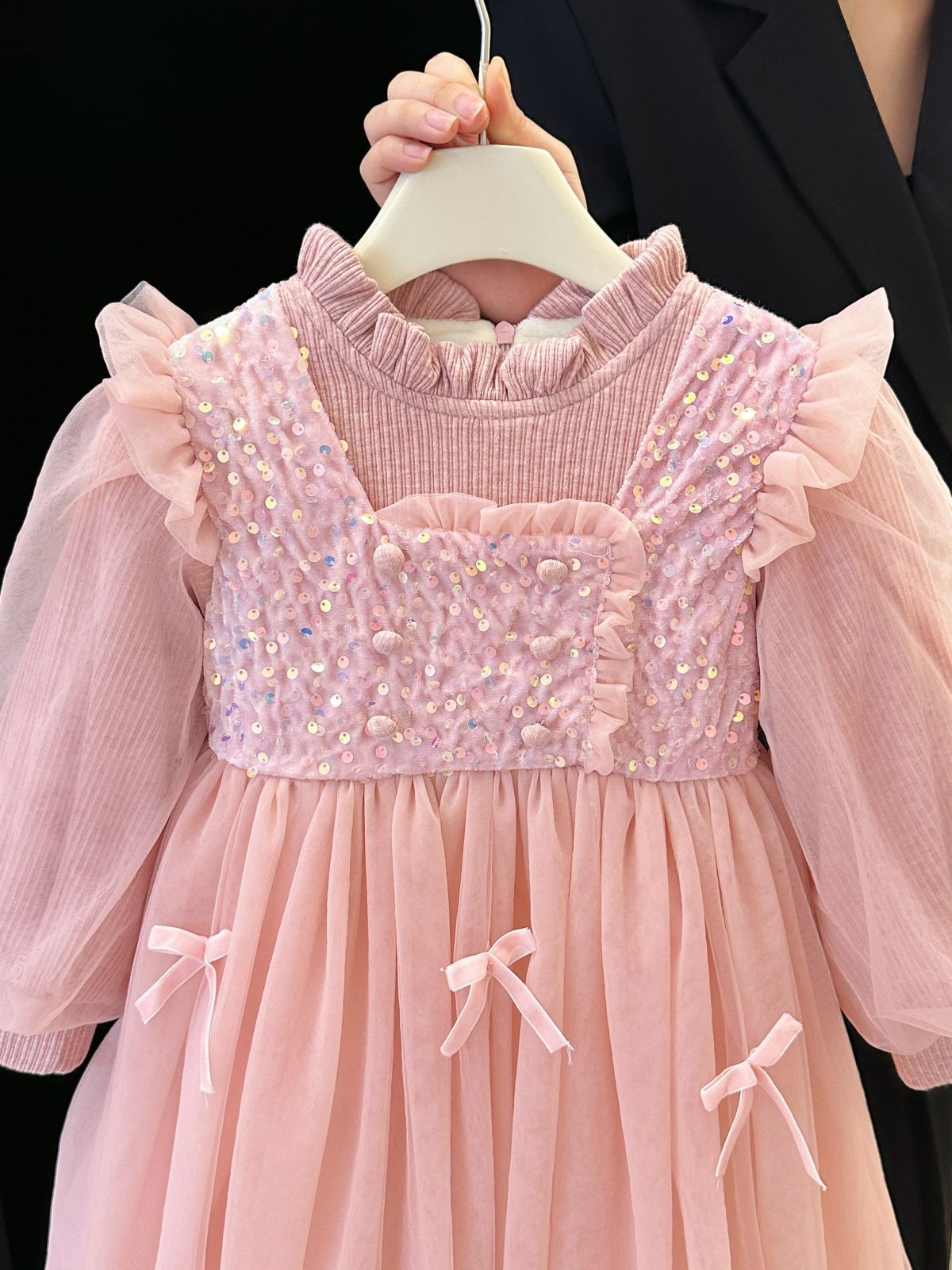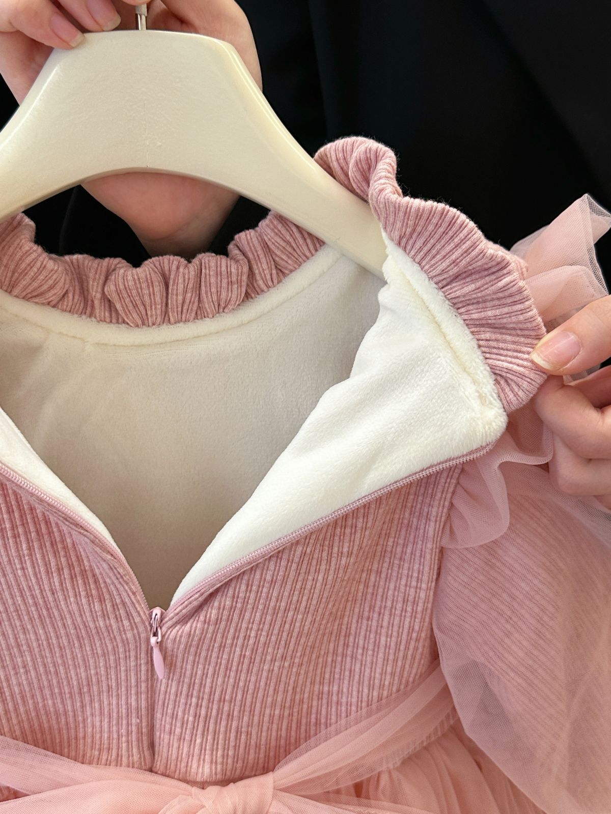 여자 기모 원피스 겨울 2024 새로운 중소 어린이 소매 패딩 메쉬 스커트 아기 소녀 공주 스커트