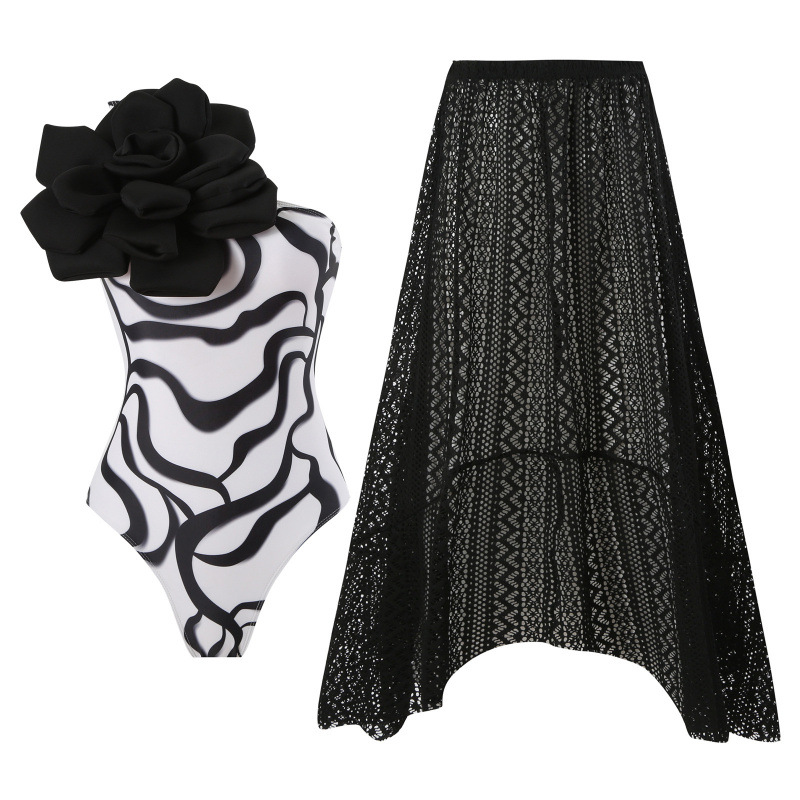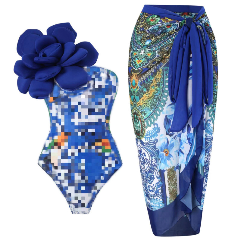 2025 유럽과 미국의 새로운 원피스 수영복 여성용 타이트한 슬림 큰 꽃 작은 국경 수영복 세트 쉬폰 원피스