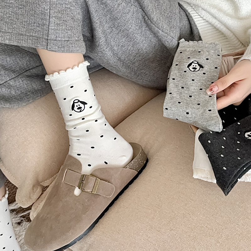 2024년 신상 회색 양말 여성용 물방울 무늬 비행기 강아지 만화 통기성 여성용 면 양말 중간 길이 양말 땀 흡수 통기성스토어 가기