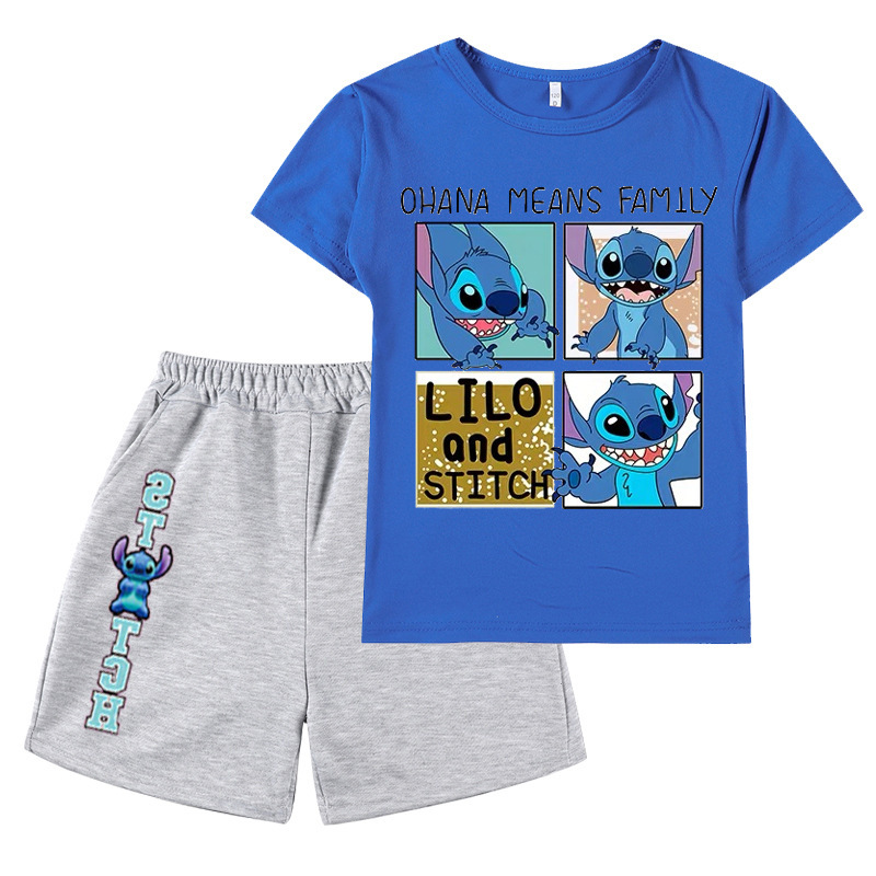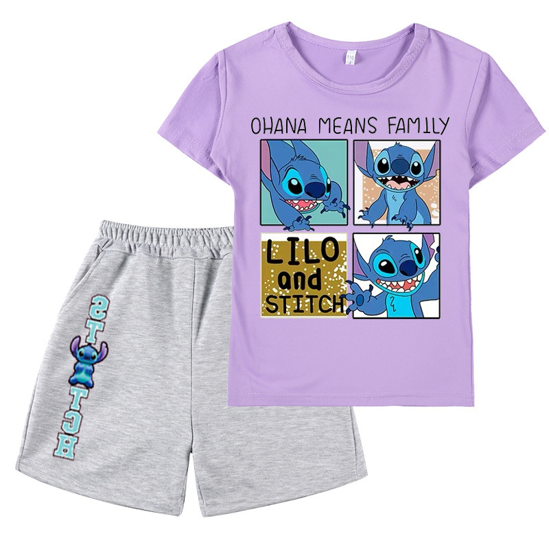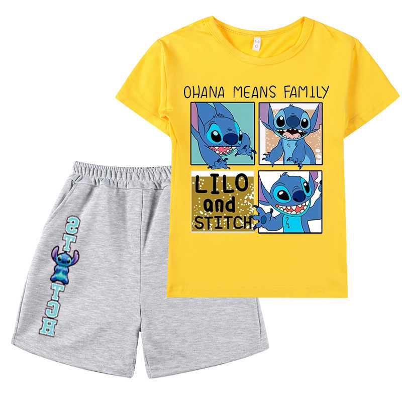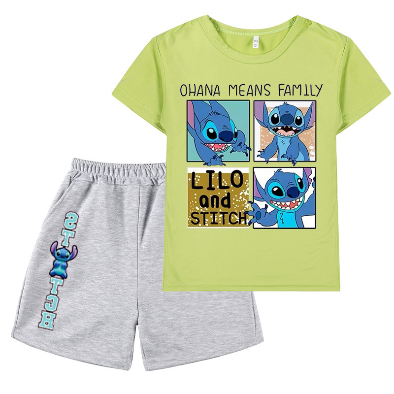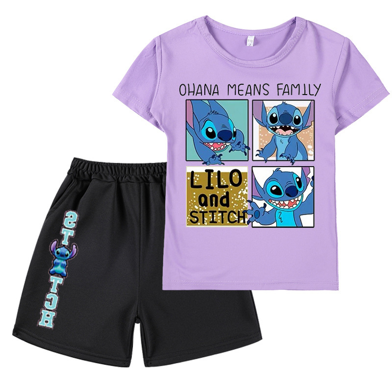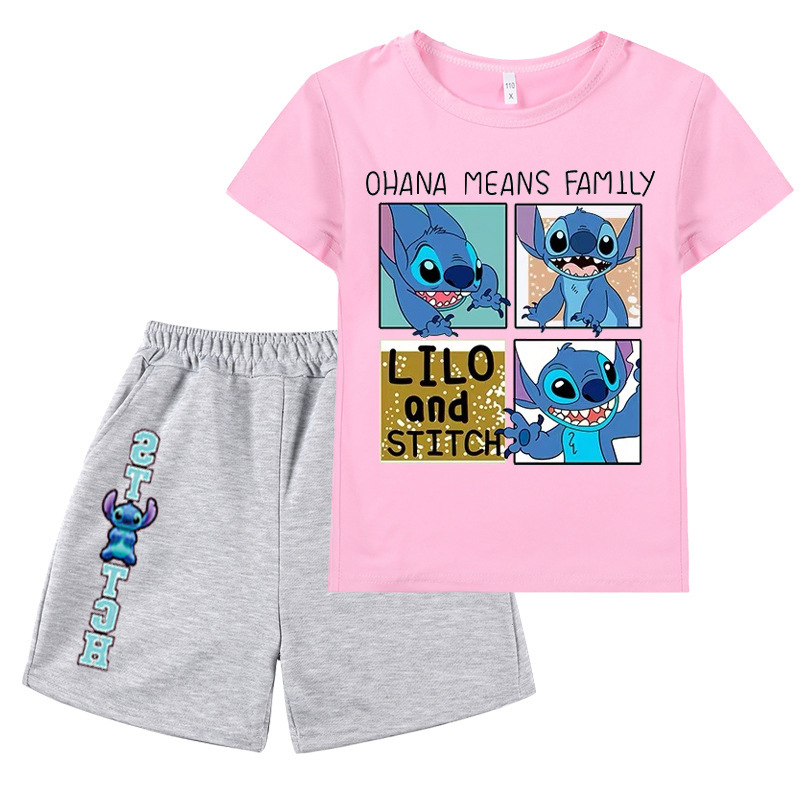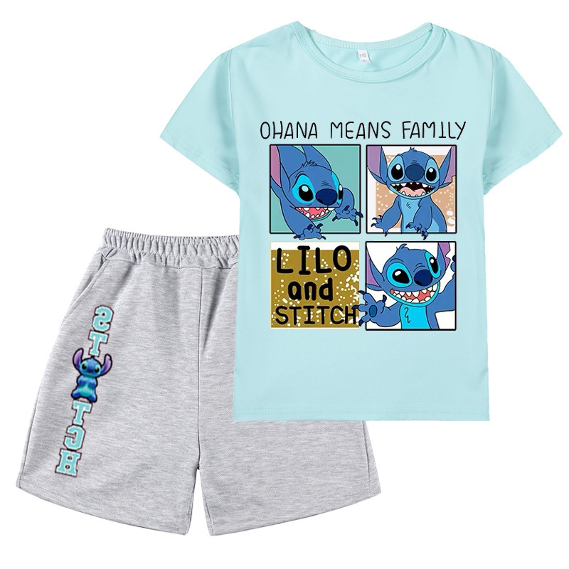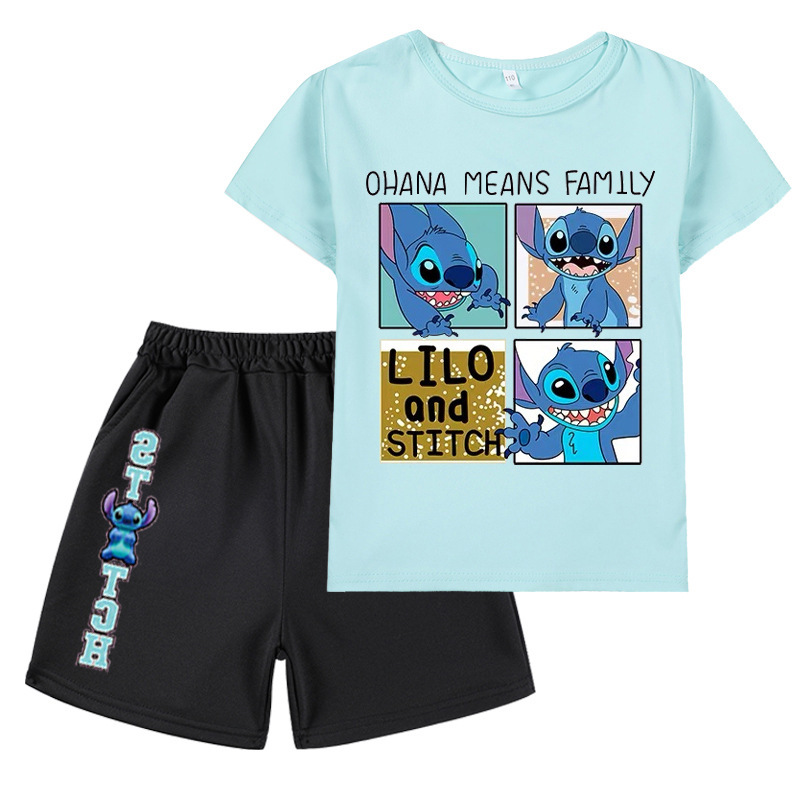 AliExpress 대외 무역 스타 아기 스티치 새로운 어린이 만화 세트 소년 소녀 반팔 티셔츠 반바지