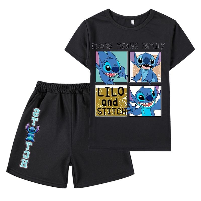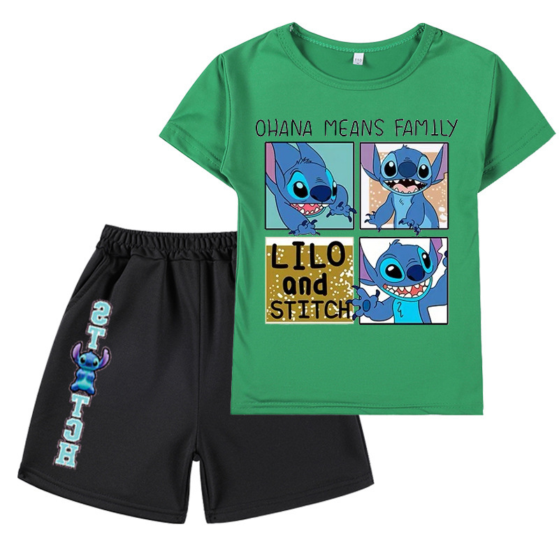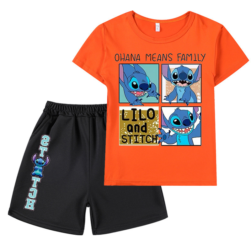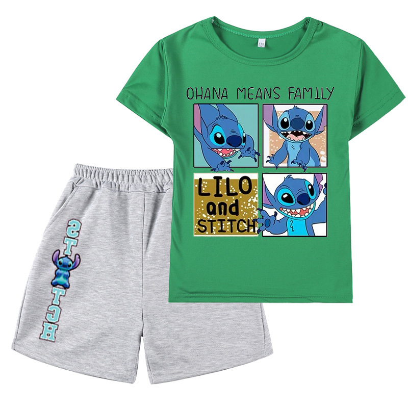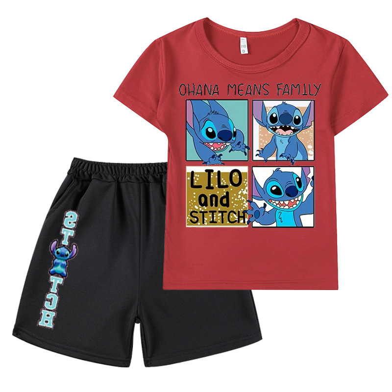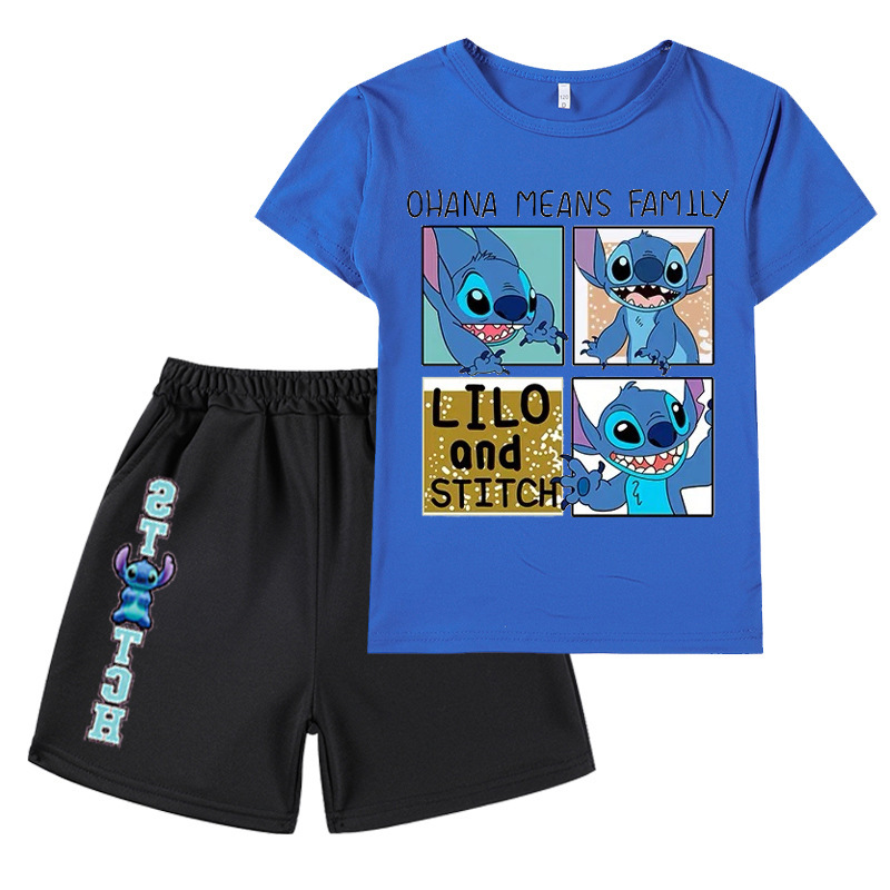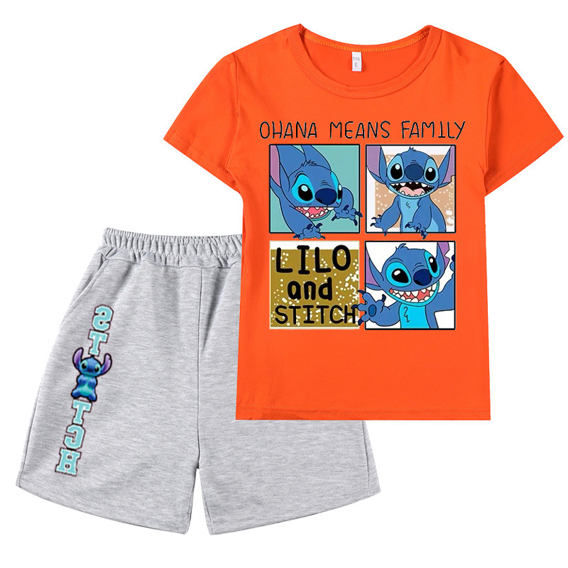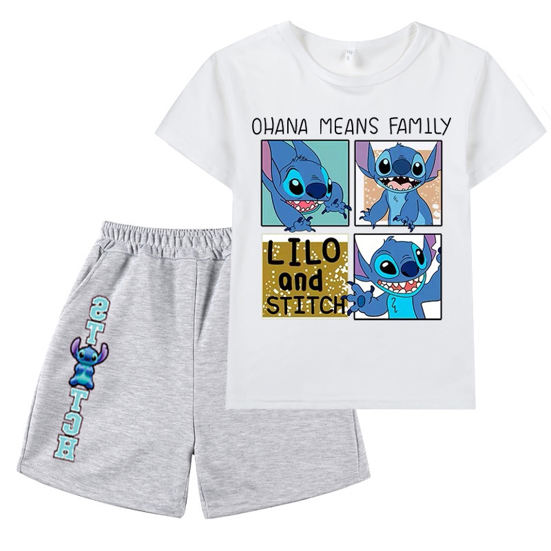 AliExpress 대외 무역 스타 아기 스티치 새로운 어린이 만화 세트 소년 소녀 반팔 티셔츠 반바지