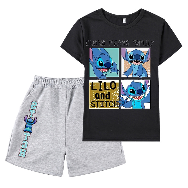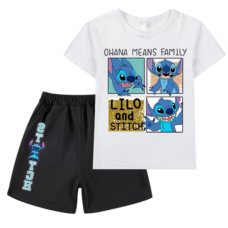 AliExpress 대외 무역 스타 아기 스티치 새로운 어린이 만화 세트 소년 소녀 반팔 티셔츠 반바지스토어 가기