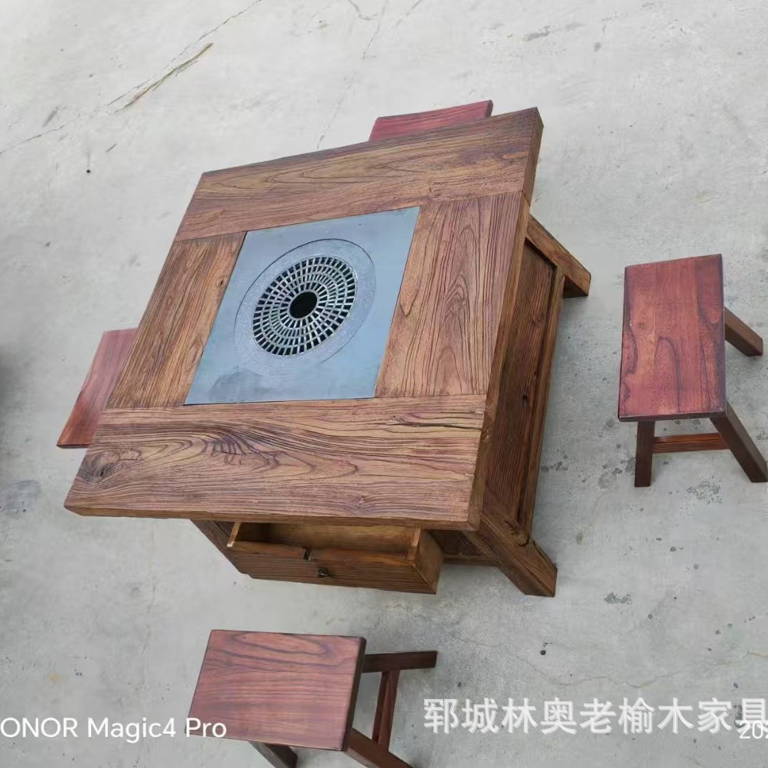 오래된 느릅 나무 용광로 테이블 야외 발코니 요리 차 테이블 안뜰 캠핑 BBQ 뜨거운 냄비 테이블 솔리드 우드 스퀘어 테이블 로그 식탁스토어 가기