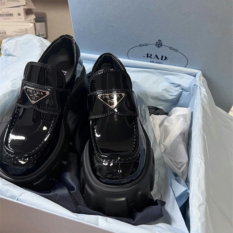 P Carrefour 신발 2024 새로운 스타일 정품 가죽 라운드 발가락 삼각형 로고 두꺼운 밑창 플랫폼 신발 여성 슬립 온 기어 작은 가죽 신발스토어 가기