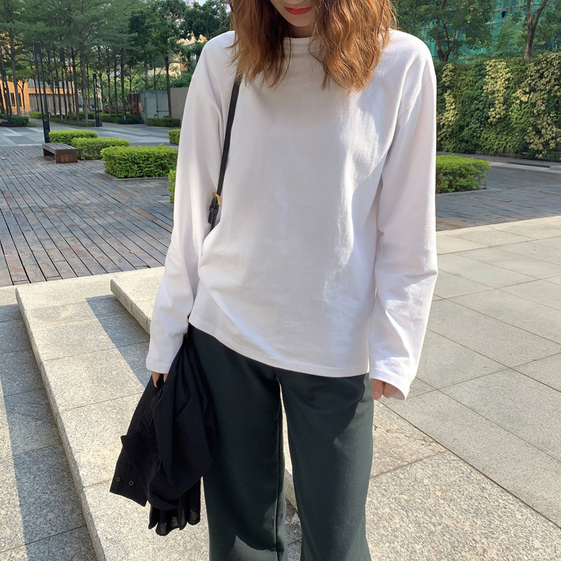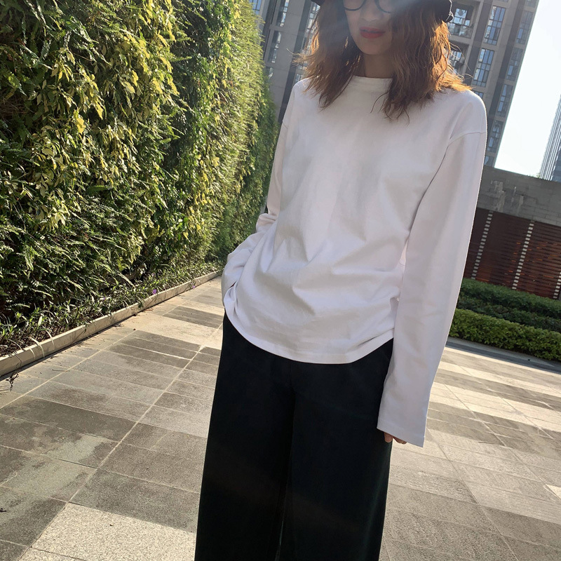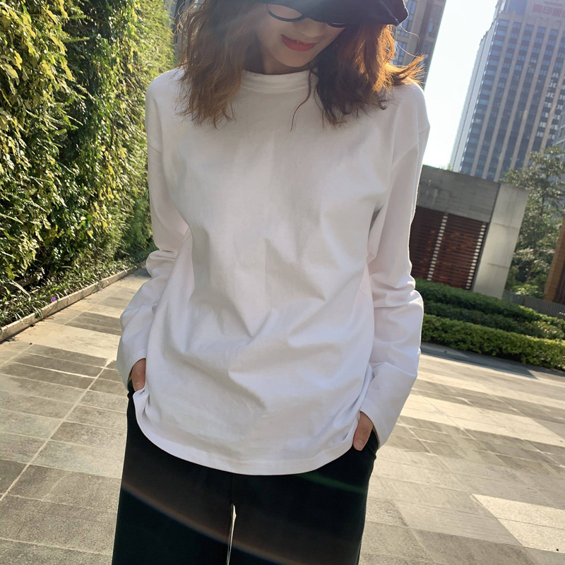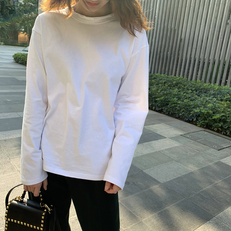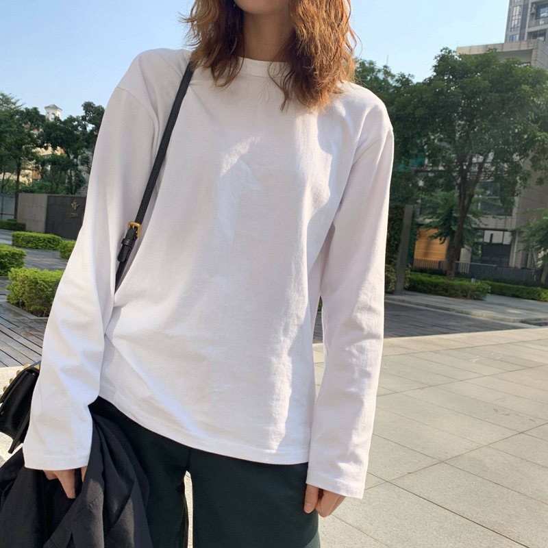 300g 신강 순수 코튼 심플 화이트 바닥 셔츠 여성용 2024 봄, 가을 라운드 넥 긴팔 티셔츠 여성용 탑 인스토어 가기