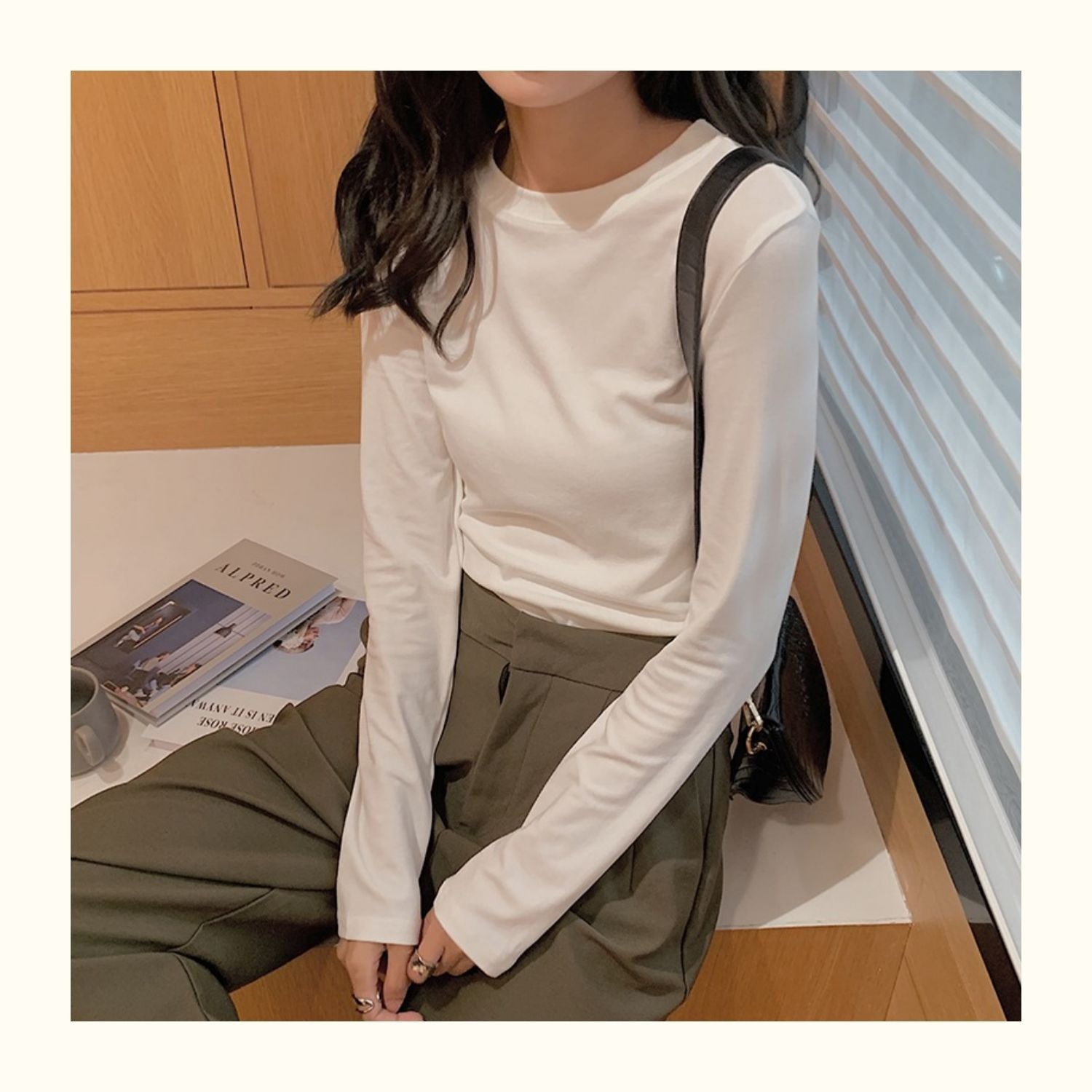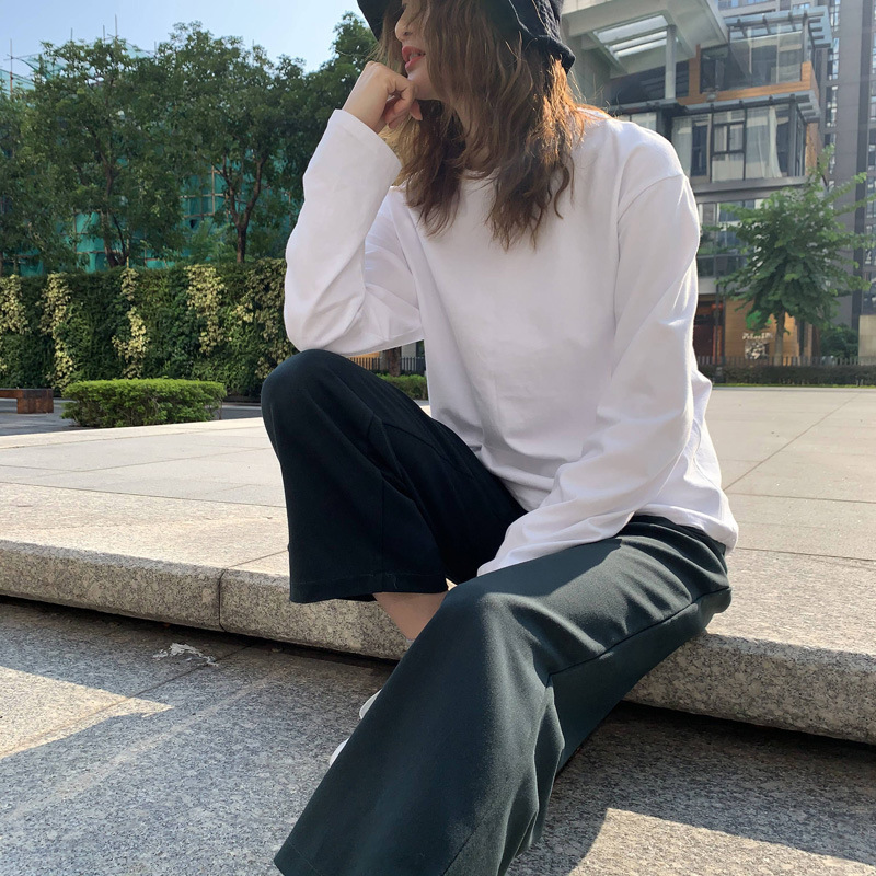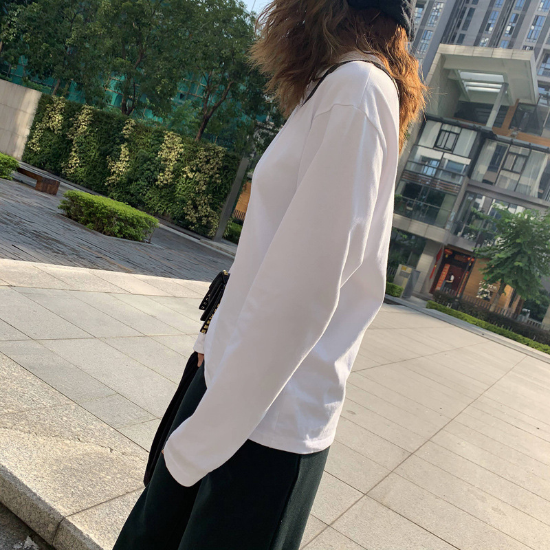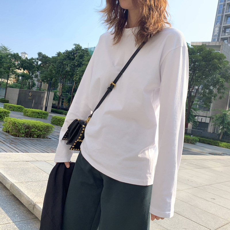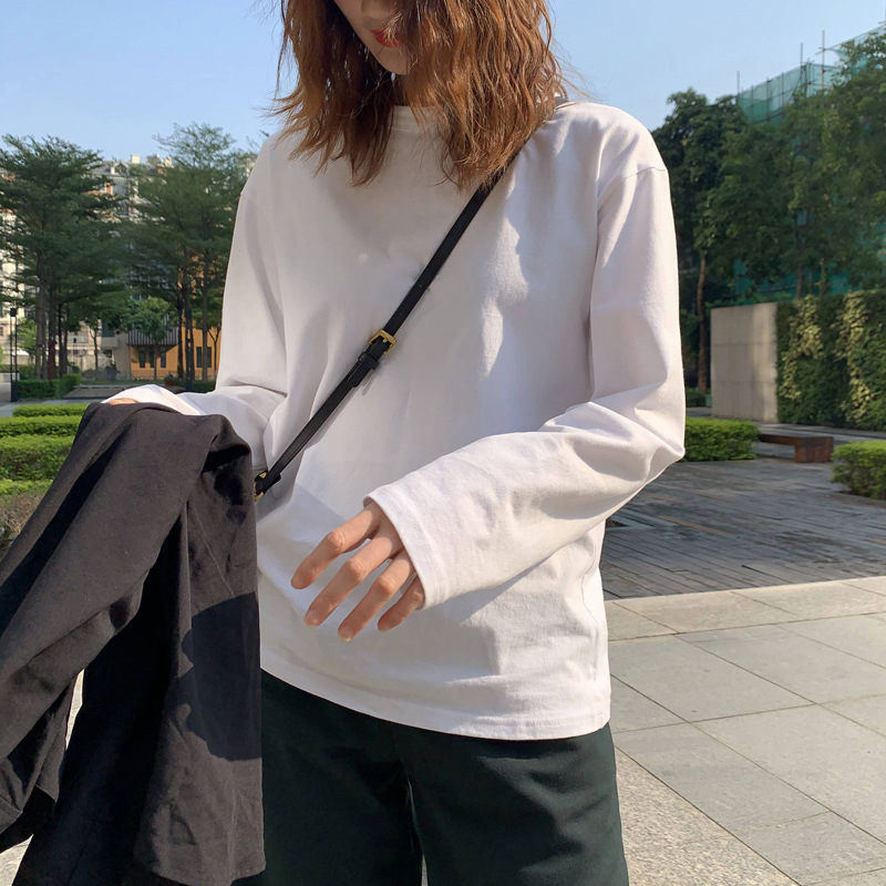 300g 신강 순수 코튼 심플 화이트 바닥 셔츠 여성용 2024 봄, 가을 라운드 넥 긴팔 티셔츠 여성용 탑 인스토어 가기