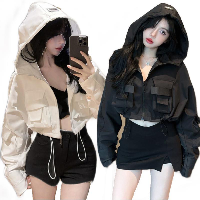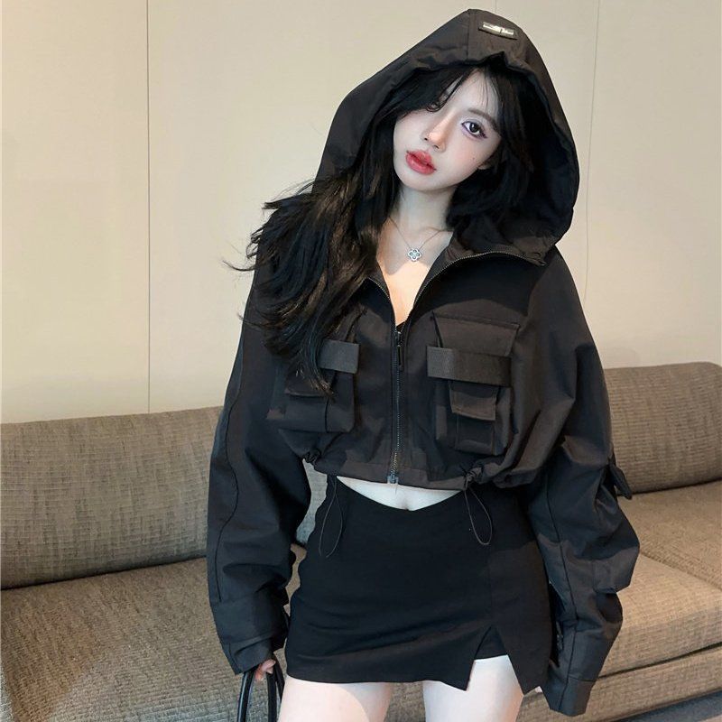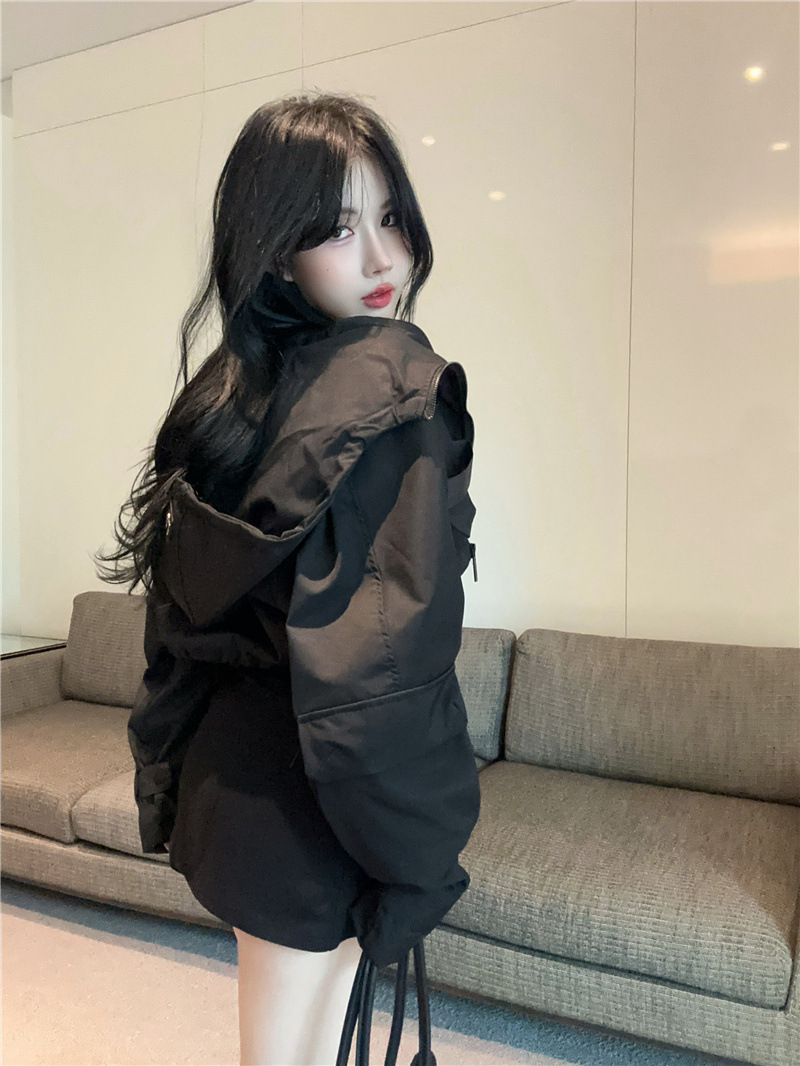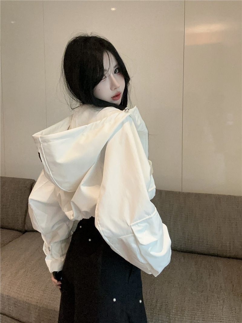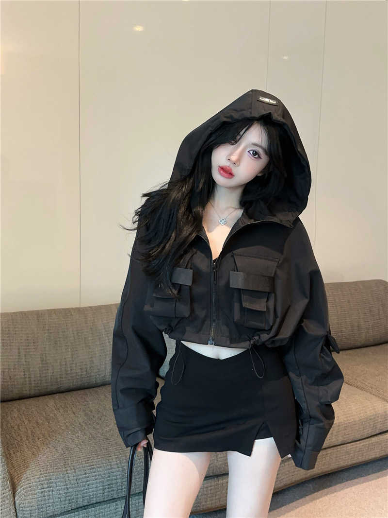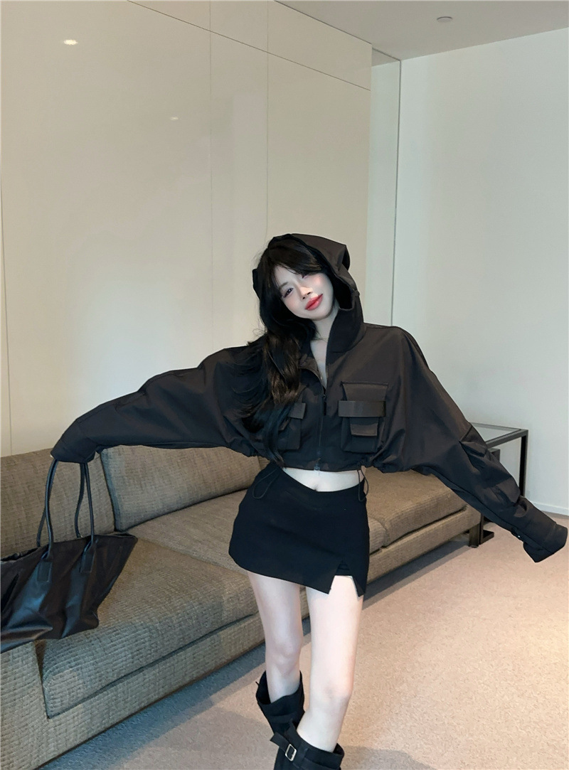 유럽 폭발 큰 포켓 주름 박쥐 슬리브 디자인 후드 작업 코트 여성의 가을 느슨한 올 매치 쇼트 재킷