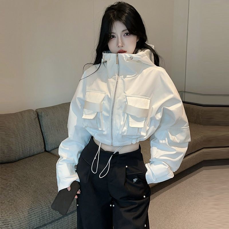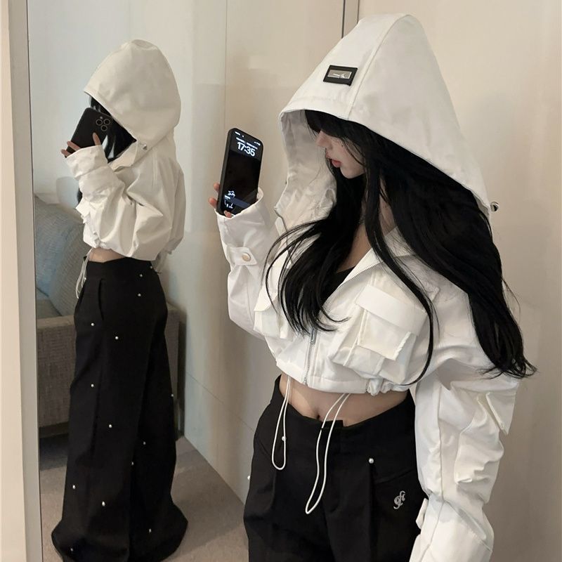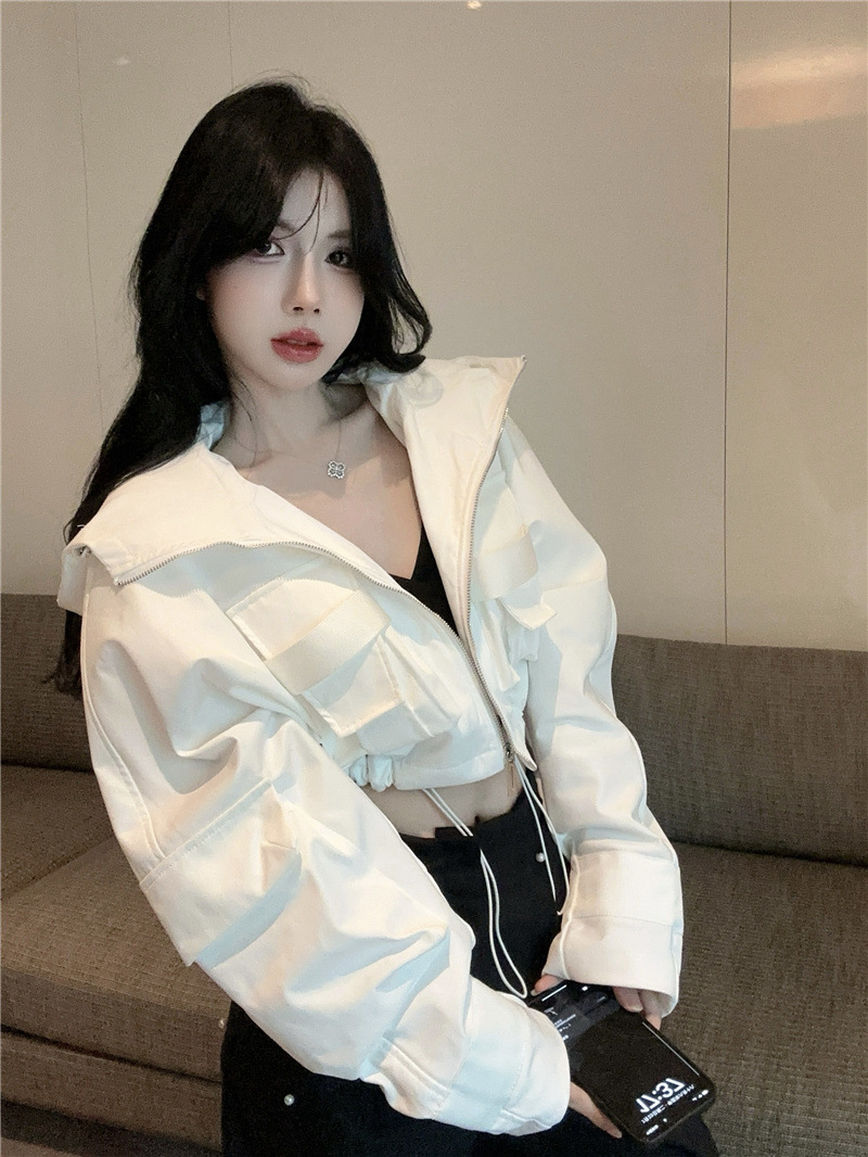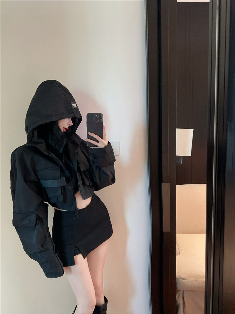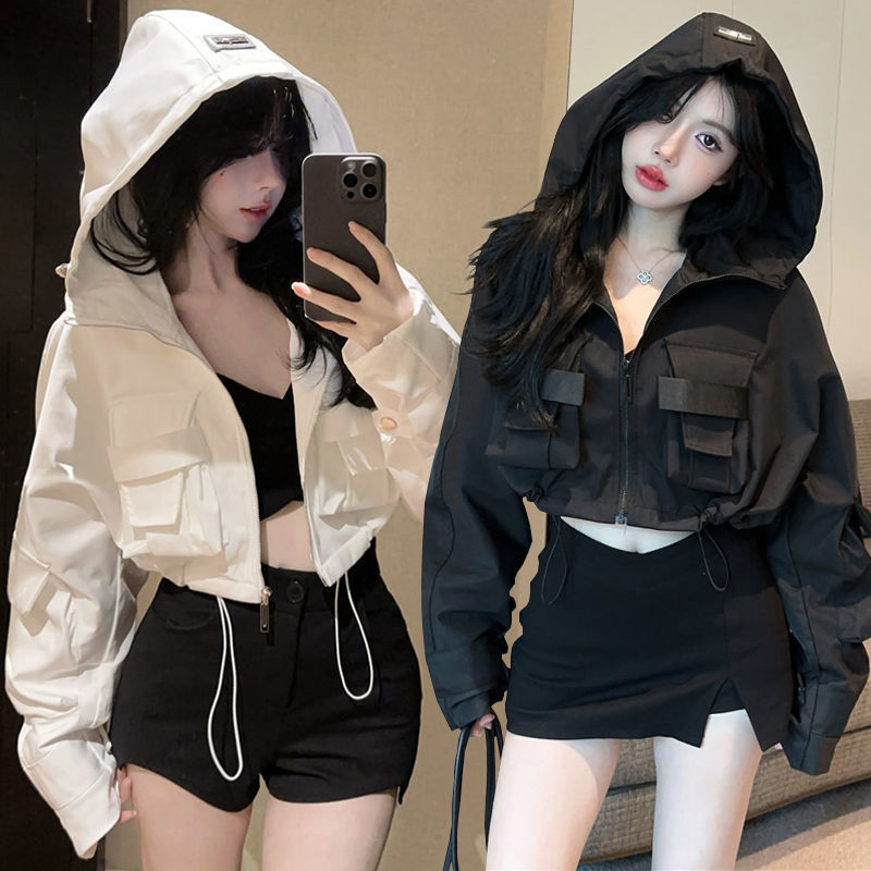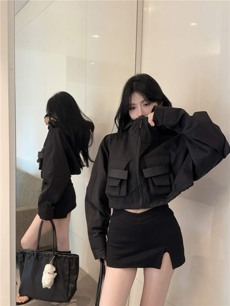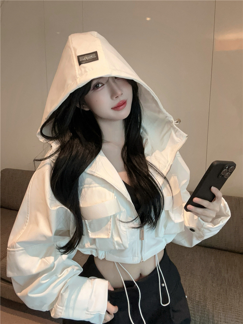 유럽 폭발 큰 포켓 주름 박쥐 슬리브 디자인 후드 작업 코트 여성의 가을 느슨한 올 매치 쇼트 재킷