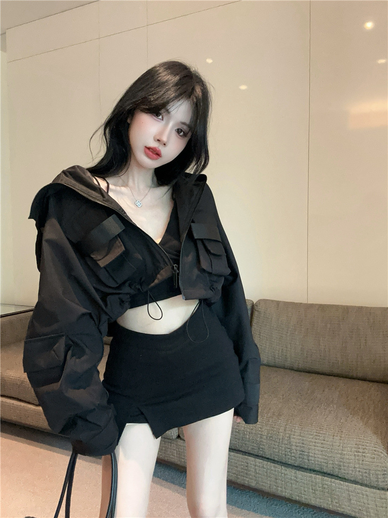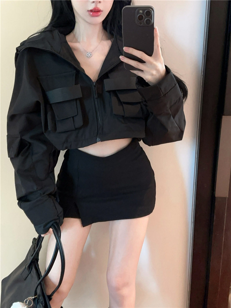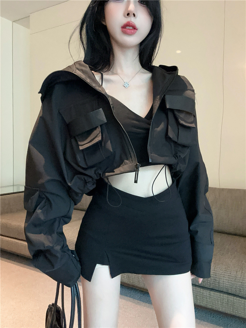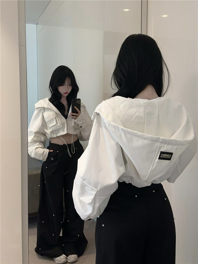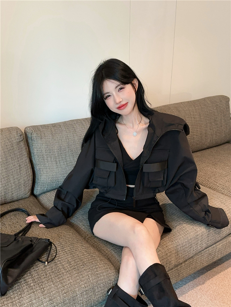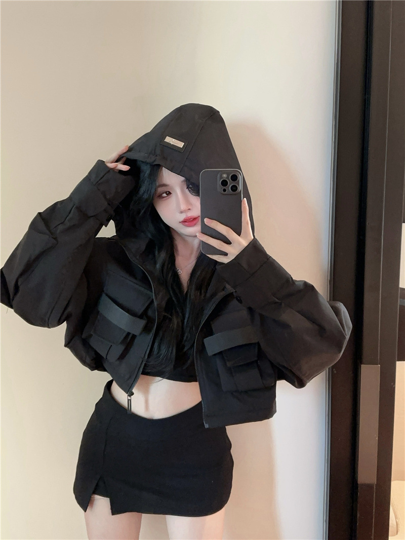 유럽 폭발 큰 포켓 주름 박쥐 슬리브 디자인 후드 작업 코트 여성의 가을 느슨한 올 매치 쇼트 재킷