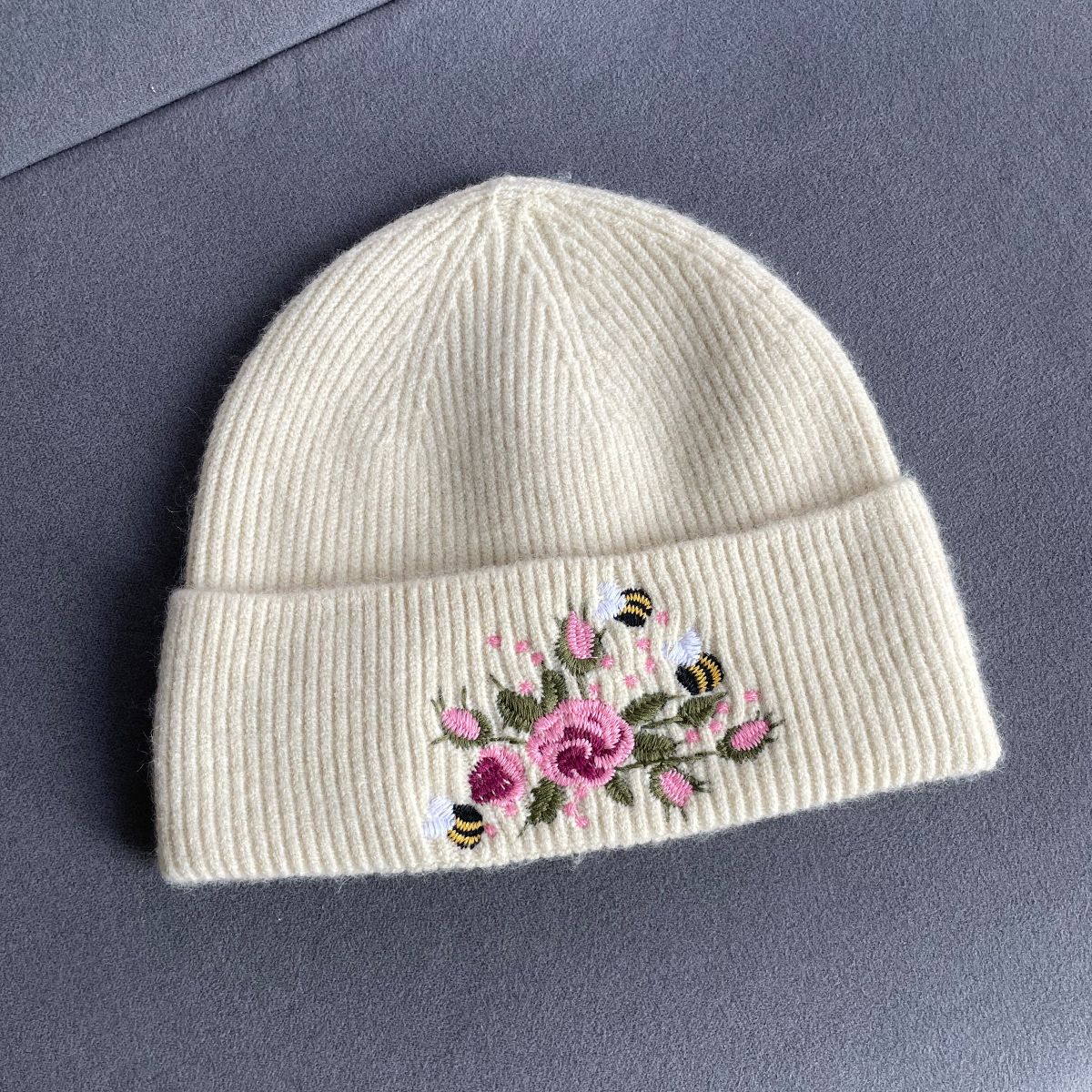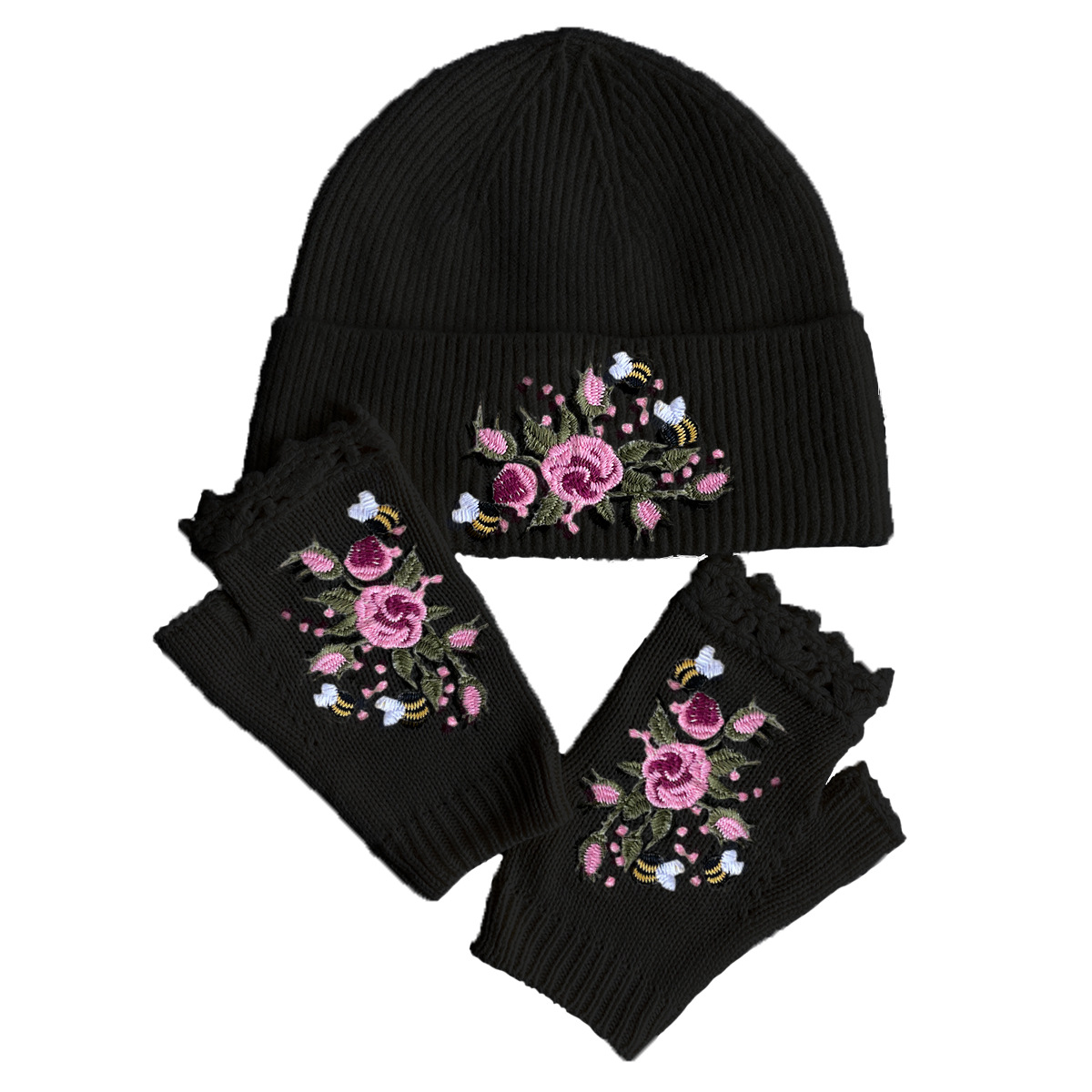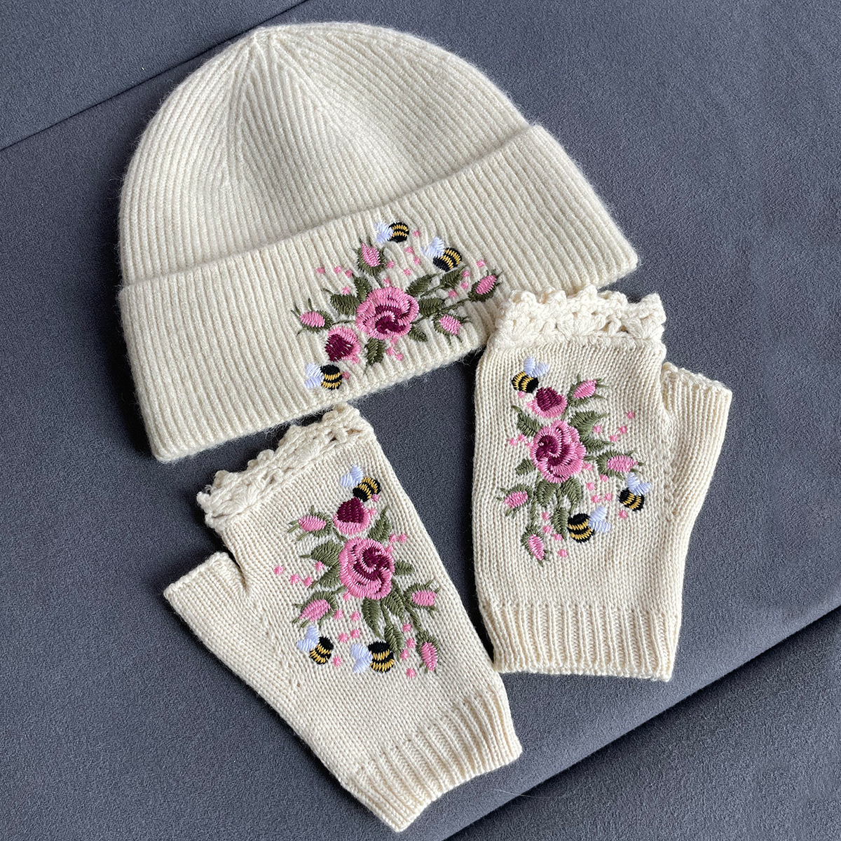 국경 간 폭발 가을과 겨울 새로운 여성 니트 장갑 니트 모자 따뜻한 양모 자수 꿀벌 꽃 세트