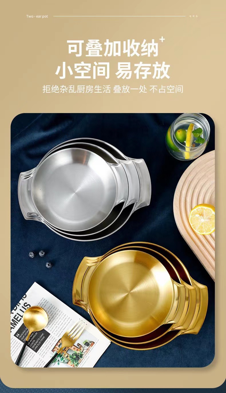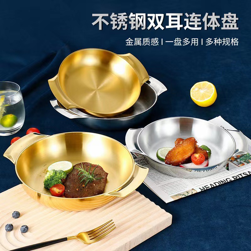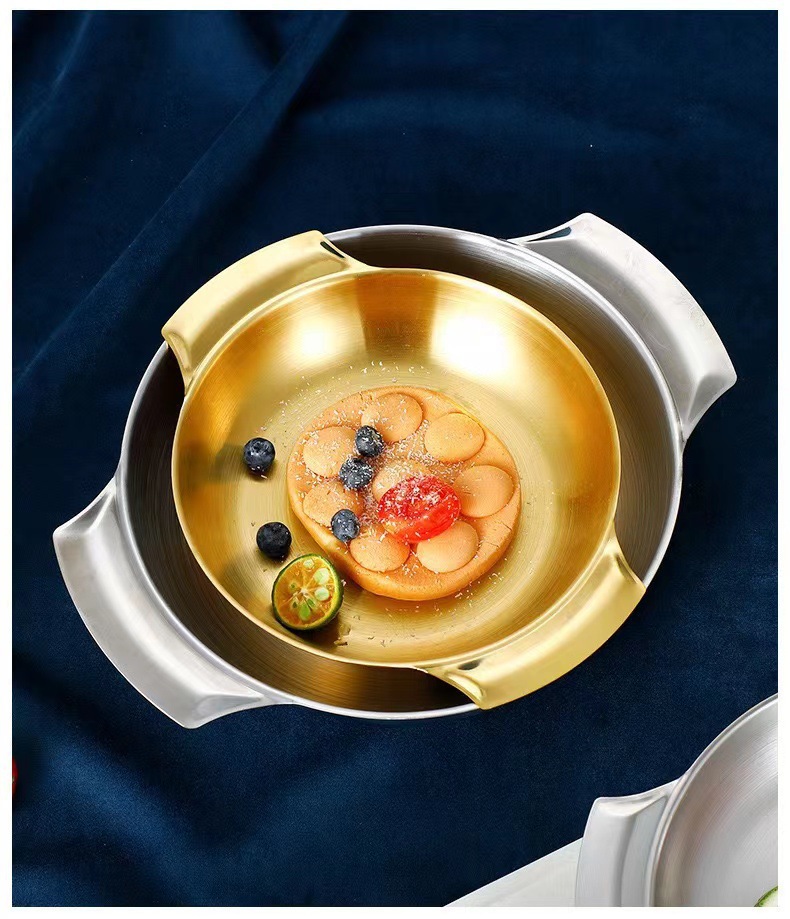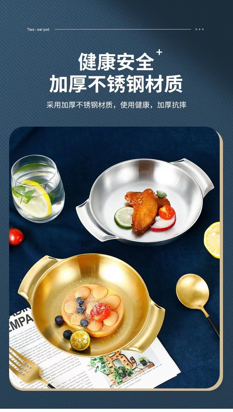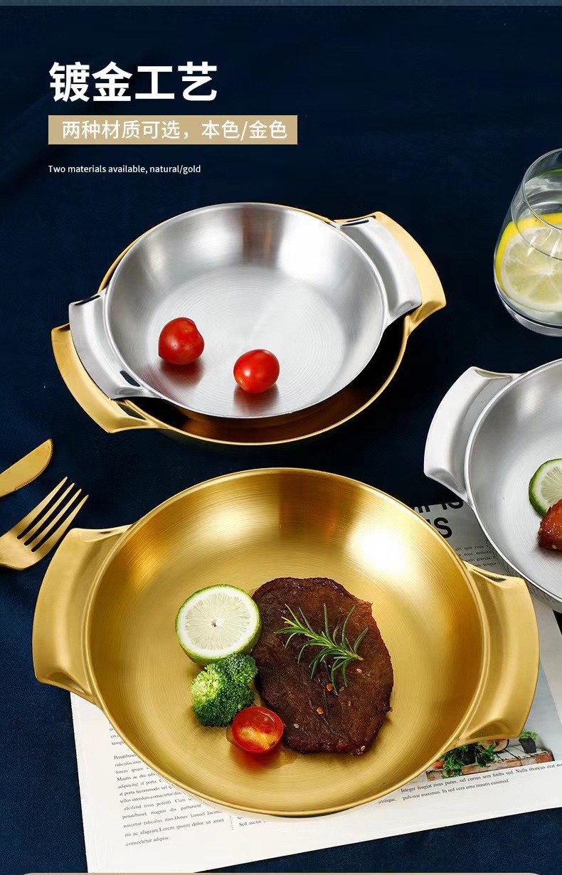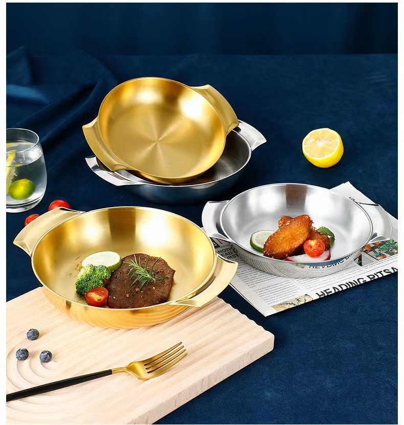 한국식 스테인레스 스틸 건조 냄비 황금 바이노럴 파스타 플레이트 창조적 인 구운 쌀 플레이트 깊은 디스크 평평한 바닥 판라면 작은 냄비