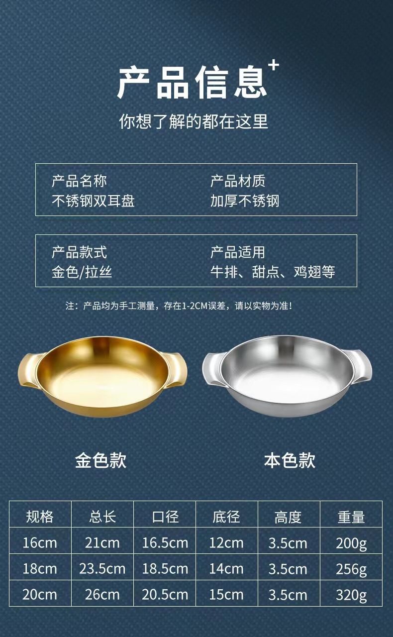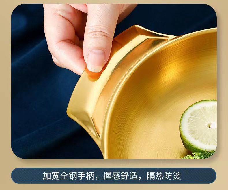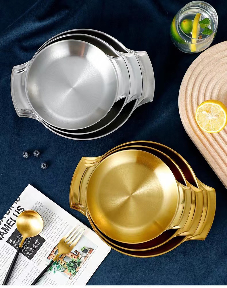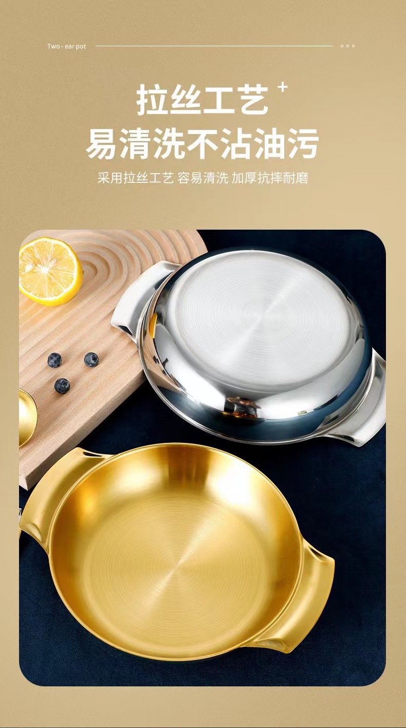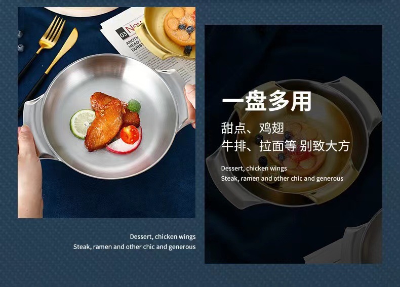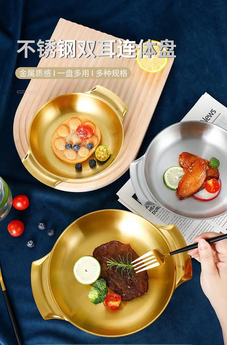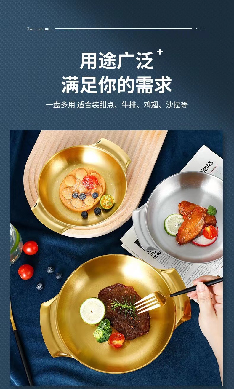 한국식 스테인레스 스틸 건조 냄비 황금 바이노럴 파스타 플레이트 창조적 인 구운 쌀 플레이트 깊은 디스크 평평한 바닥 판라면 작은 냄비