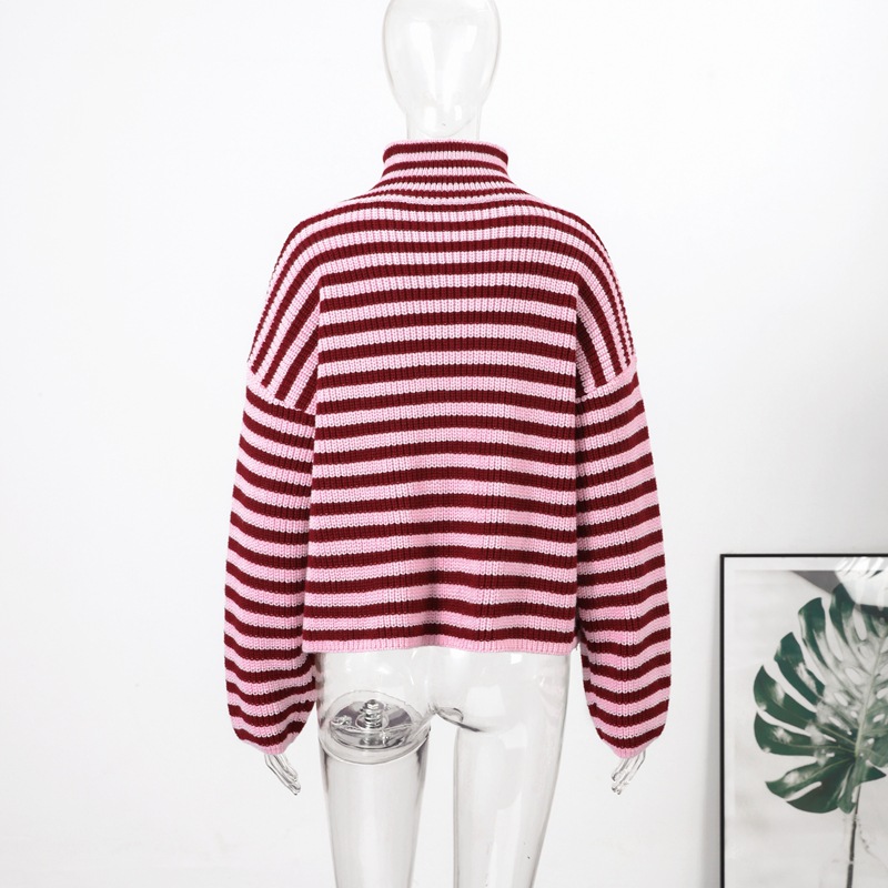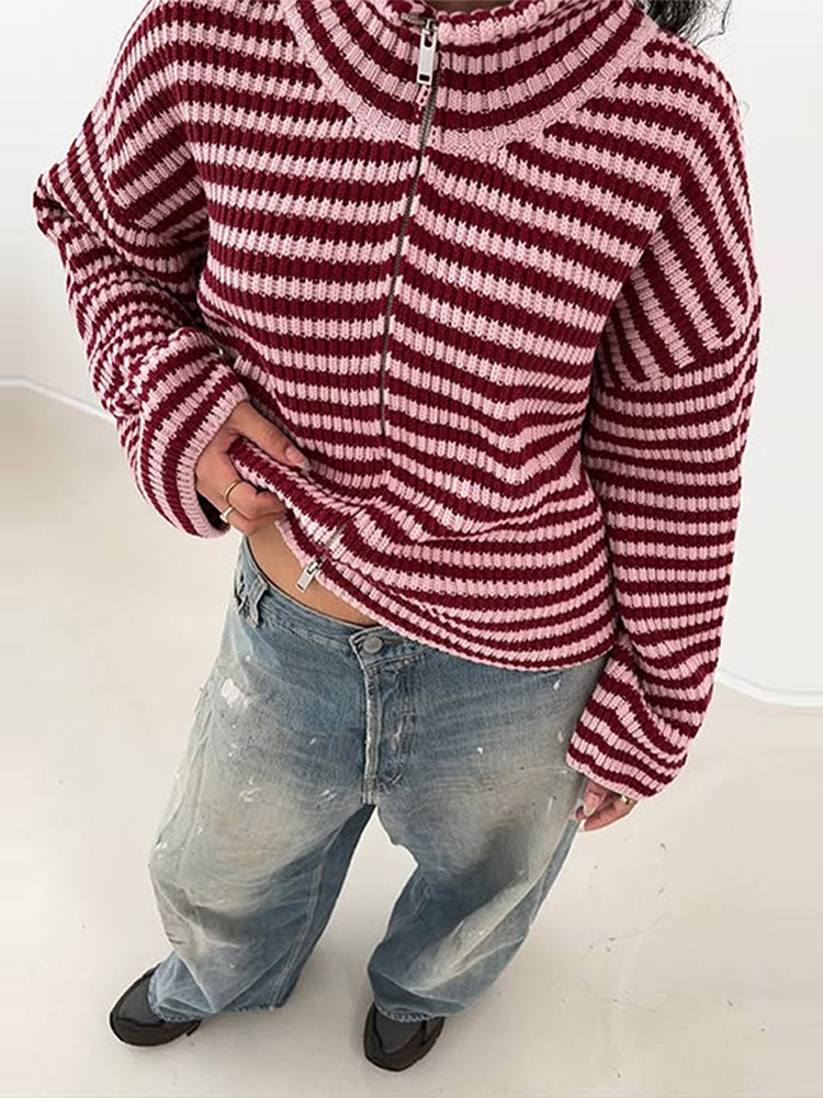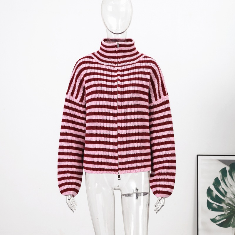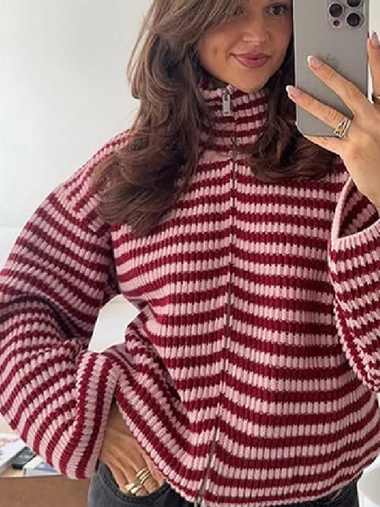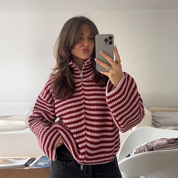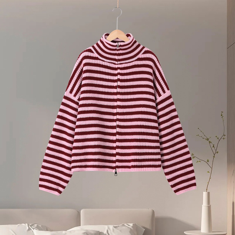 2026년 크로스보더 알리익스프레스 인기상품 초봄 신상품 레이지 스타일 다용도 스탠드 칼라 스트라이프 지퍼 스웨터 니트 가디건 여성용스토어 가기