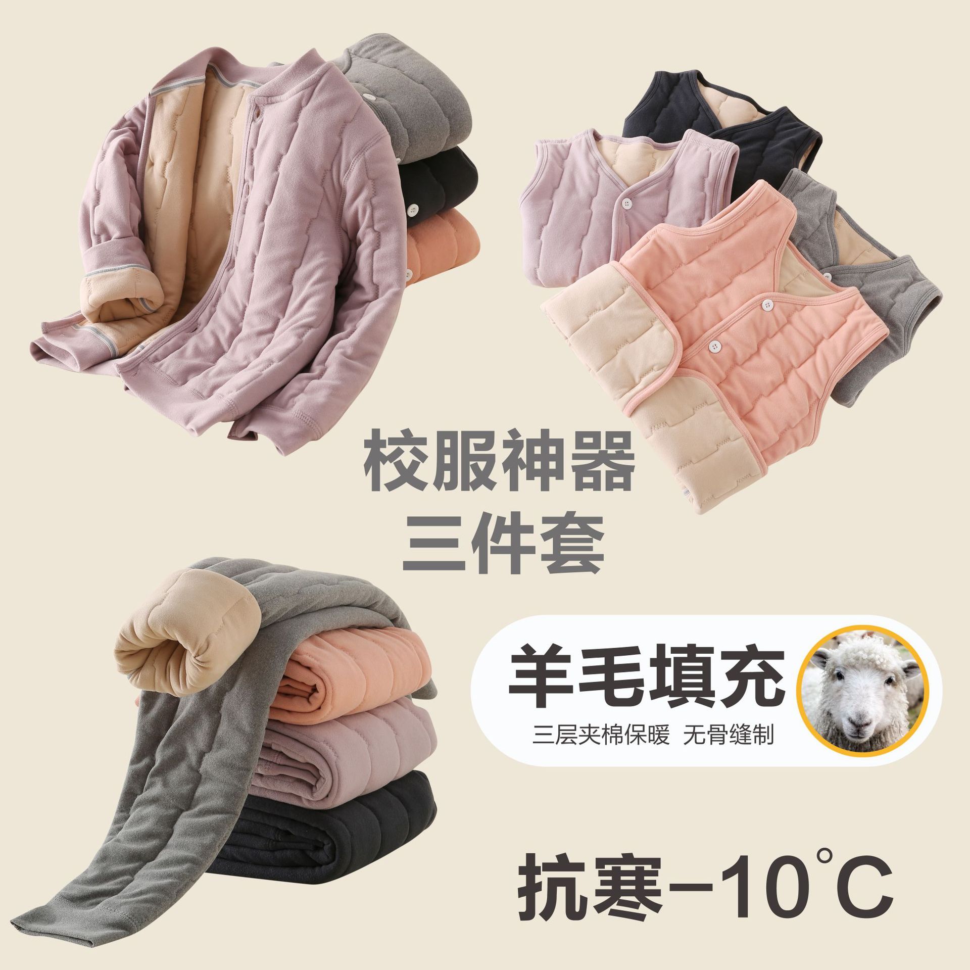 어린이 면화 조끼 가을과 겨울 학교 유니폼 따뜻한 면화 바지 바비 벨벳 코튼 옷 초등 및 중등 학생을위한 따뜻한 3 종 세트