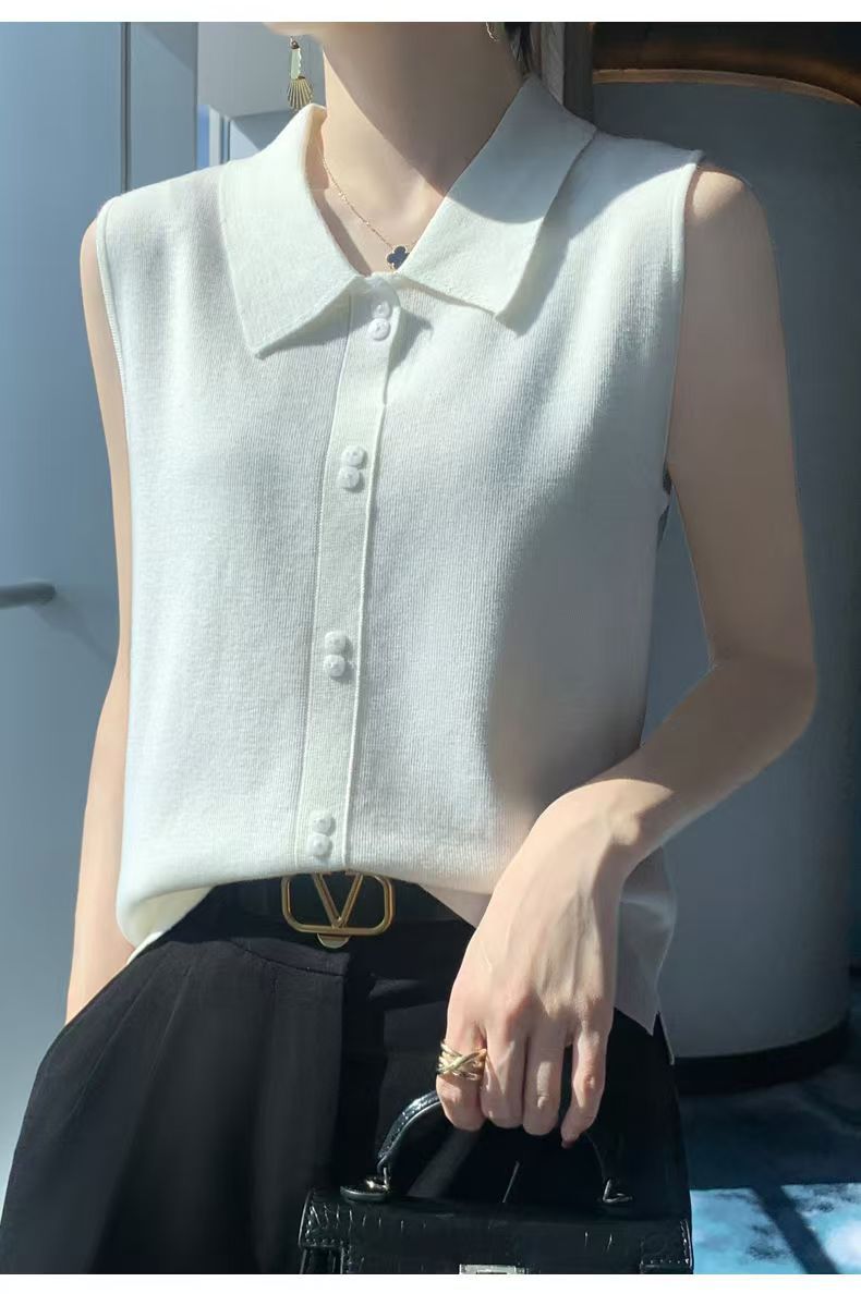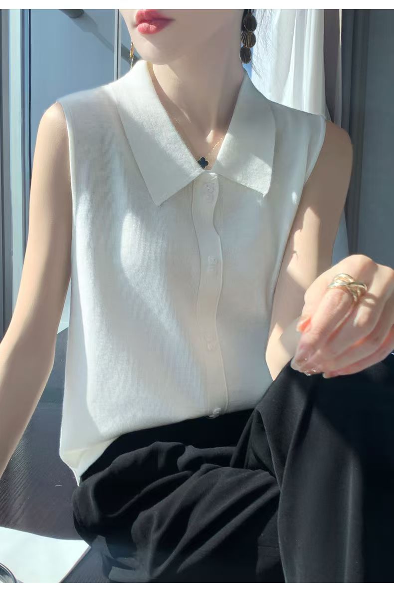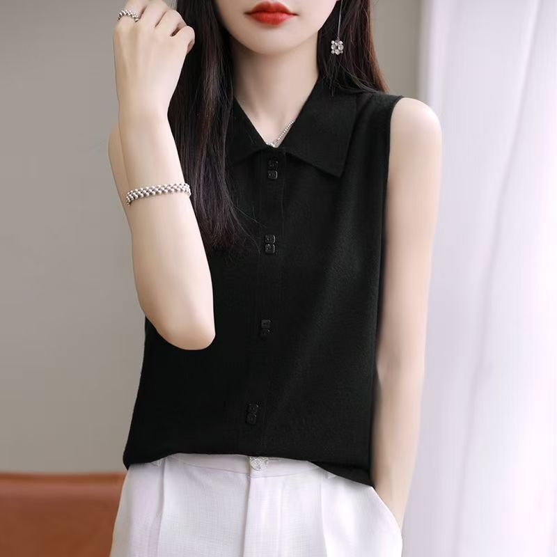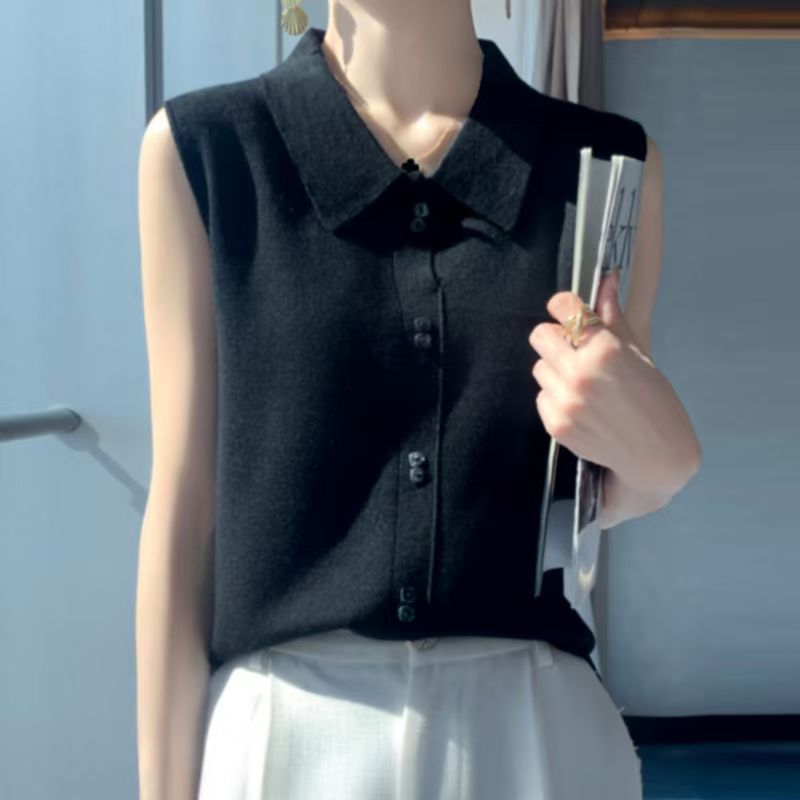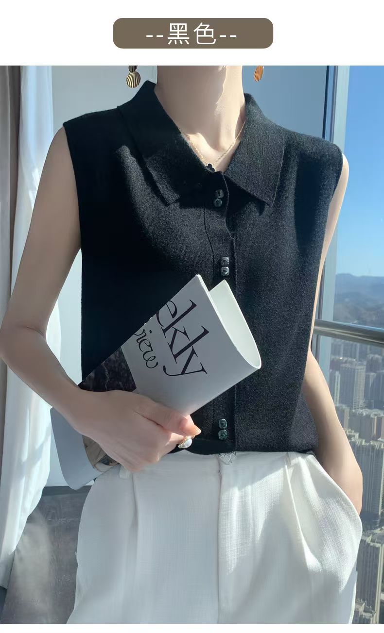 유행 POLO 칼라 니트 조끼 2024 가을과 겨울 새로운 여성의 느슨한 슬리밍 탑 민소매 스타일리시한베이스 셔츠