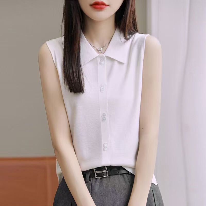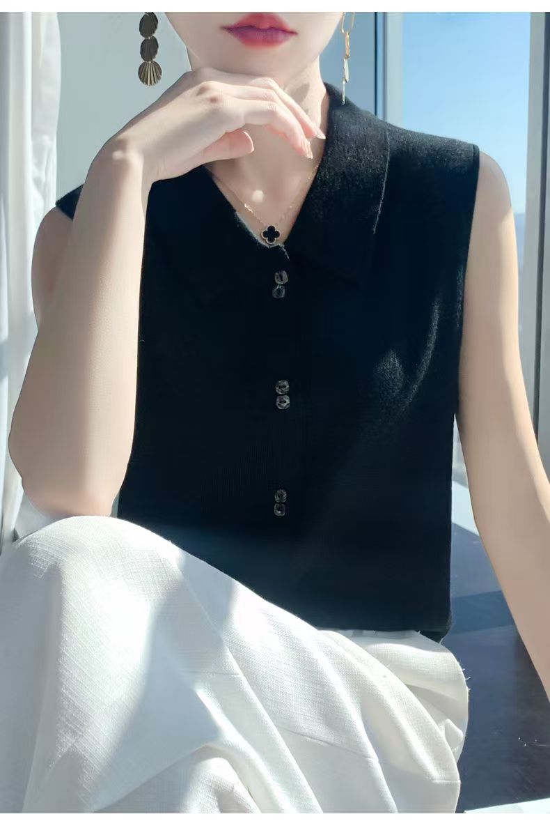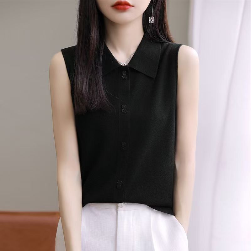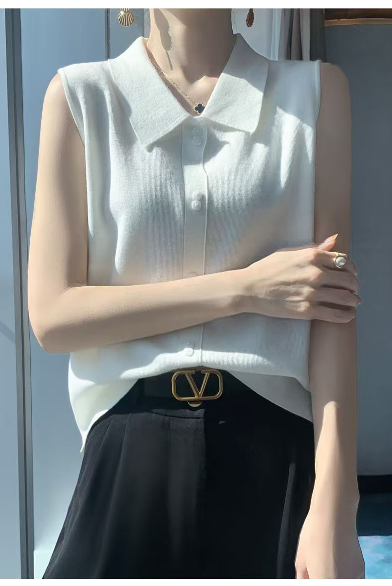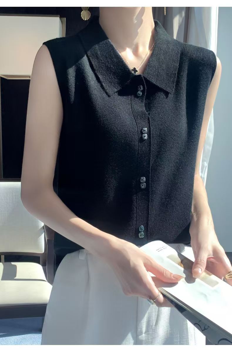 유행 POLO 칼라 니트 조끼 2024 가을과 겨울 새로운 여성의 느슨한 슬리밍 탑 민소매 스타일리시한베이스 셔츠
