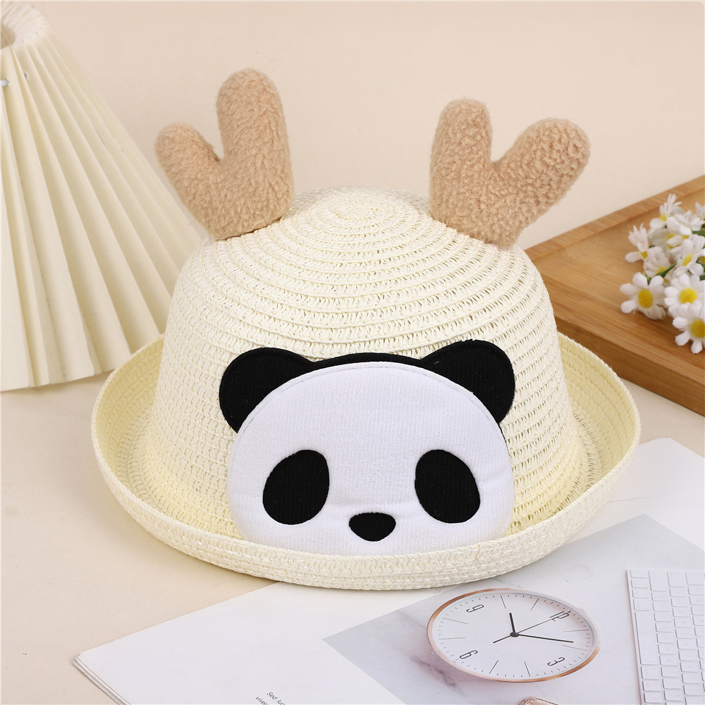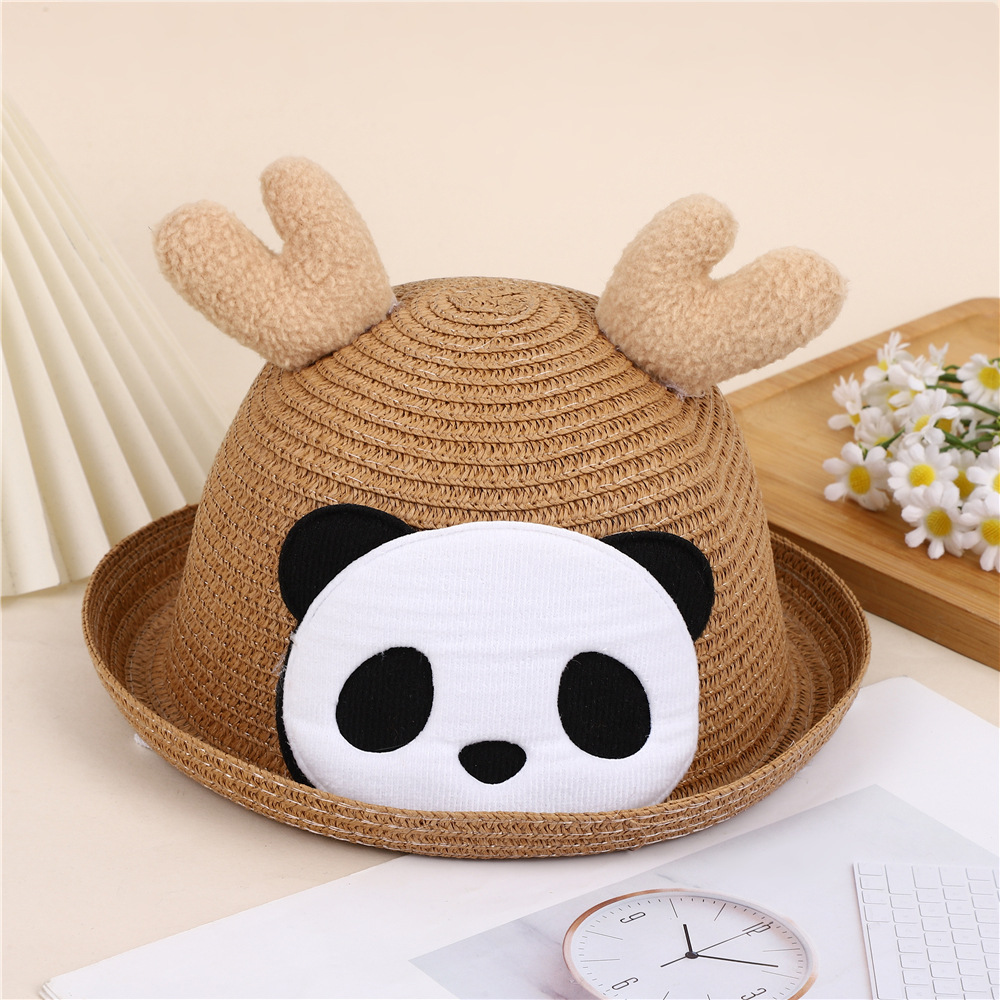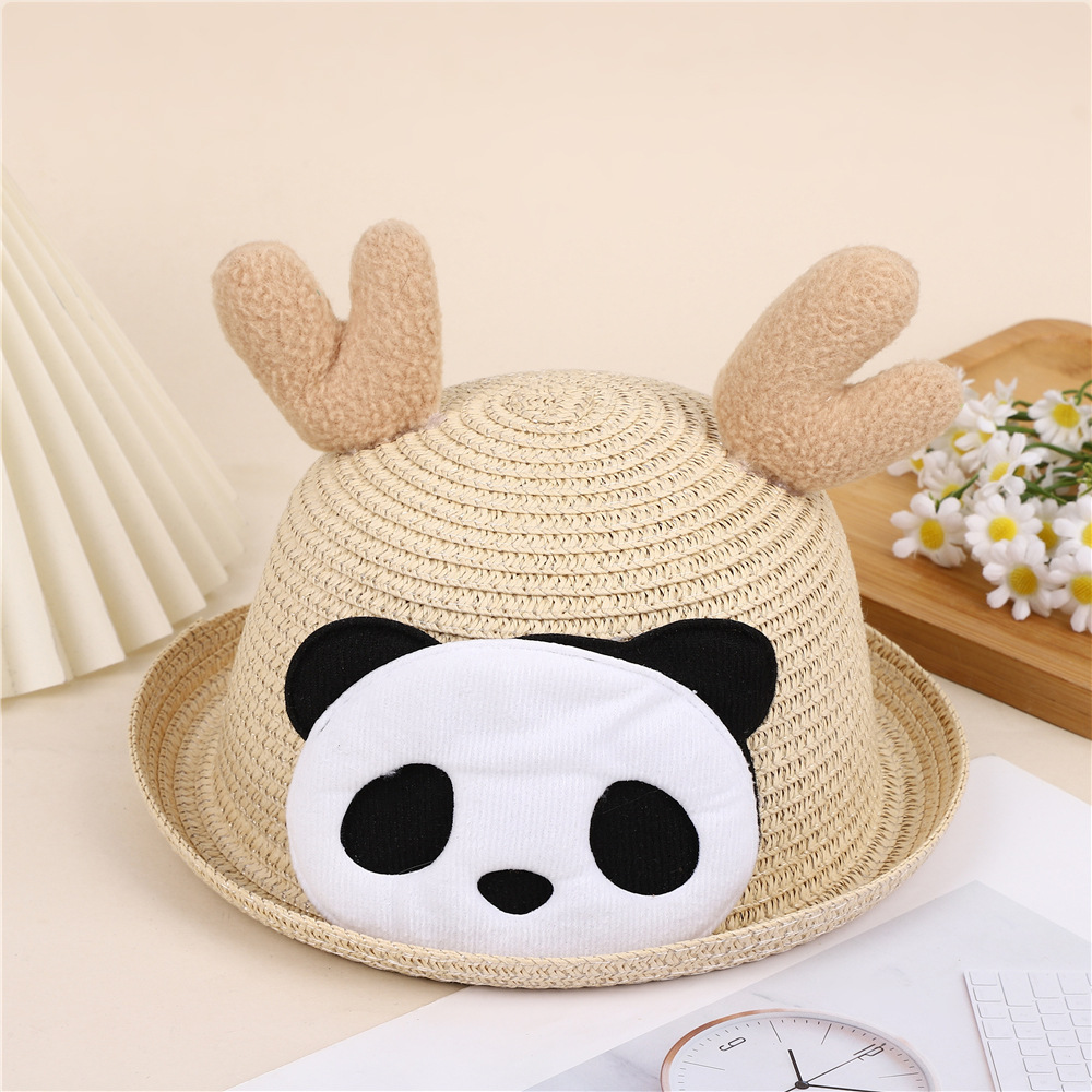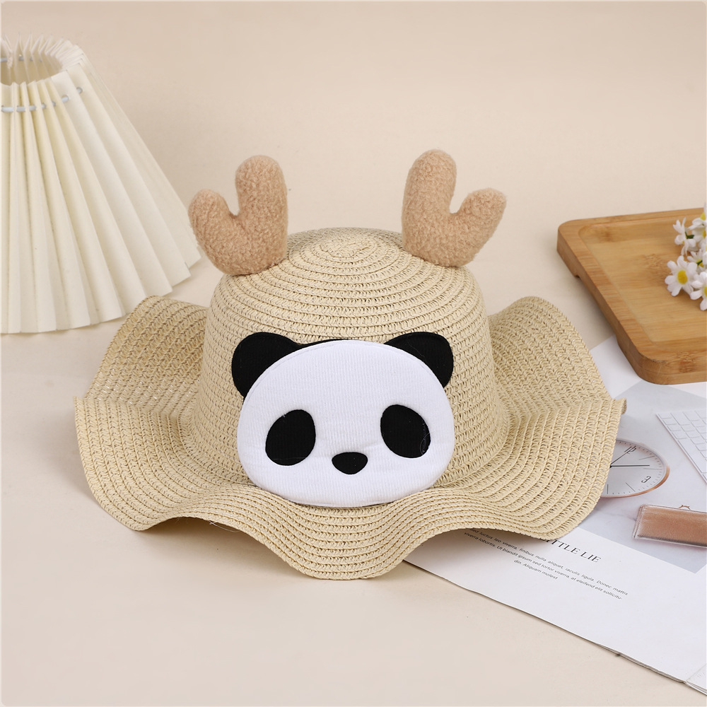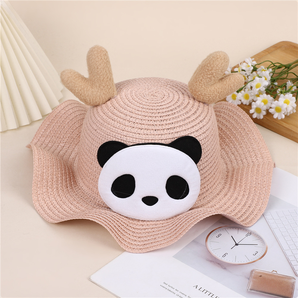 크리스마스 만화 봉제 뿔 밀짚 모자 어린이 귀여운 팬더 짠 선 스크린 모자 휴가 놀이 차양 해변 모자