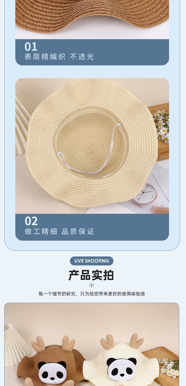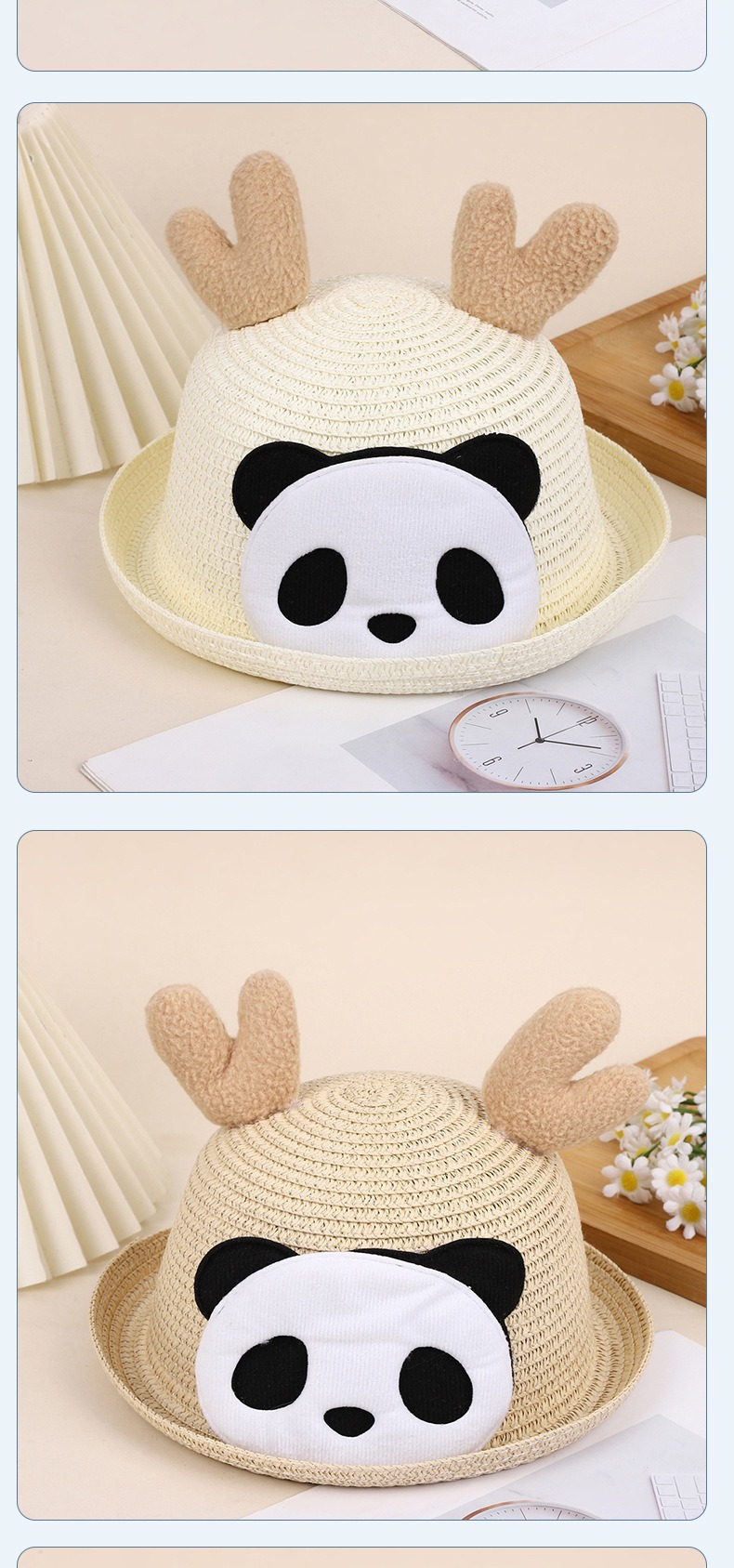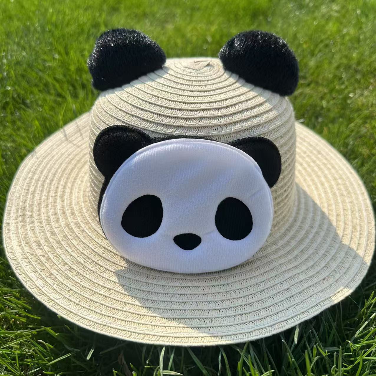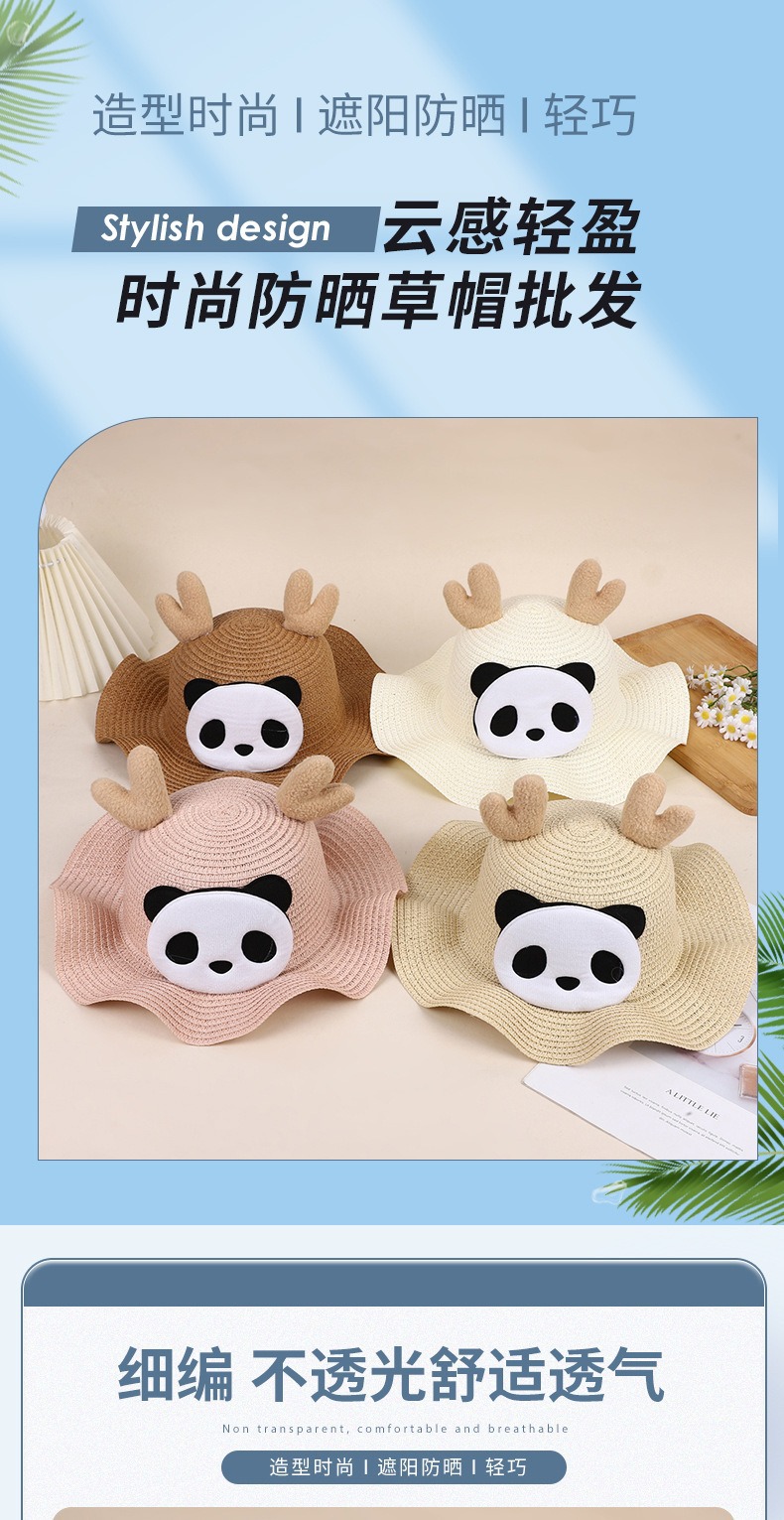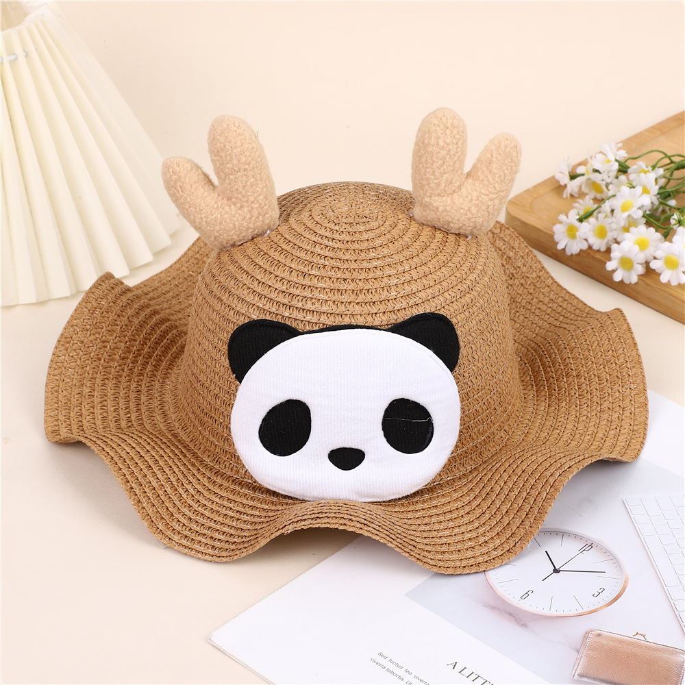 크리스마스 만화 봉제 뿔 밀짚 모자 어린이 귀여운 팬더 짠 선 스크린 모자 휴가 놀이 차양 해변 모자