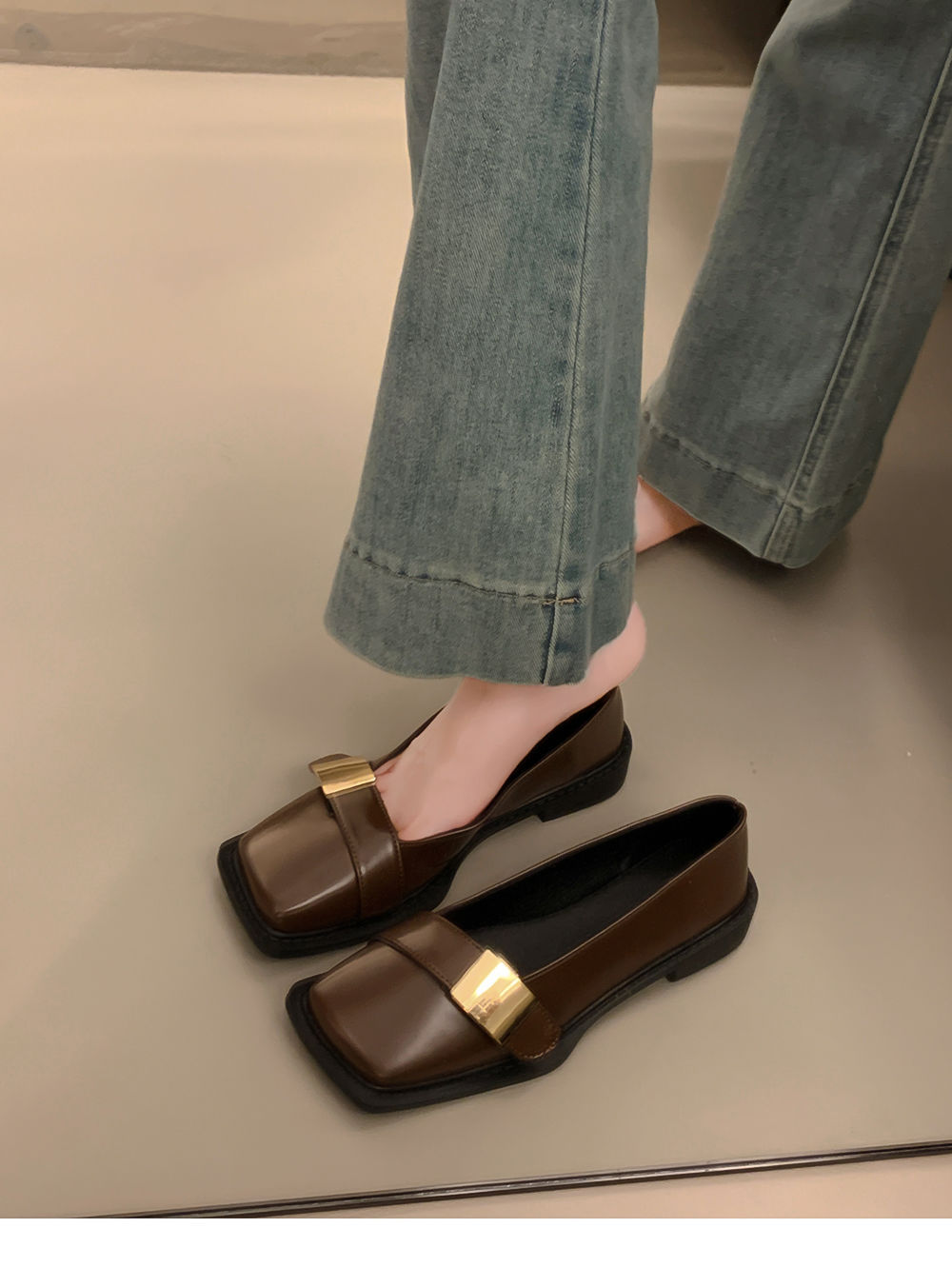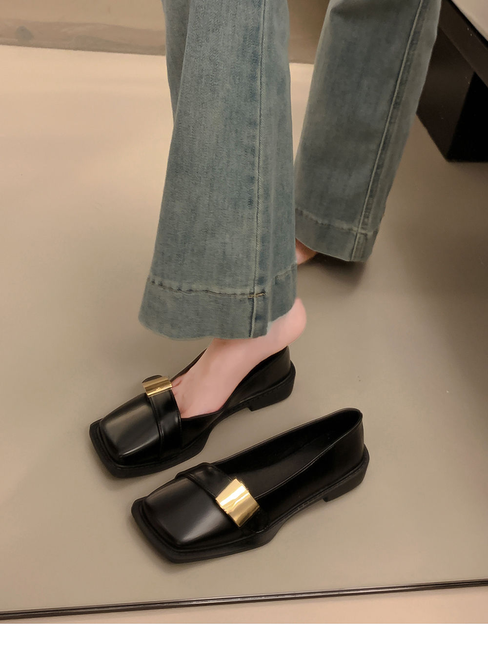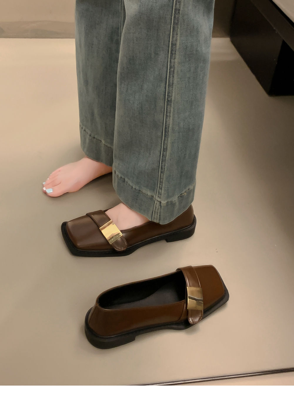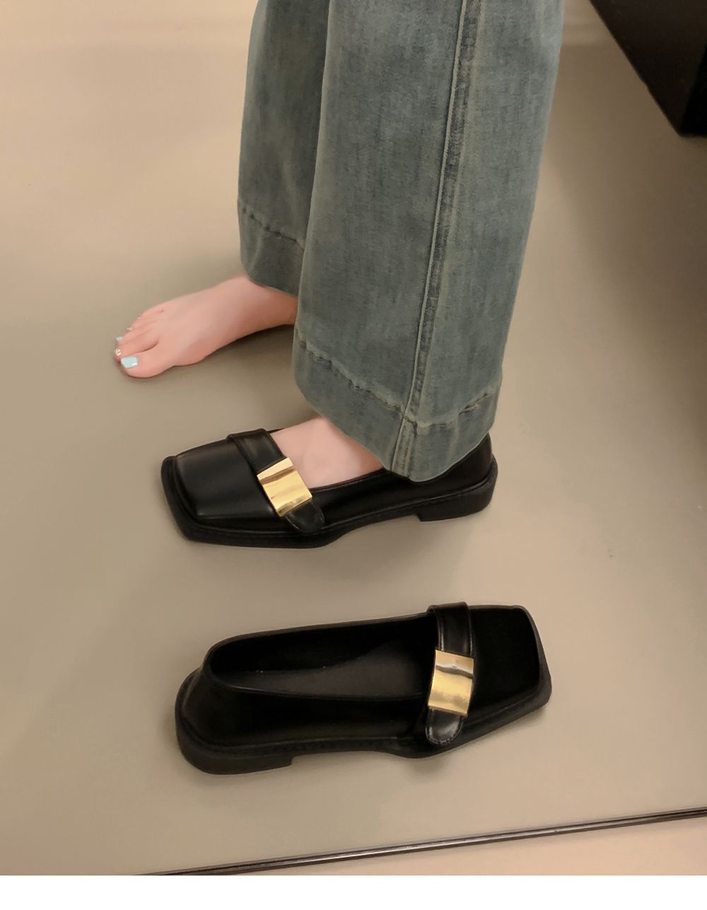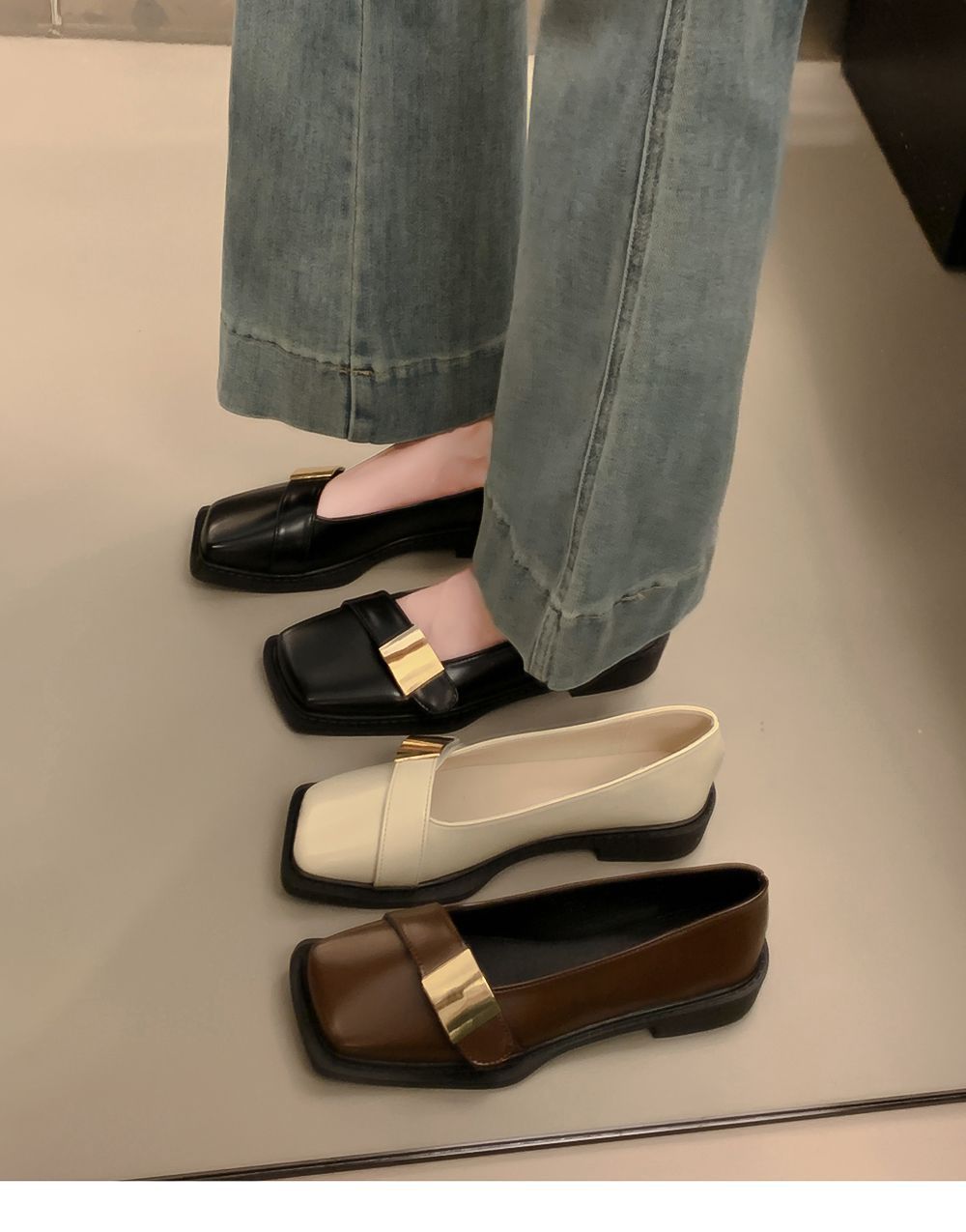 레트로 영국풍 메탈 버클 슈즈 2025 신상 스퀘어토 소프트솔 로퍼 여성 슬립온 가죽 슈즈스토어 가기