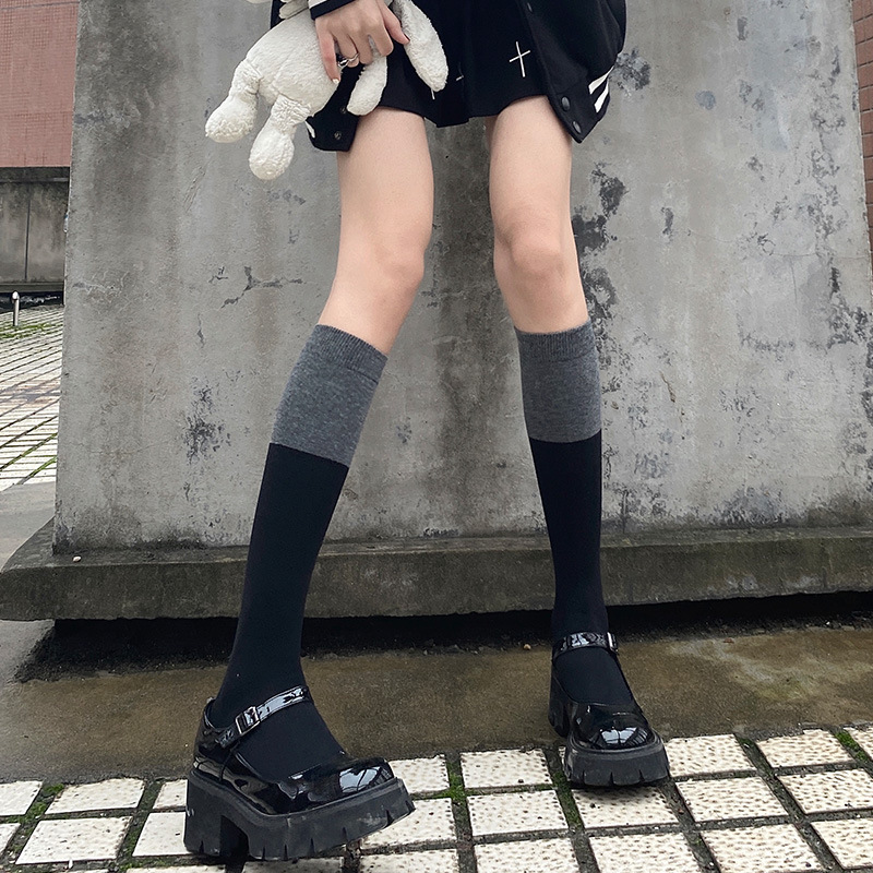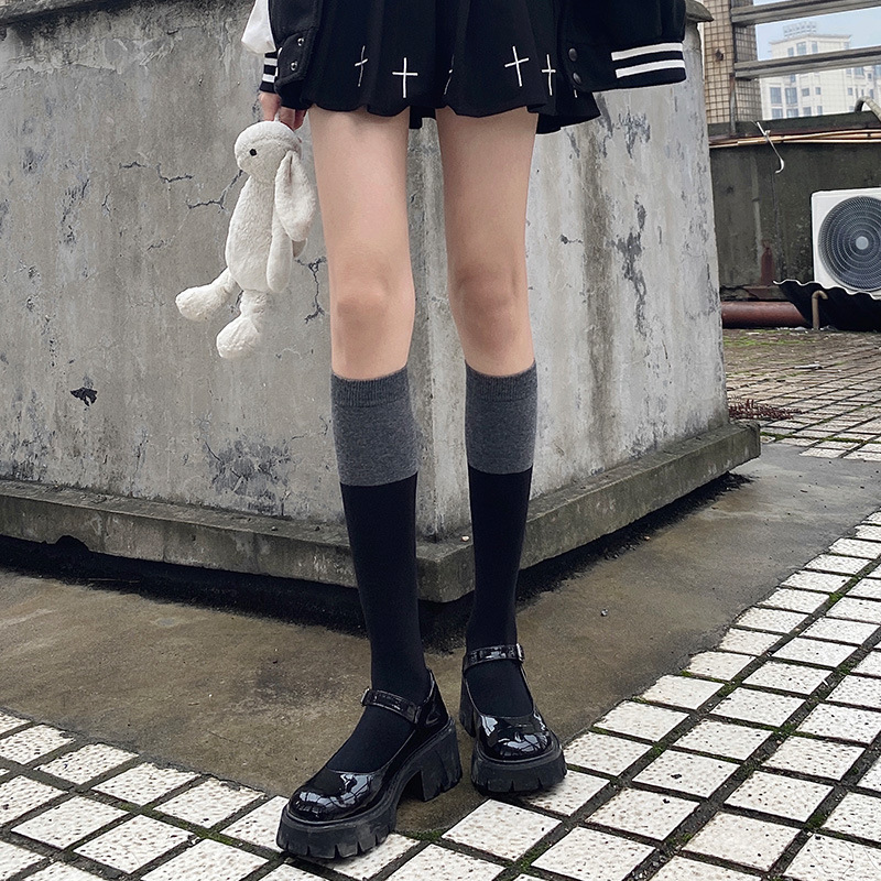 검은 색과 회색 바느질 다리/무릎 이상 양말 여성 가을 및 겨울 중간 배럴 올 매치 솔리드 컬러 Jk 트렌디 인 긴 배럴 성격스토어 가기