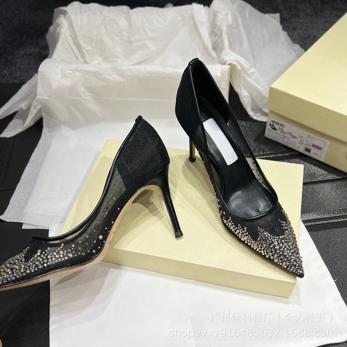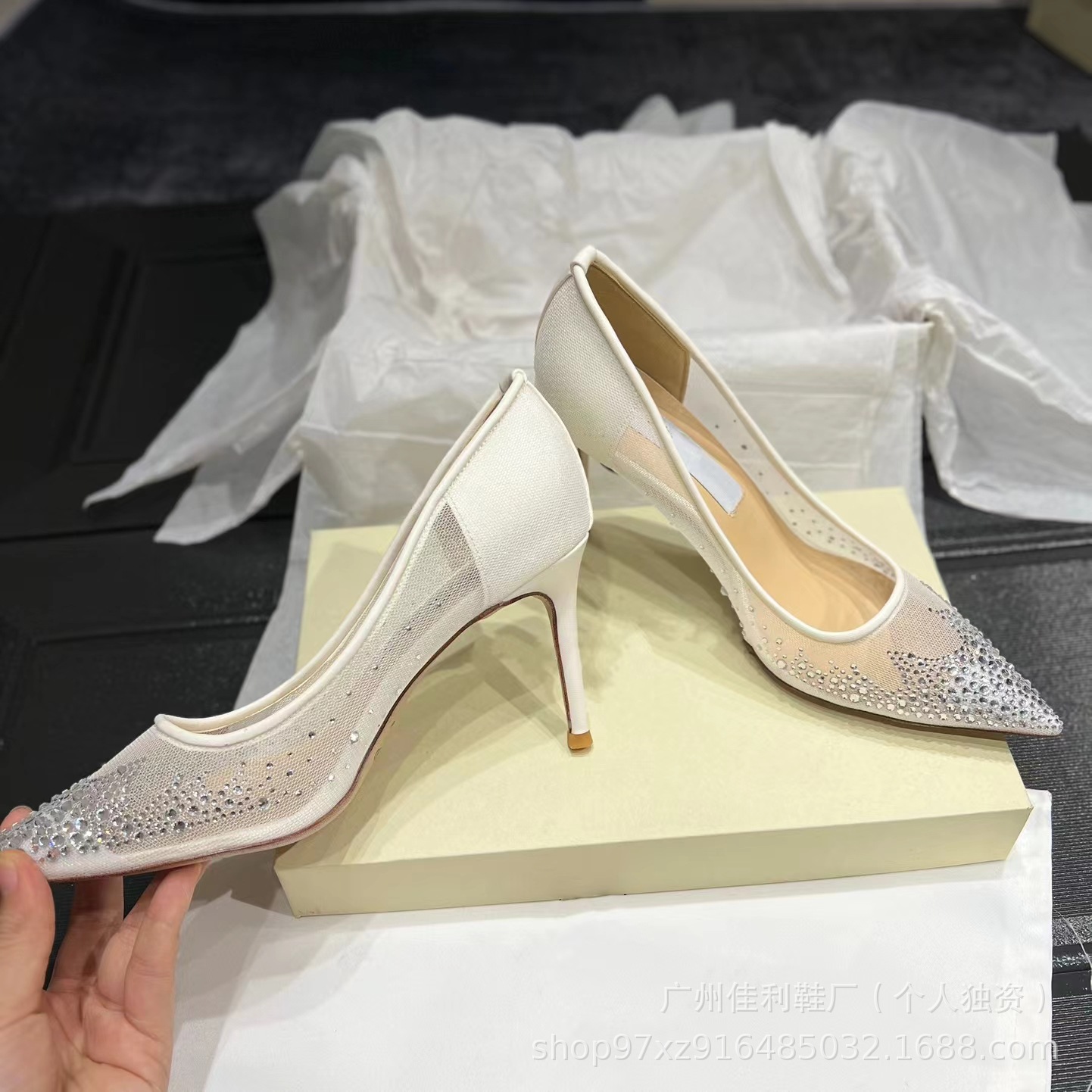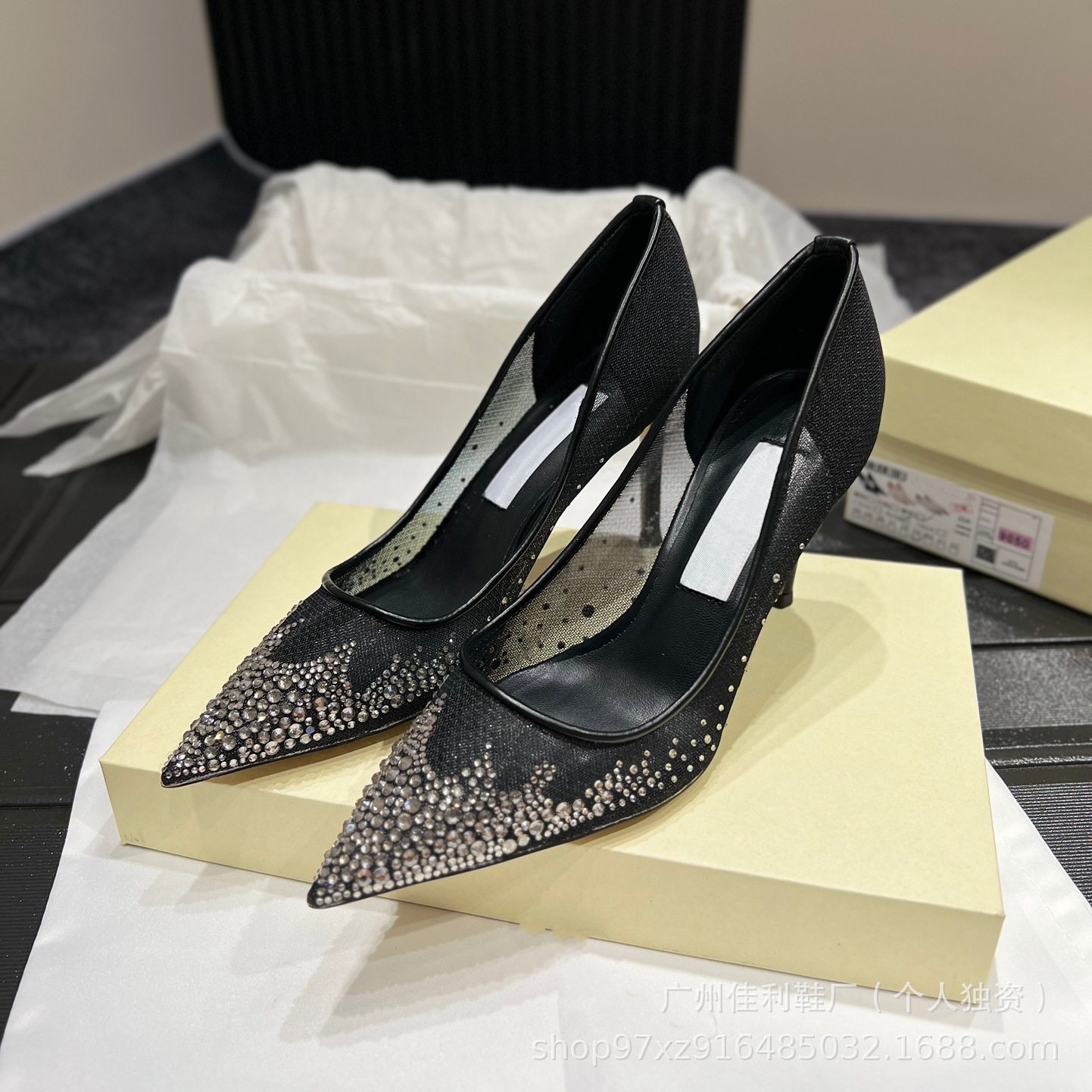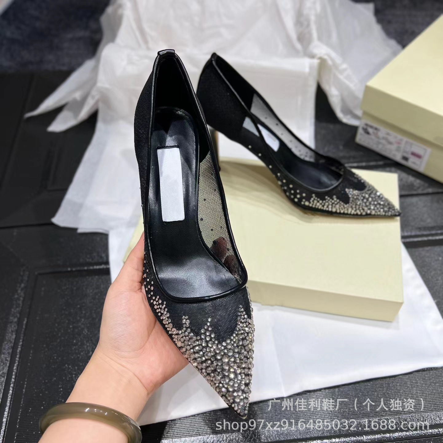 뾰족한 우아한 하이힐 여성의 2024 새로운 패션 얕은 메쉬 라인스톤 싱글 신발 통근 스틸레토 힐 하이힐 여성스토어 가기