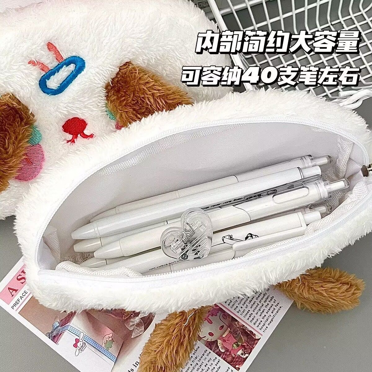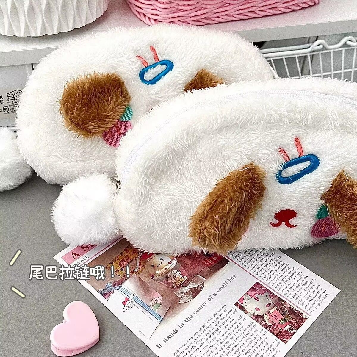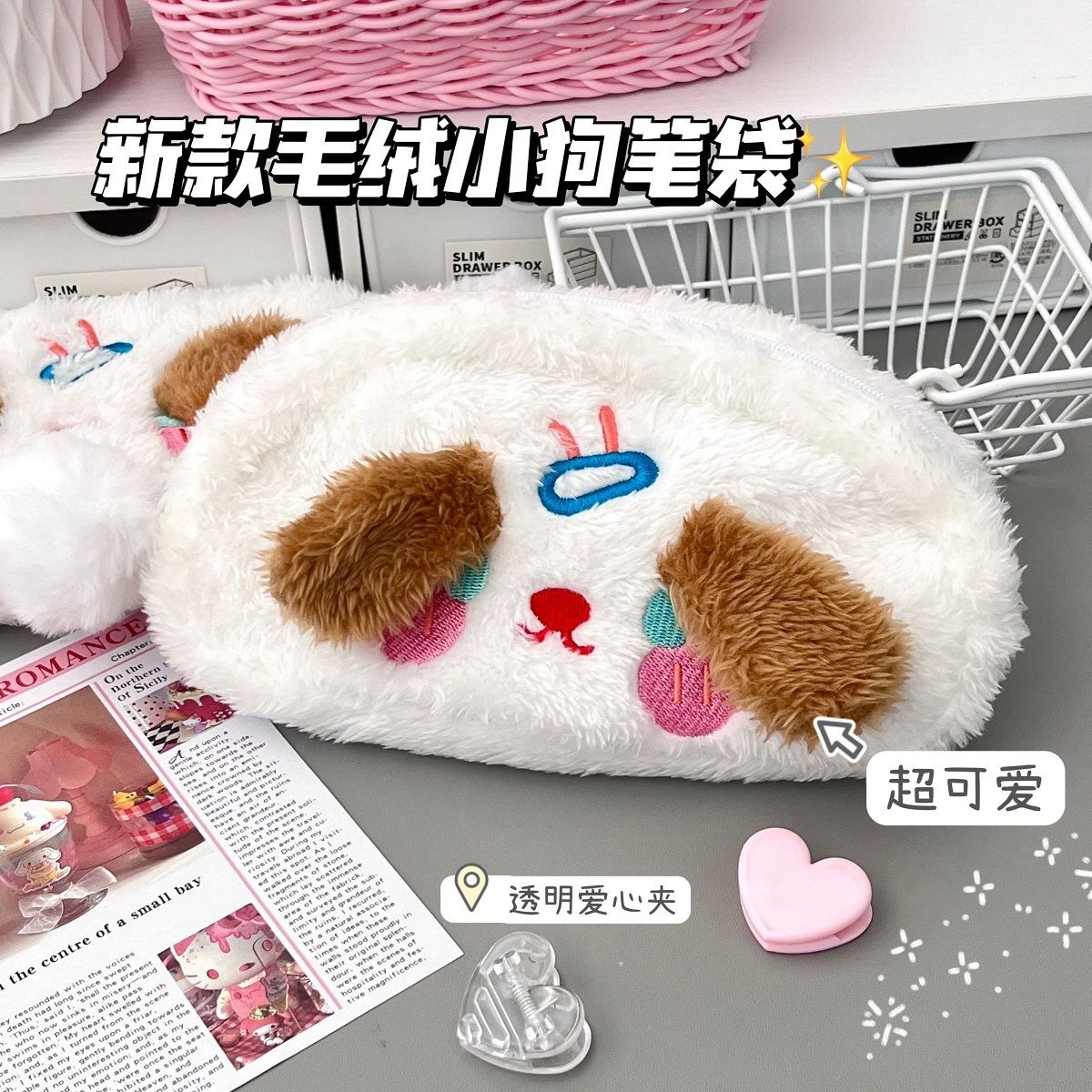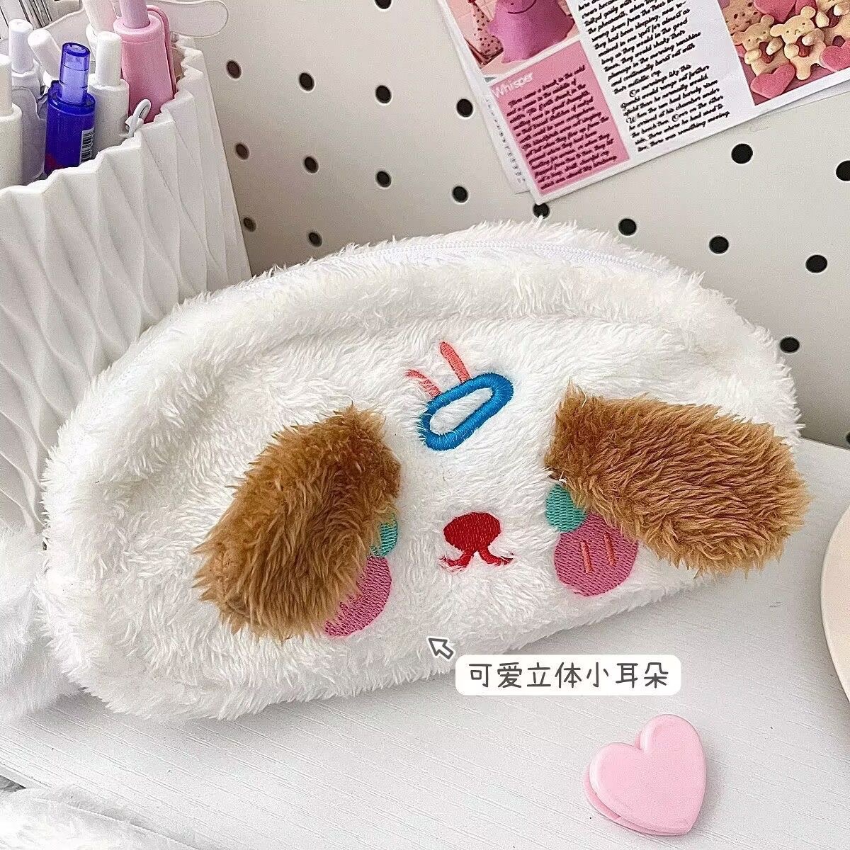 폭발성 봉제 강아지 연필 가방 Ins 스타일 높은 색상 가치 귀여운 소녀 심장 학생 문구 보관 가방 화장품 가방
