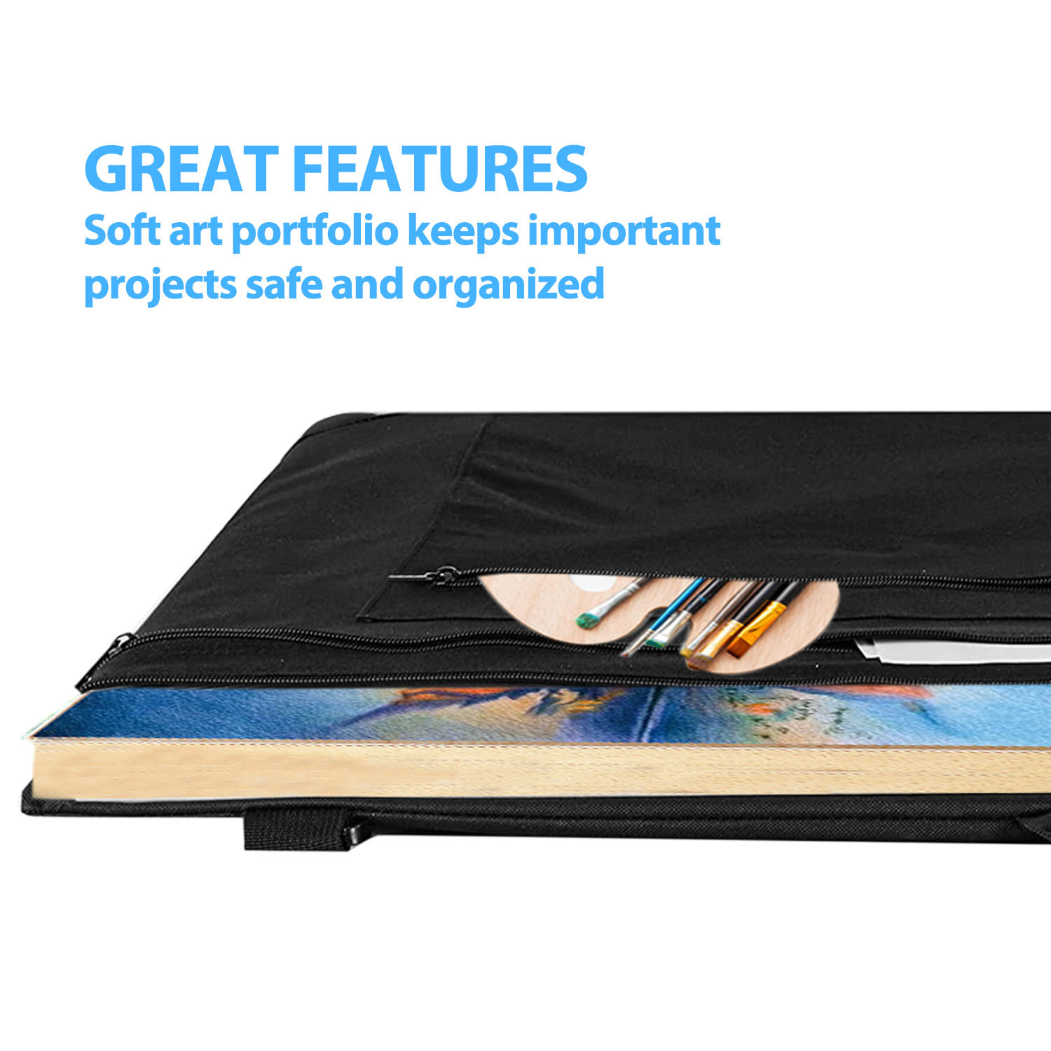 【多个口袋】我们的组合艺术包配有 3 个拉链口袋,可有效整理您的艺术品、用品和配件。 这款艺术包可以让艺术家将不同的作品或材料分开,最大的口袋放置绘图板,第二个口袋放绘图纸,第三个放绘画书籍、刷子、配件等等。