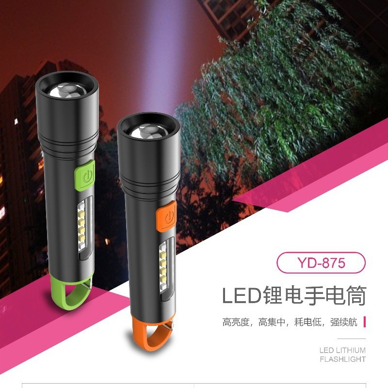 Jiage 브랜드 YD-875 리튬 배터리 LED 충전식 텔레스코픽 조절 멀티 기어 장거리 휴대용 조명 손전등