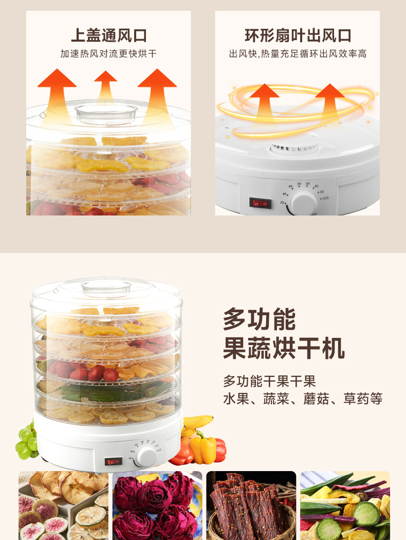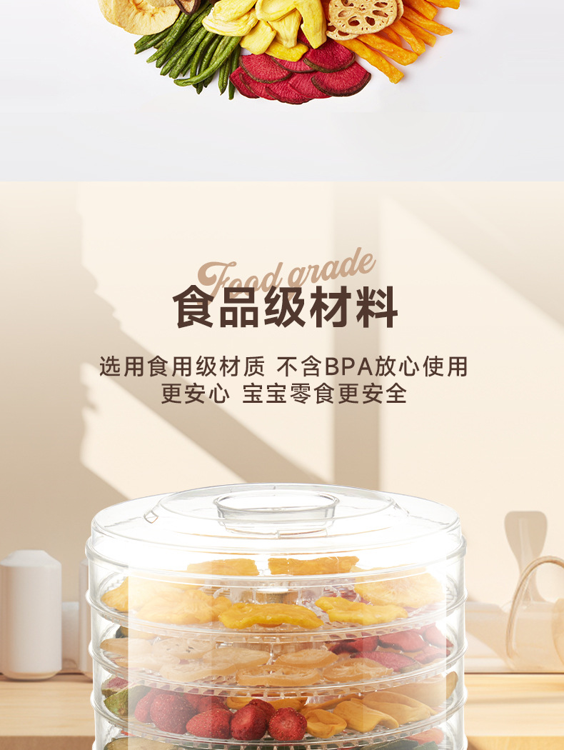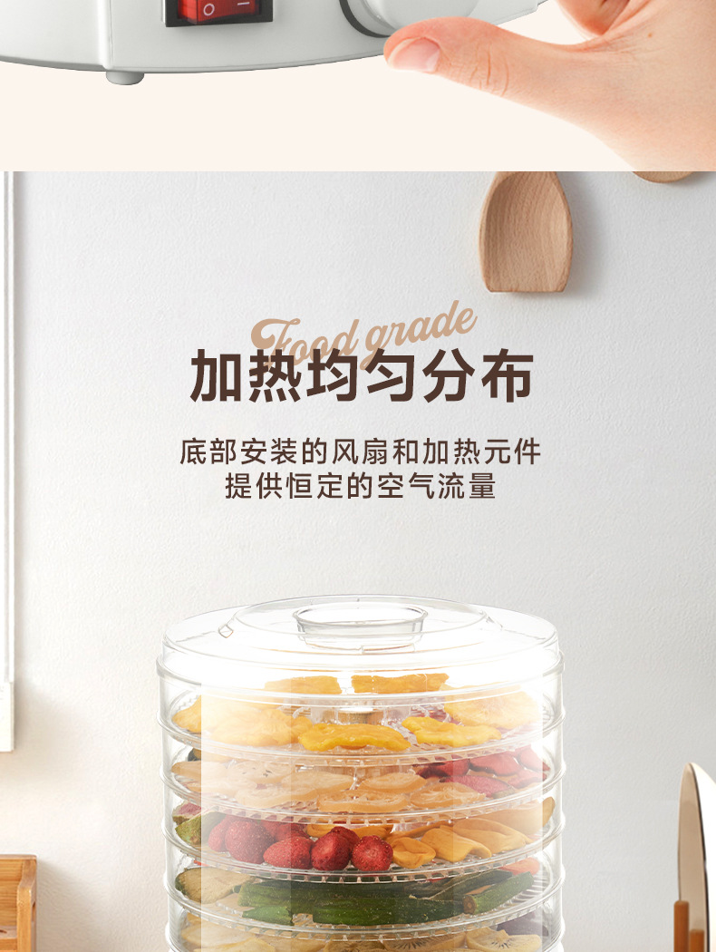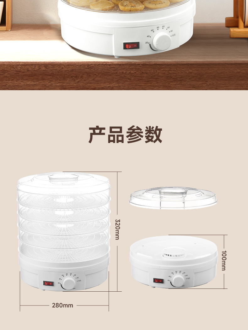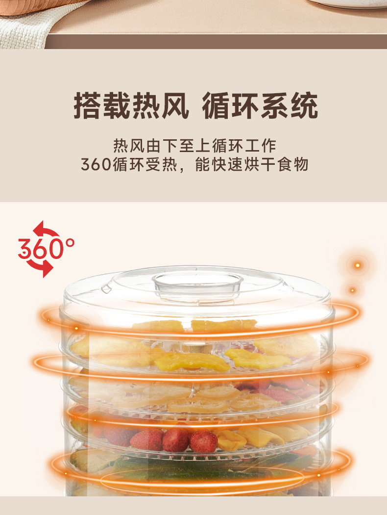 特点5层可调式格盘,安静贴心;360°热风循环风干,食品级材质,安全放心。OEM代工、定制、跨境供货。量大优惠联系客服