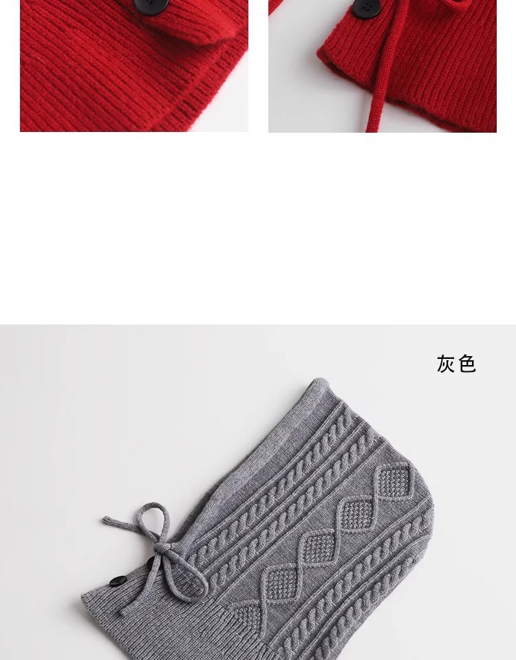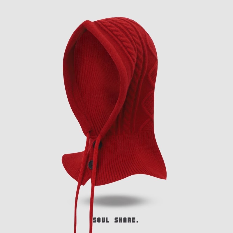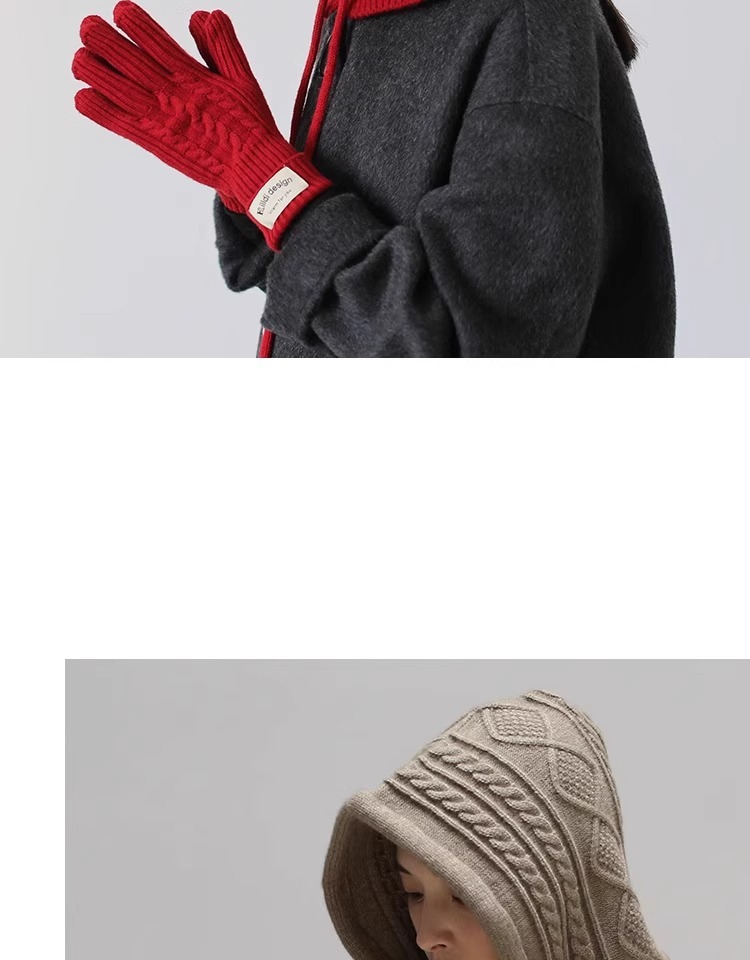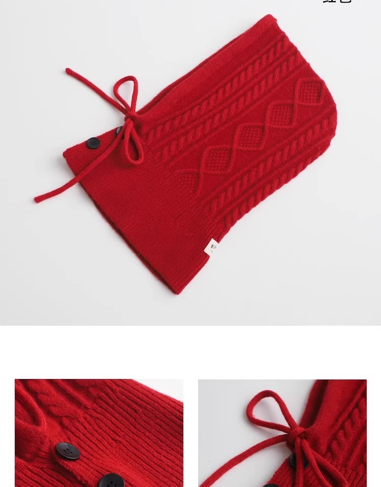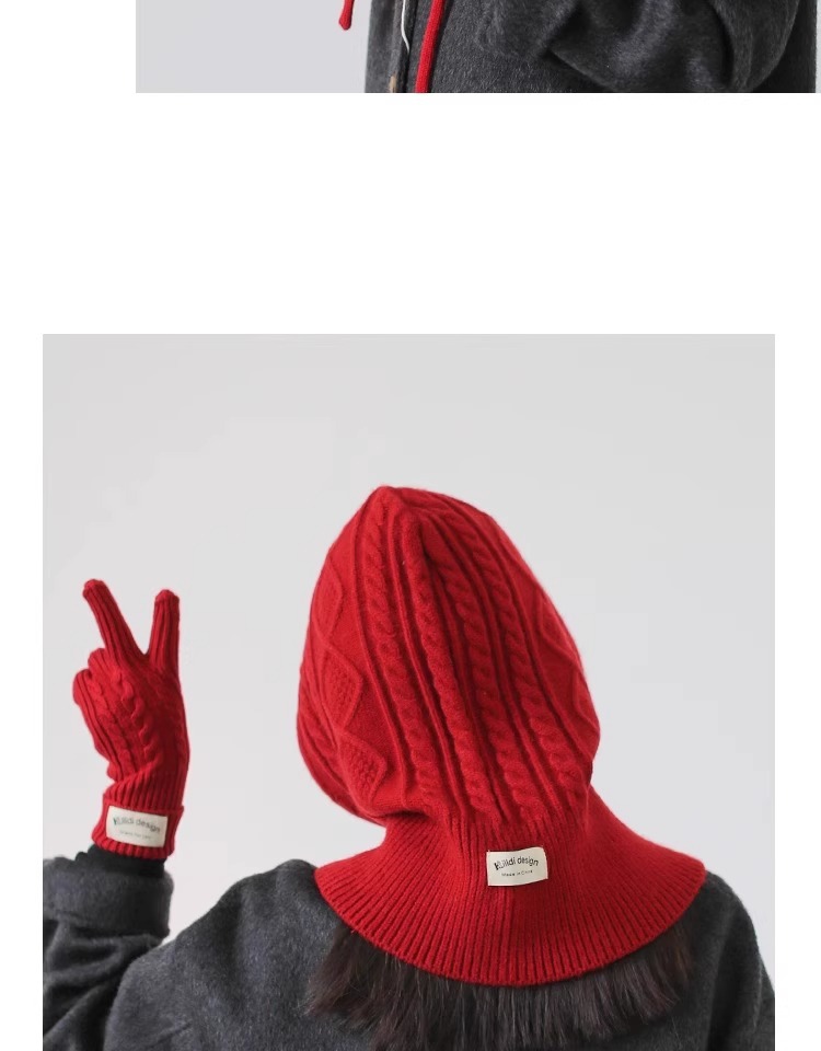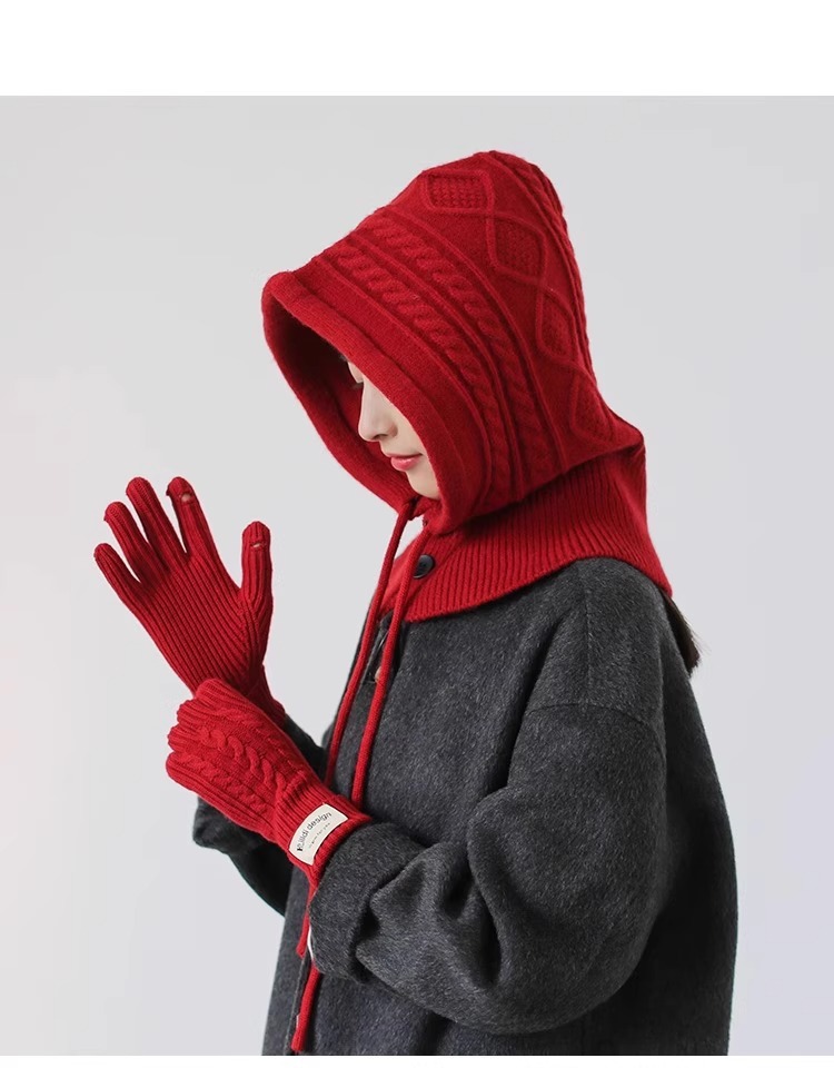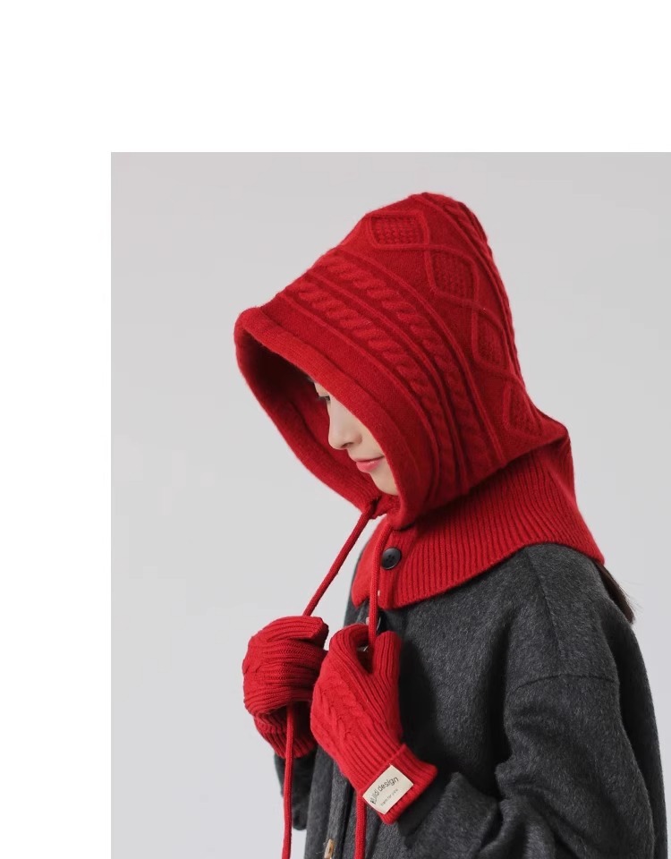 한국 트위스트 텍스처 니트 헤드 기어 가을과 겨울 귀 보호 큰 머리 둘레 모자 스카프 장갑 하나의 투피스 레드
