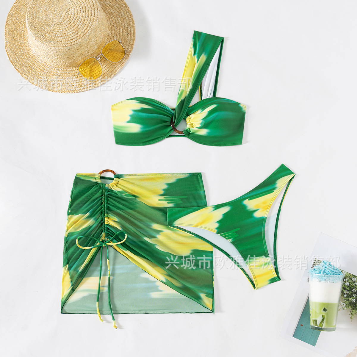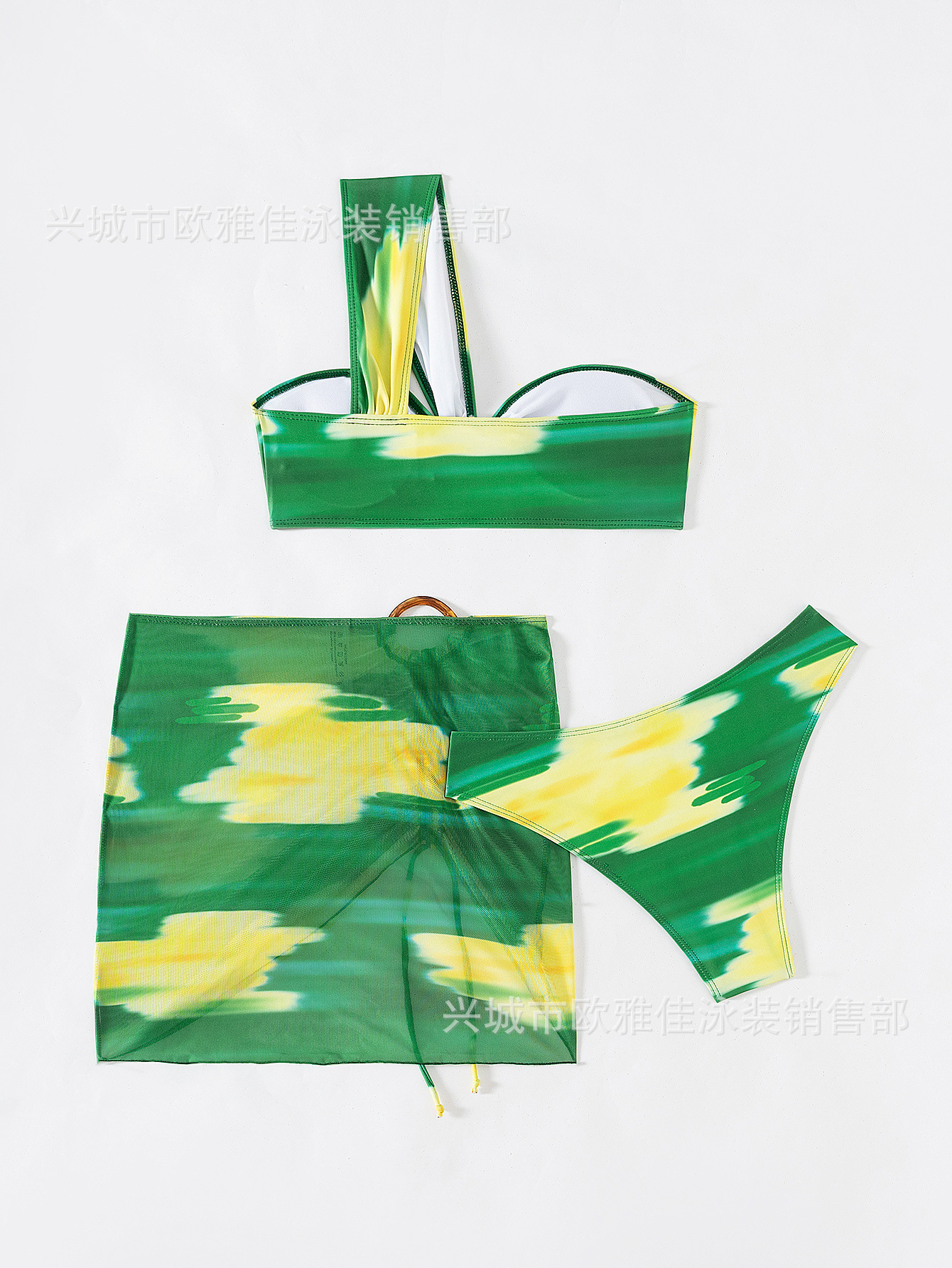 유럽과 미국의 스플릿 섹시 프린트 비키니 메쉬 스커트 스트랩리스 원 숄더 수영복