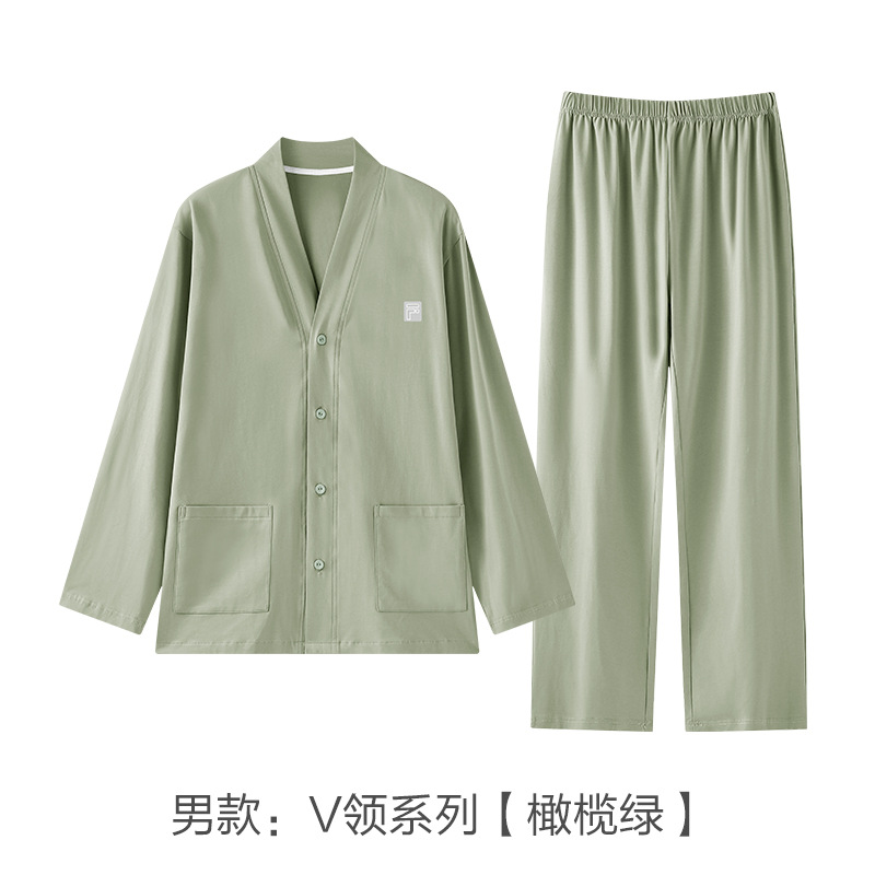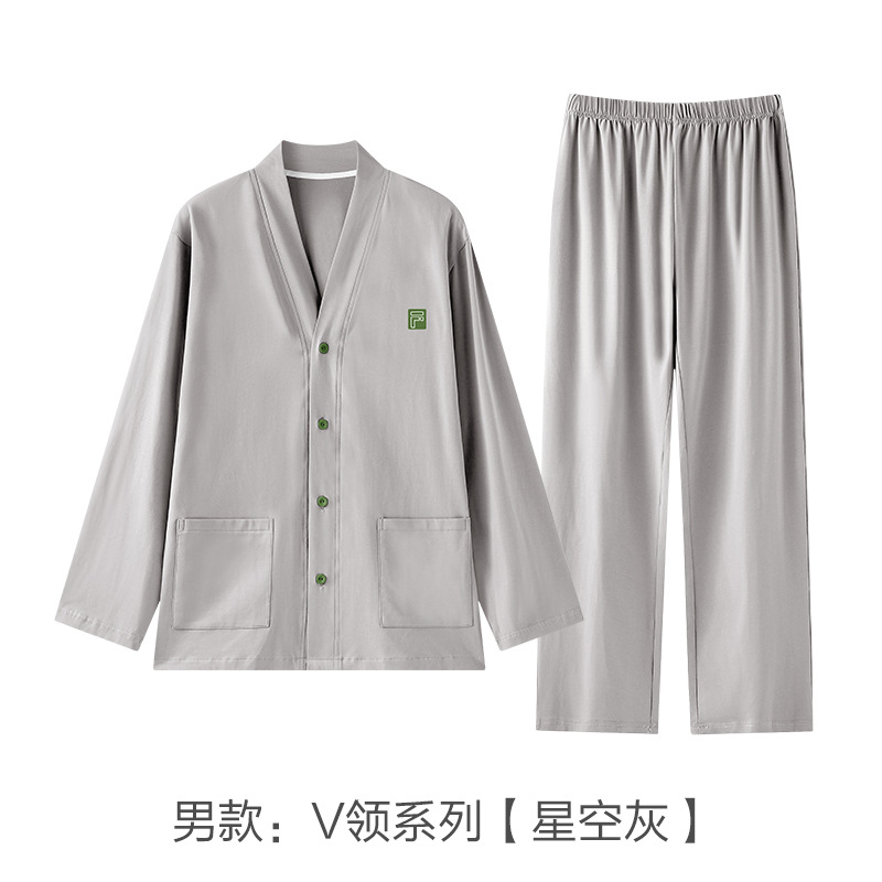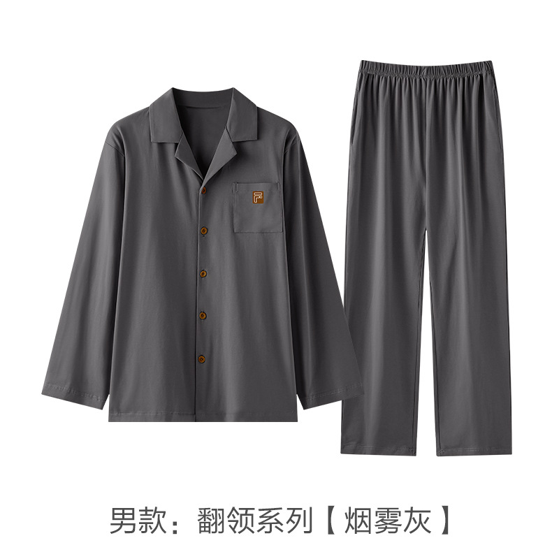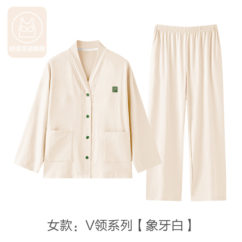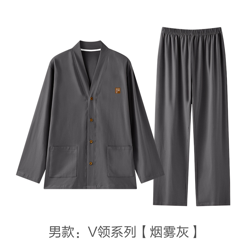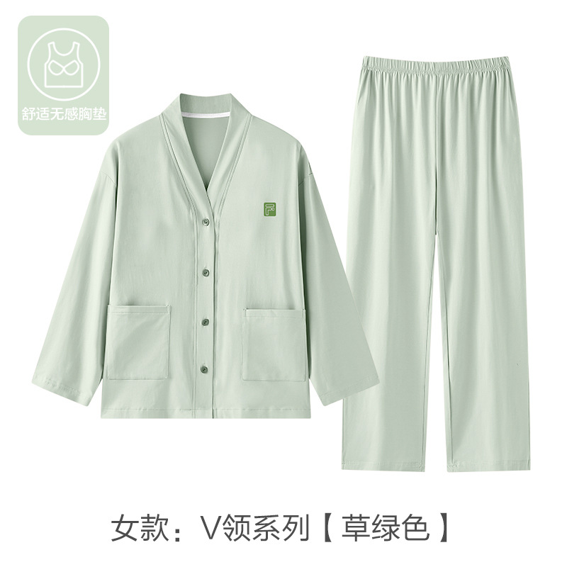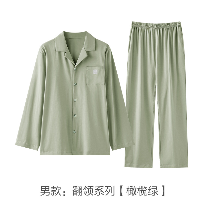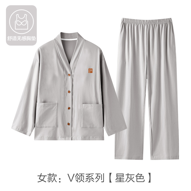 커플용 순면 홈웨어 봄 가을 여성용 가슴 패드 포함 긴팔 가디건 얇은 단색 남녀 잠옷 세트