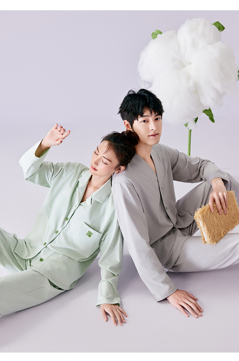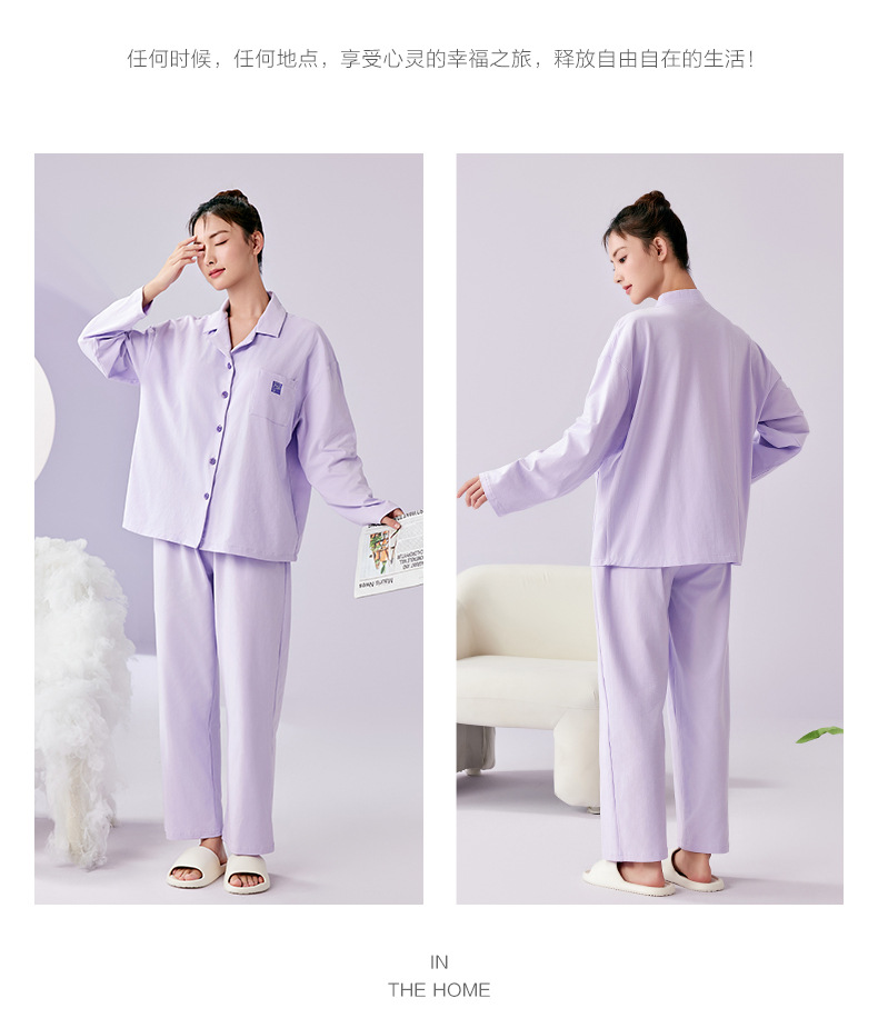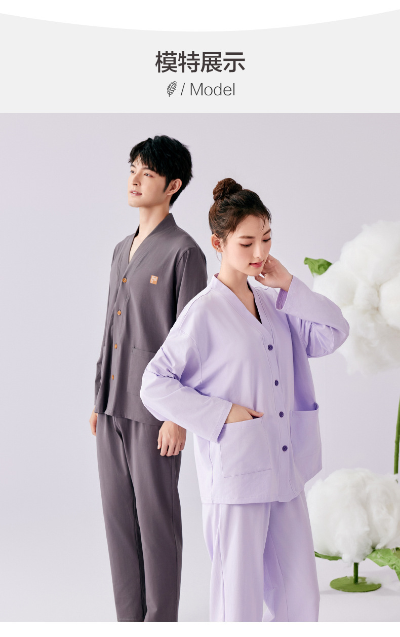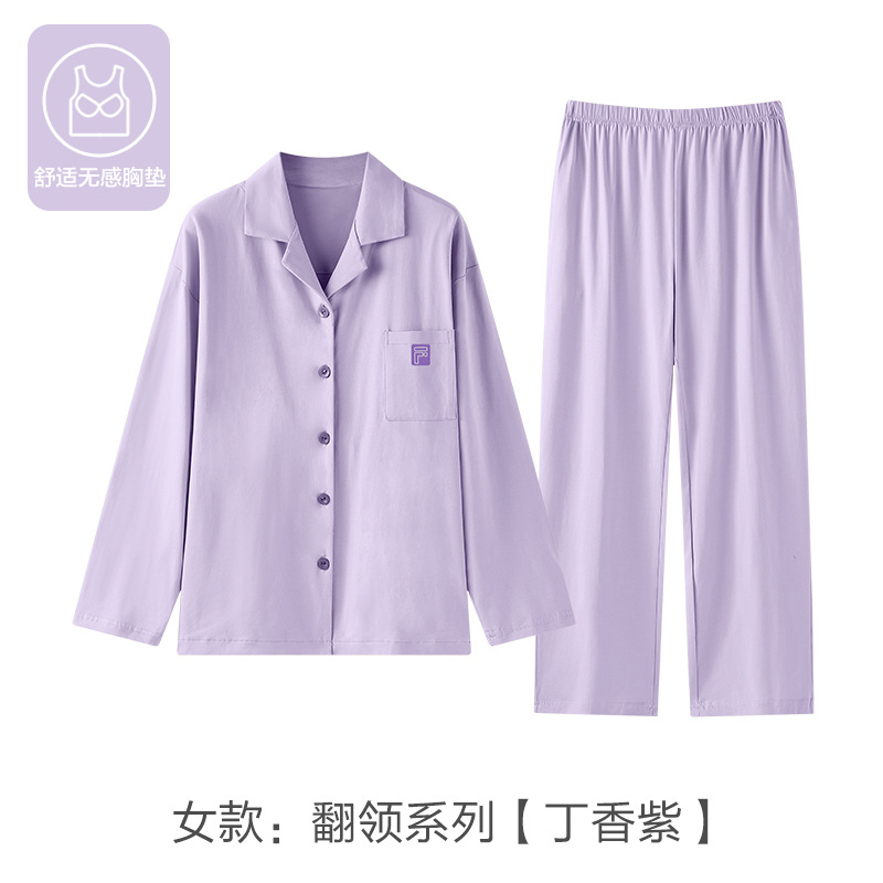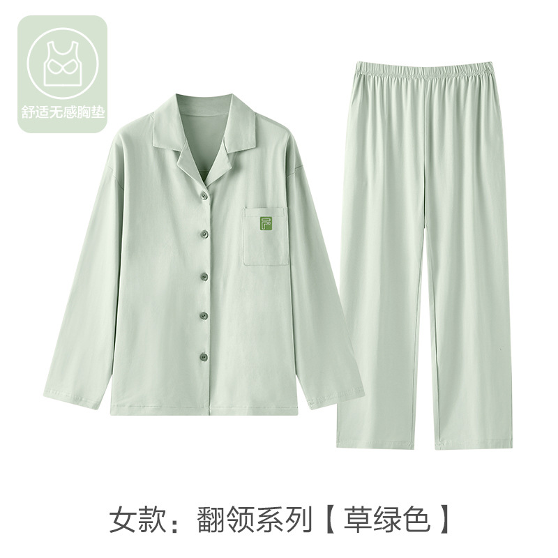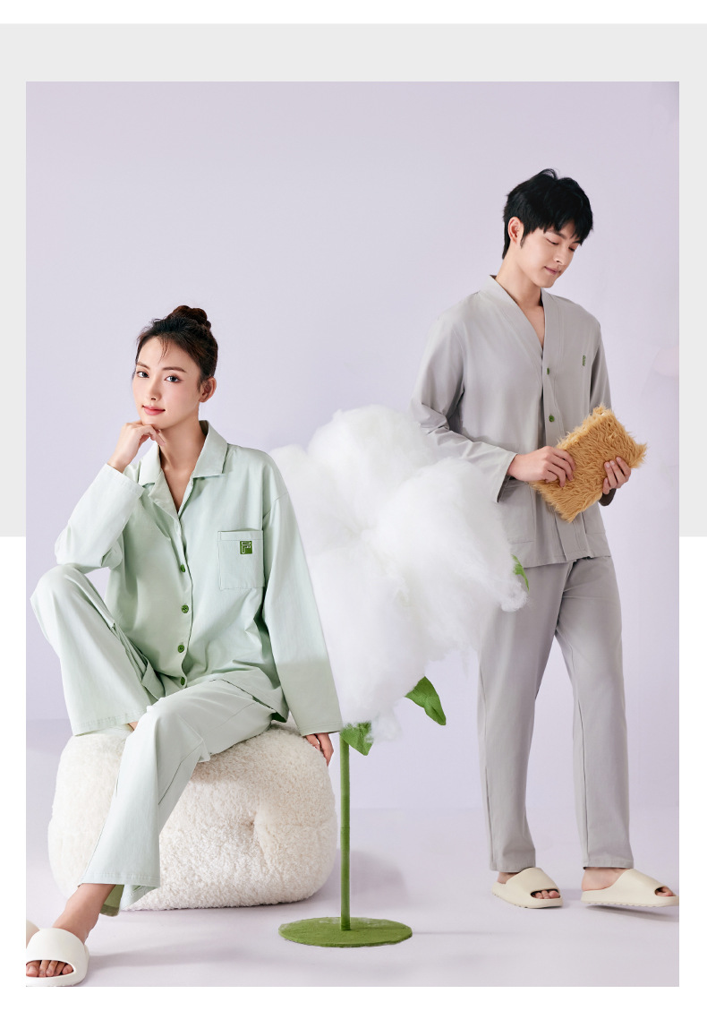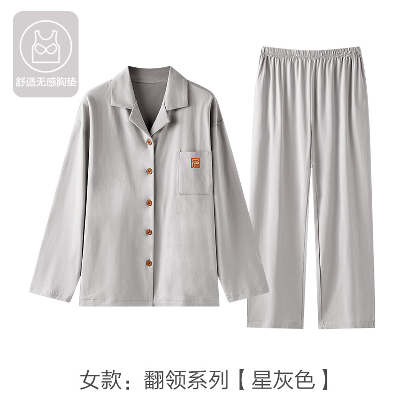 커플용 순면 홈웨어 봄 가을 여성용 가슴 패드 포함 긴팔 가디건 얇은 단색 남녀 잠옷 세트스토어 가기