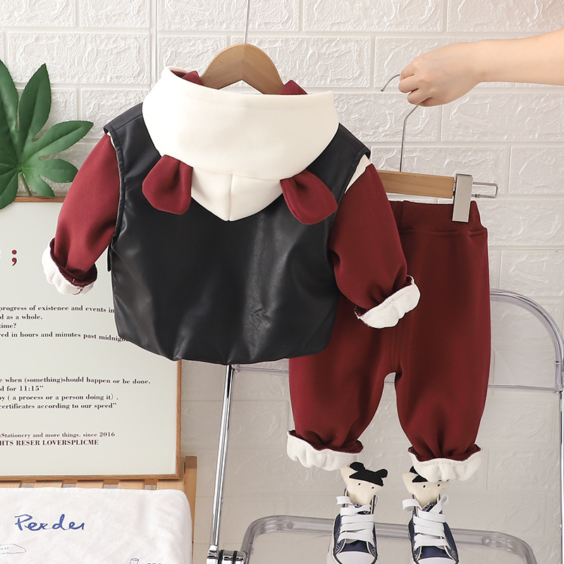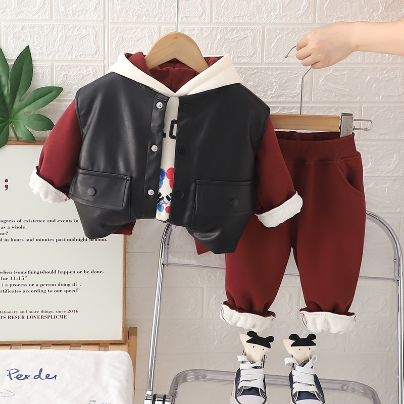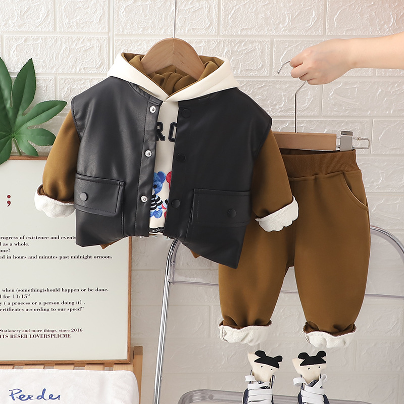 2024 소년 후드 만화 가죽 자켓 유아 새 옷 가을과 겨울 3 피스 패션 공장 도매스토어 가기