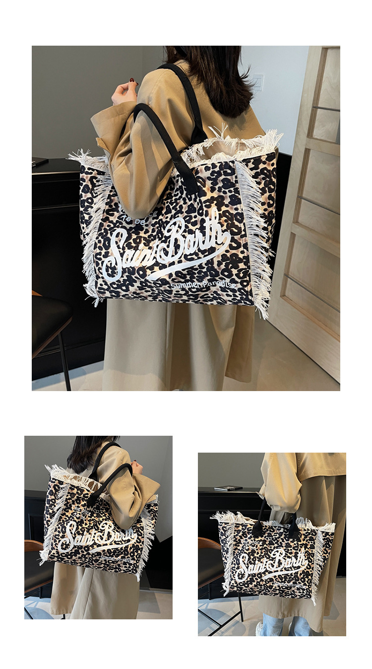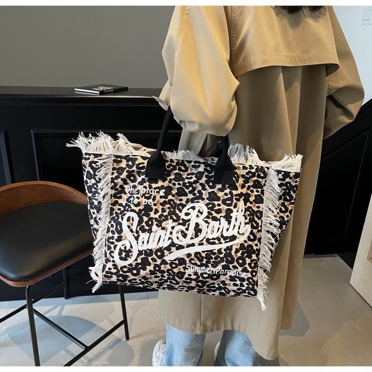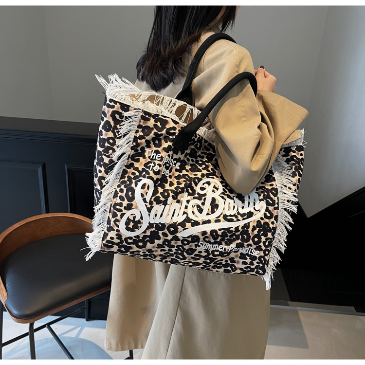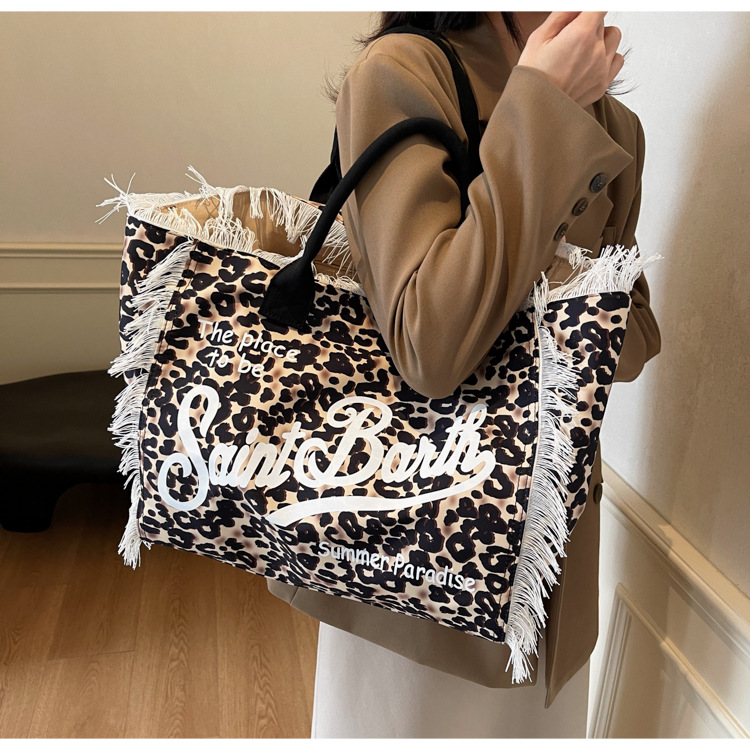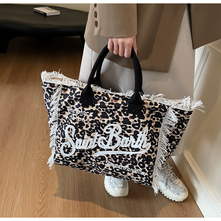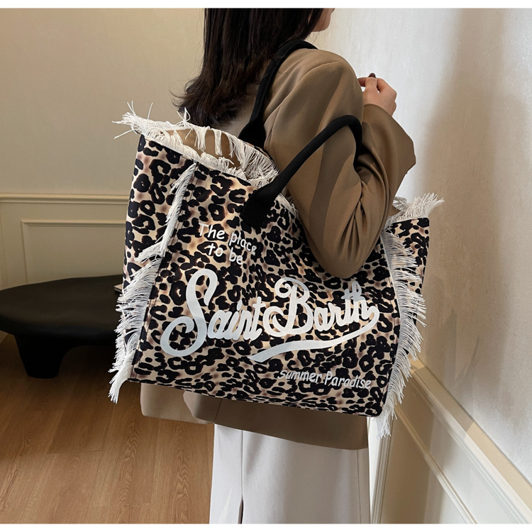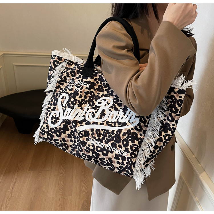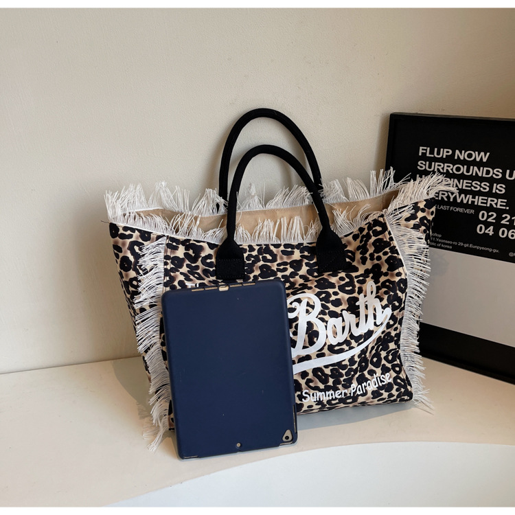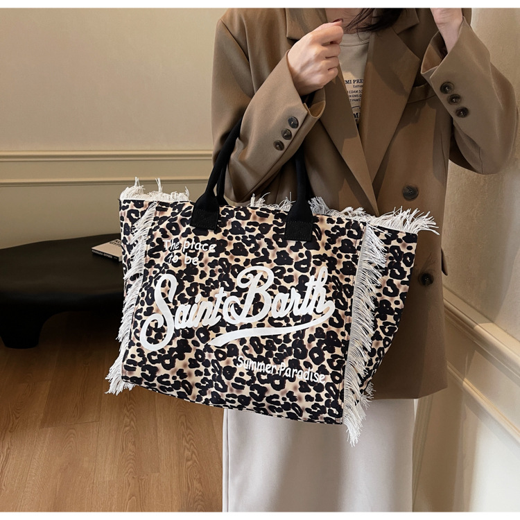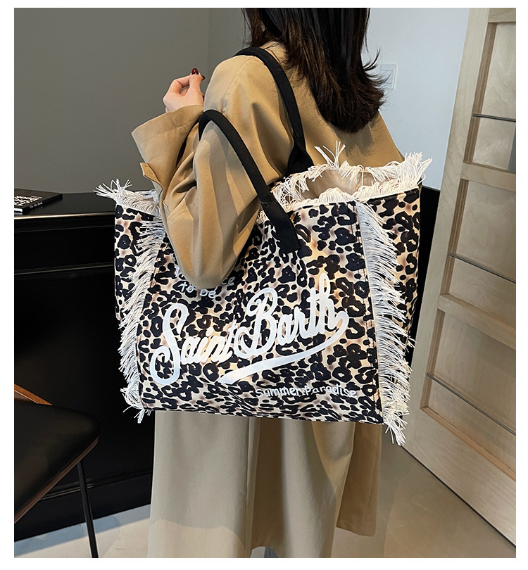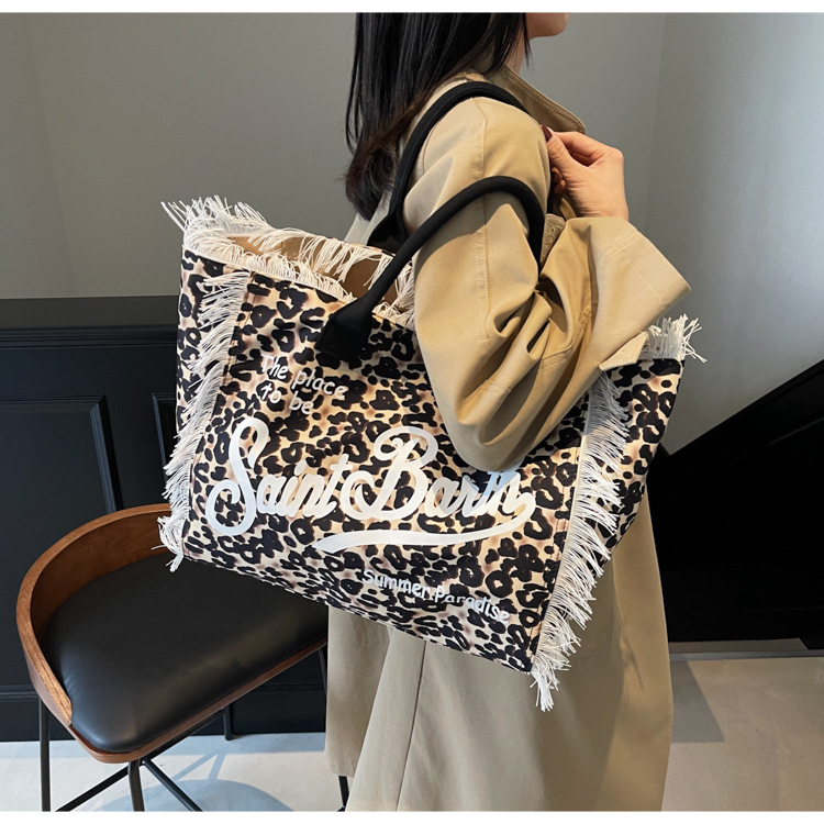 유럽과 미국의 새로운 여성 대용량 레저 여행 레오파드 프린트 캔버스 수제 태슬 핸드백 토트 백