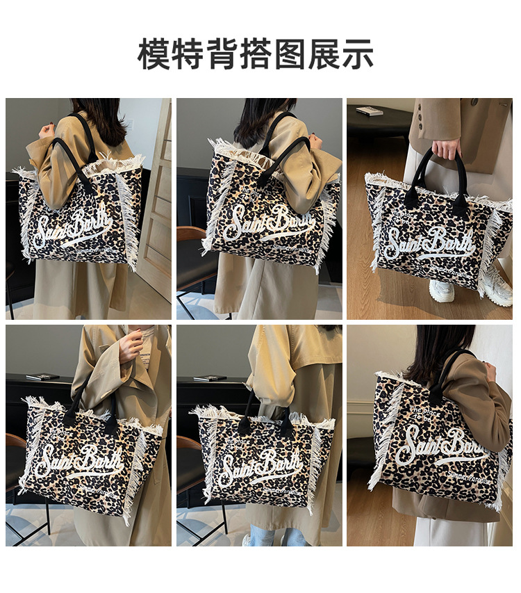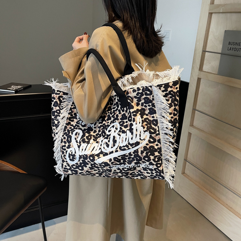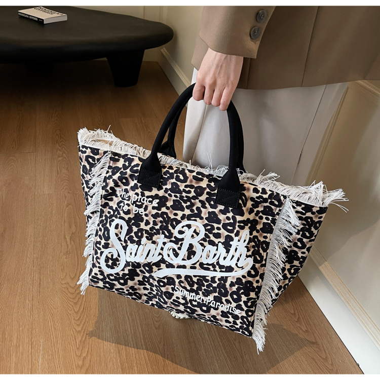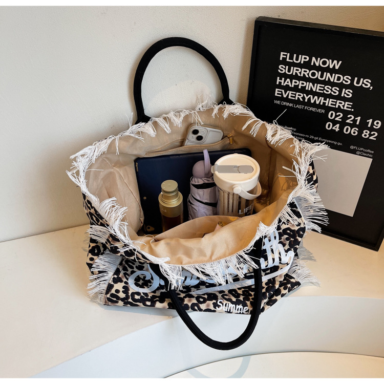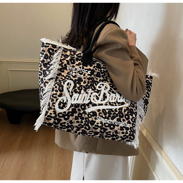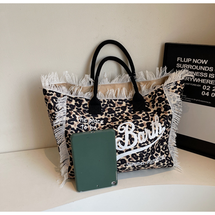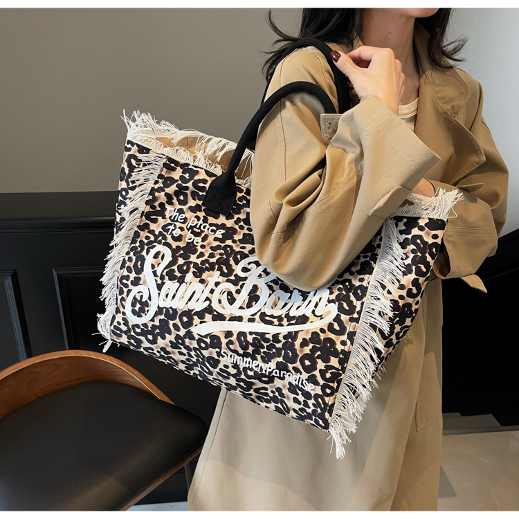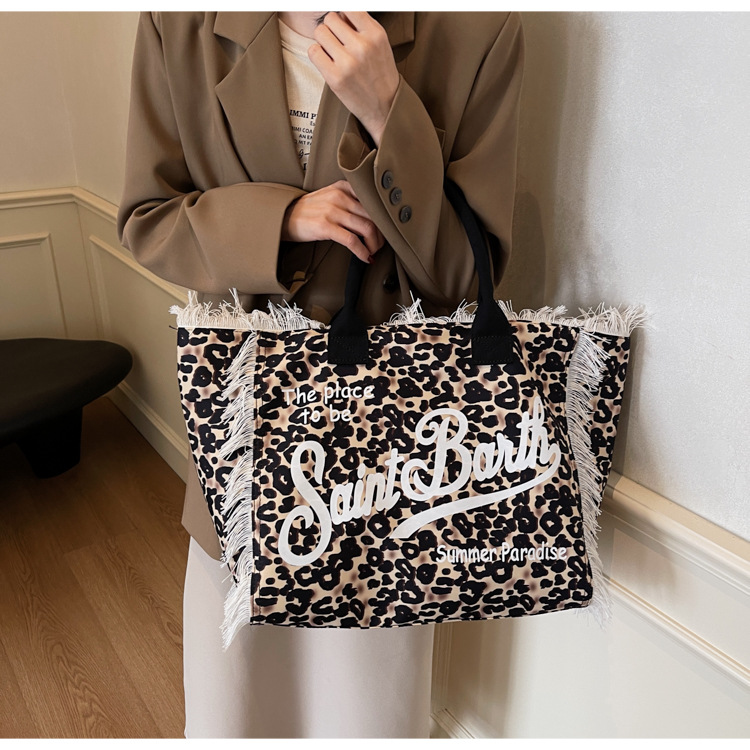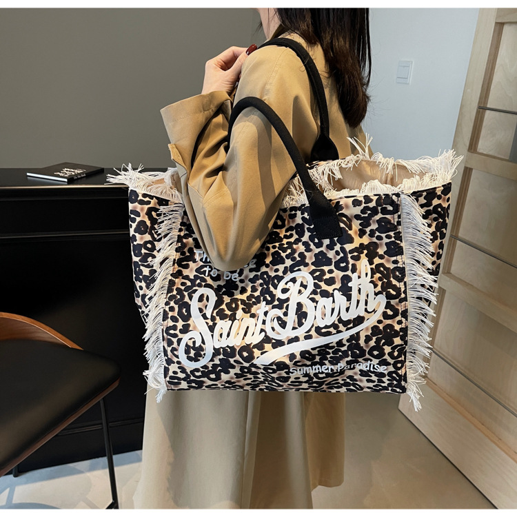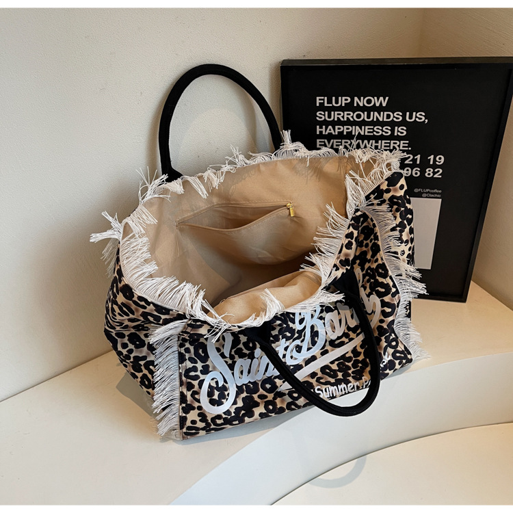 유럽과 미국의 새로운 여성 대용량 레저 여행 레오파드 프린트 캔버스 수제 태슬 핸드백 토트 백
