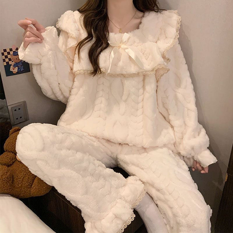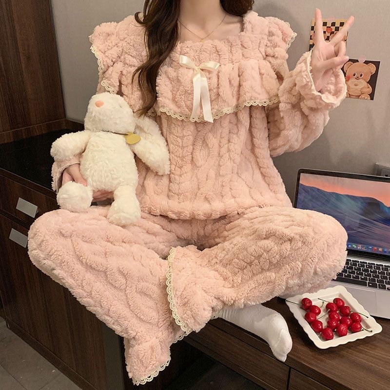 두꺼운 파자마를 기모 국경 간 라이브 폭발 여성 산호 양털 봉제 스위트 스퀘어 칼라 홈 의류 여성 세트