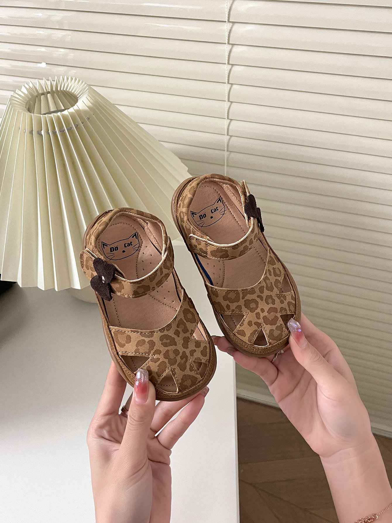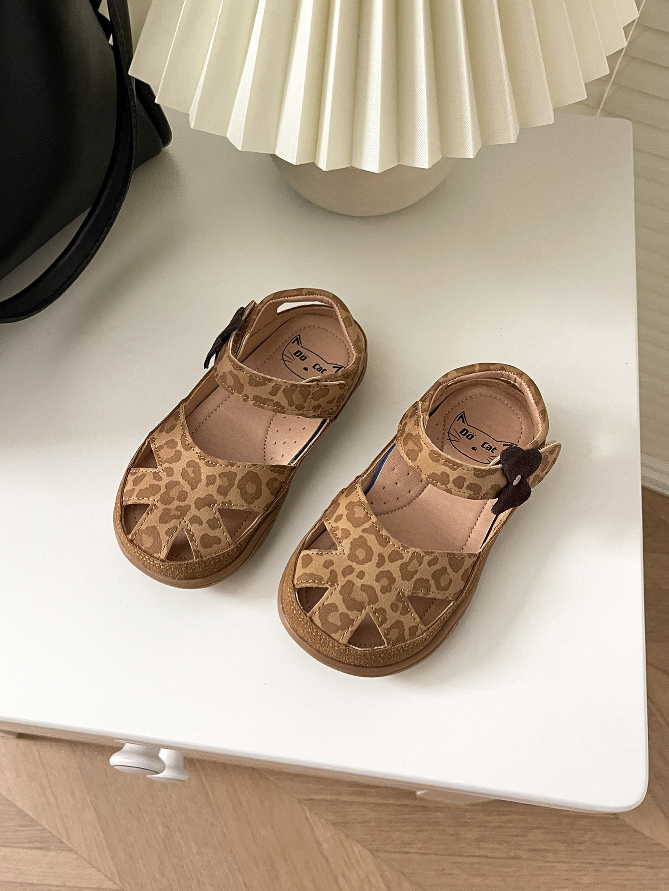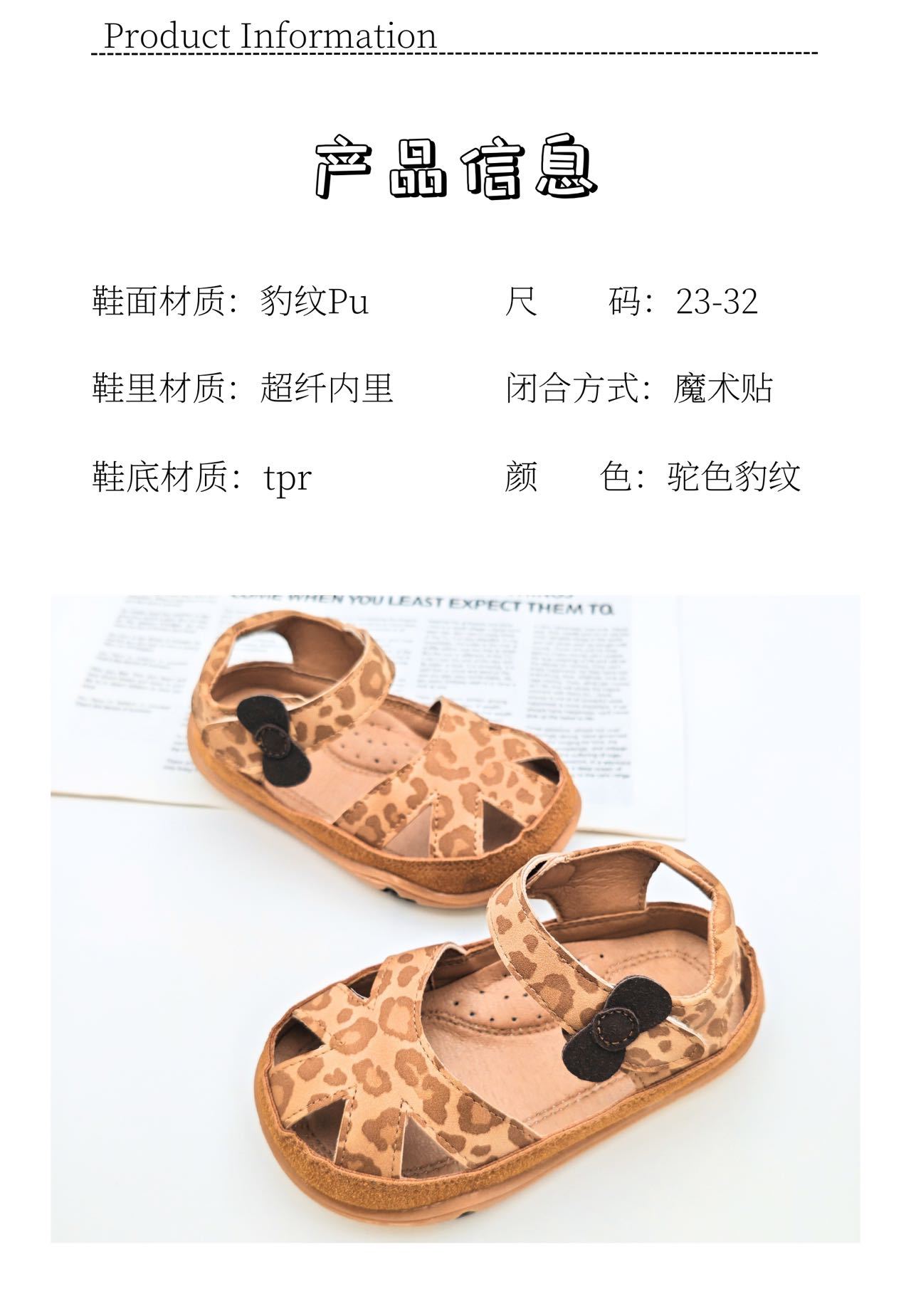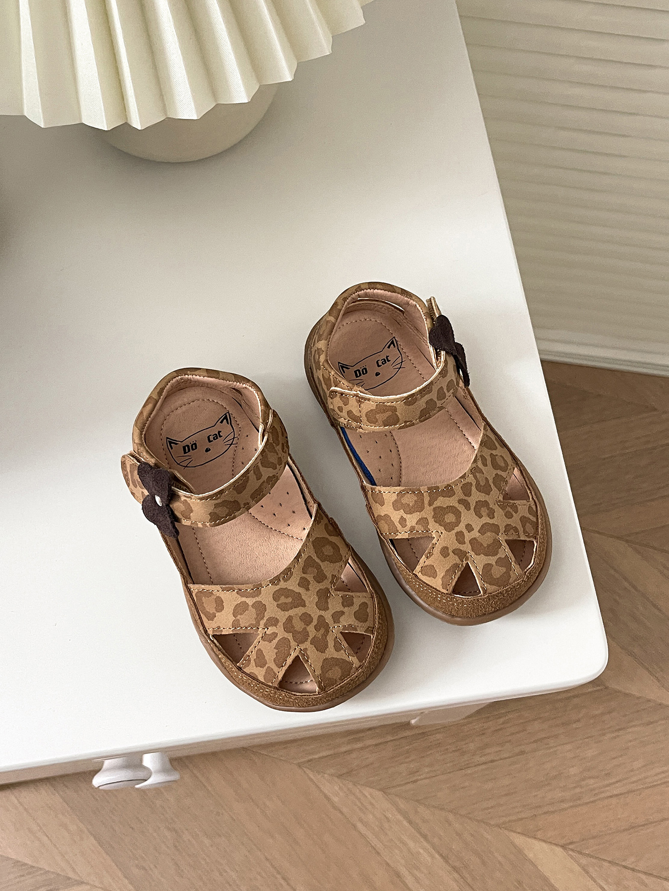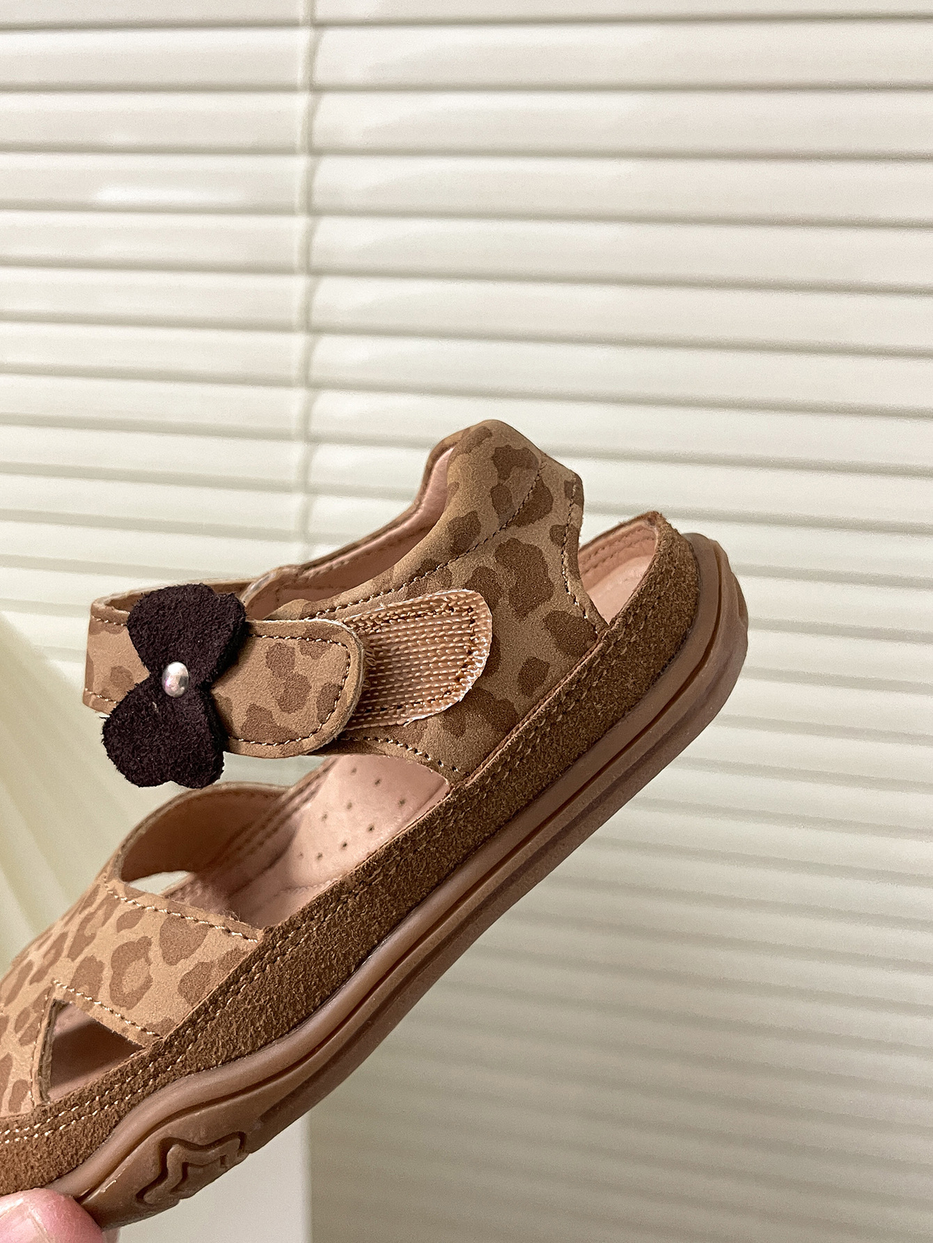 2025년 새로운 여름 스타일의 카멜 레오파드 프린트 중공 발가락 샌들, 소년 소녀 모두 착용 가능, 나비 벨크로스토어 가기