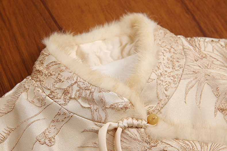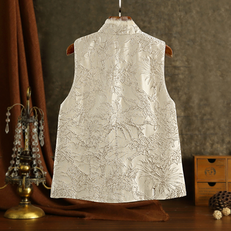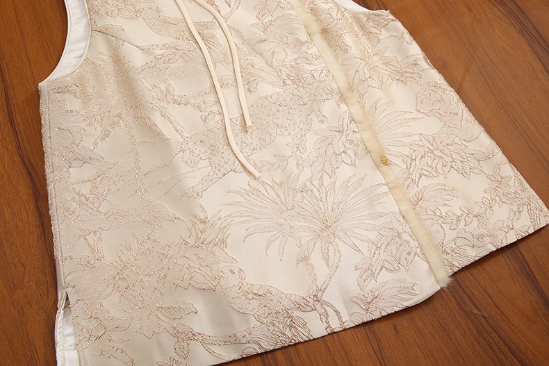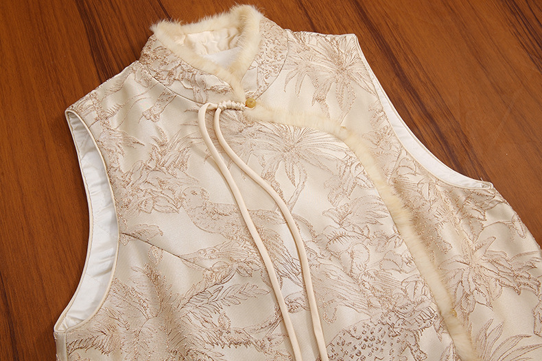2025 가을, 겨울 국가 스타일 새로운 중국 스타일 기울어 진 옷깃 술 버클 레이온 자카드 밍크 모피 조끼 여성을위한 고급 레이어드 조끼