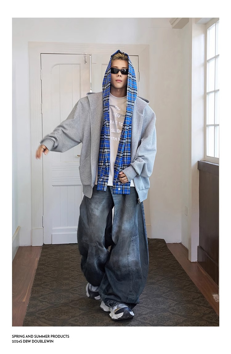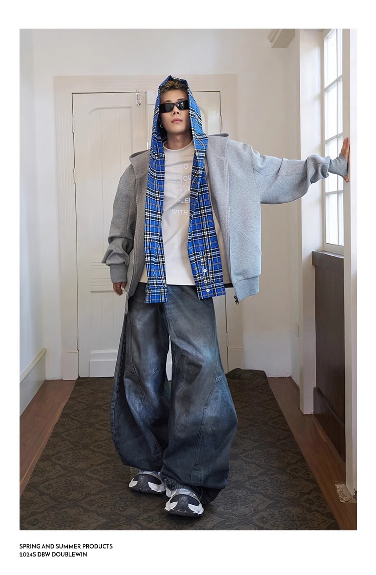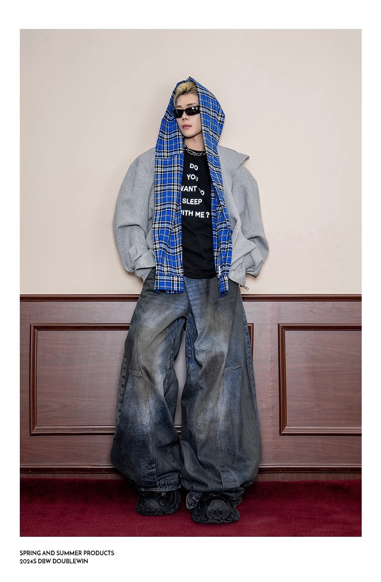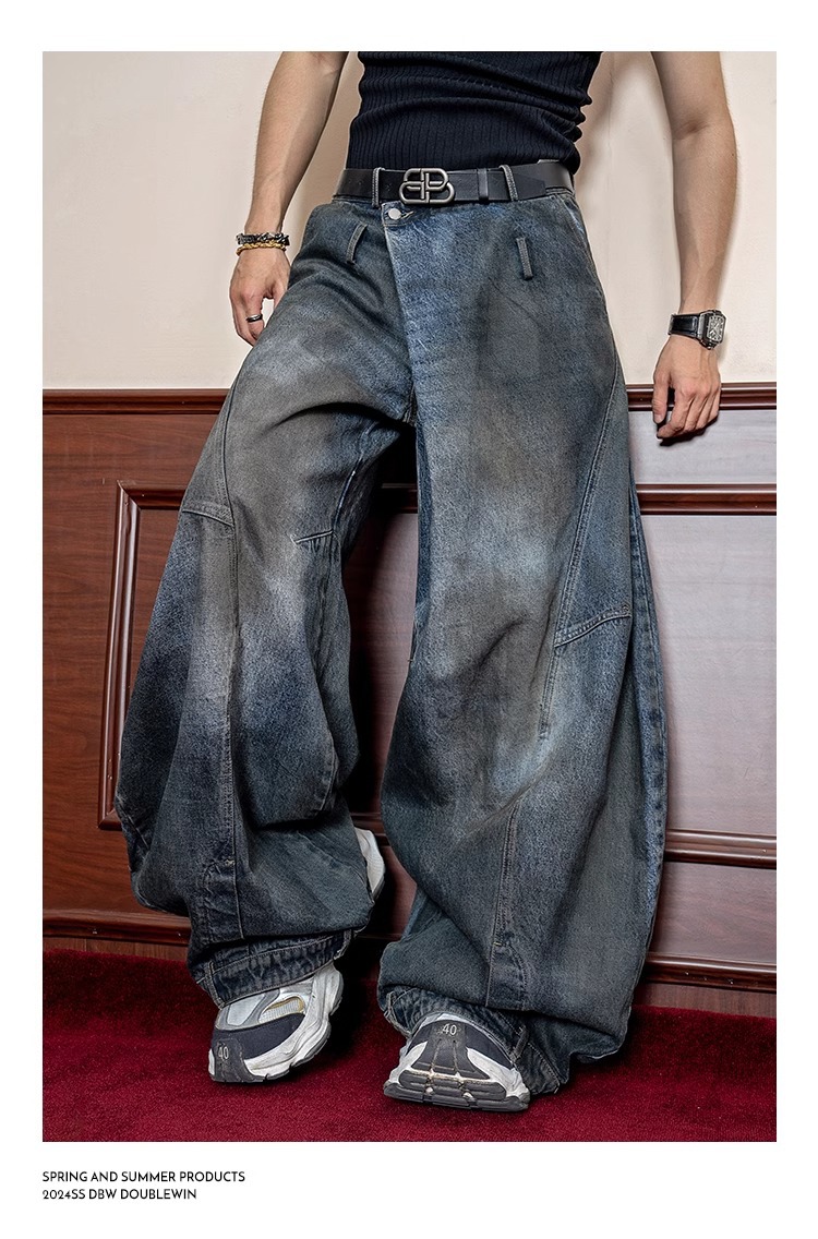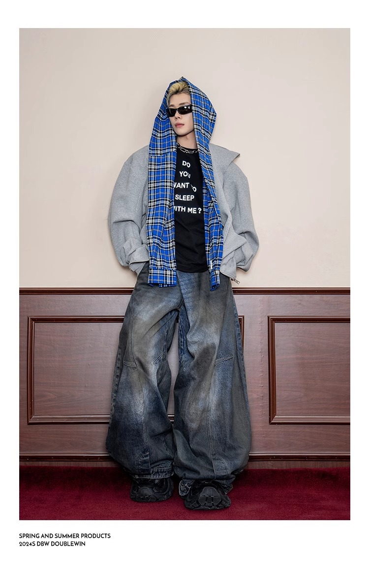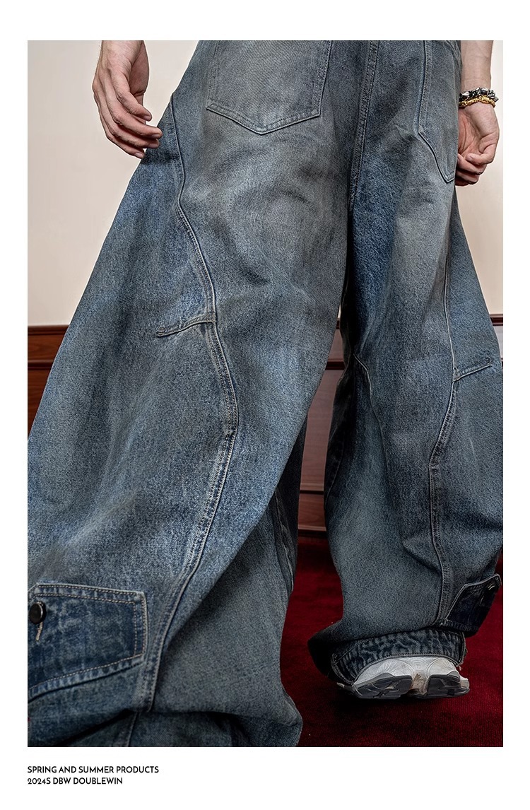 거리 고민 컬러 청바지 남자의 2024 가을 새로운 느슨한 디자인 감각 허리 넓은 다리 긴 바지스토어 가기